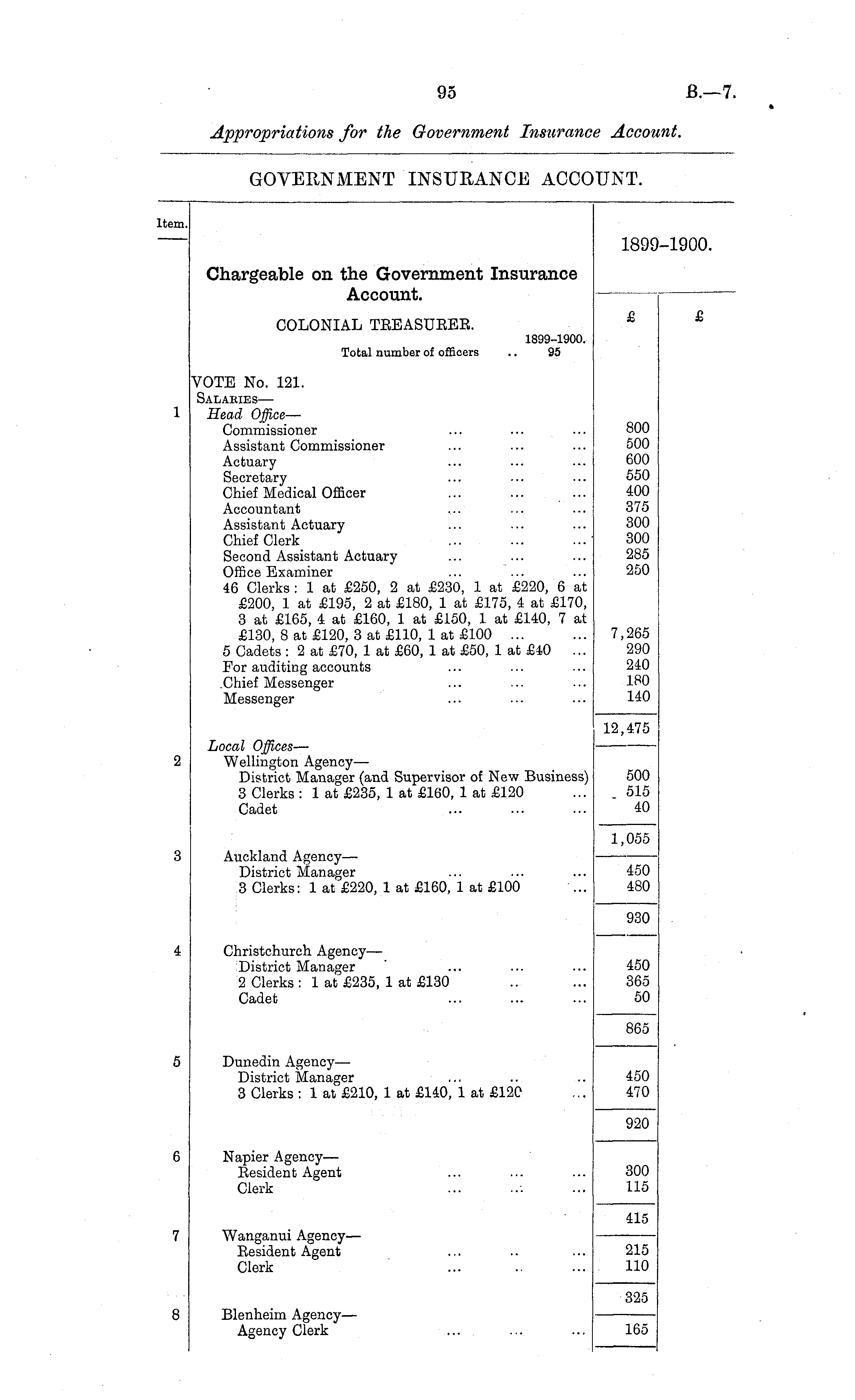 ;em. 1899-1900 Chargeable on the Government Insurance Account. COLONIAL TBEASUEEE. 1899-1900. Total number of officers .. 95 VOTE No. 121. Salaries— Head Office — Commissioner Assistant Commissioner Actuary Secretary Chief Medical Officer ... ... ... Accountant Assistant Actuary Chief Clerk Second Assistant Actuary Office Examiner 46 Clerks : 1 at £250, 2 at £230, 1 at £220, 6 at £200, 1 at £195, 2 at £180, 1 at £175, 4 at £170, 3 at £165, 4 at £160, 1 at £150, 1 at £140, 7 at £130, 8 at £120, 3 at £110, 1 at £100 ... 5 Cadets : 2 at £70, 1 at £60, 1 at £50, 1 at £40 ... For auditing accounts .Chief Messenger Messenger 800 500 600 550 400 375 300 300 285 250 7,265 290 240 180 140 Local Offices — Wellington Agency— District Manager (and Supervisor of New Business) 3 Clerks : 1 at £235, 1 at £160, 1 at £120 Cadet 12,475 500 515 40 Auckland Agency— District Manager 3 Clerks: 1 at £220, 1 at £160, 1 at £100 1,055 450 480 930 Christchurch Agency— District Manager 2 Clerks : 1 at £235, 1 at £130 Cadet 450 365 50 865 Dunedin Agency— District Manager 3 Clerks : 1 at £210, 1 at £140, 1 at £120 450 470 920 Napier Agency — Eesident Agent Clerk 300 115 415 Wanganui Agency — Eesident Agent Clerk ... 215 110 Blenheim Agency — Agency Clerk 325 8 165