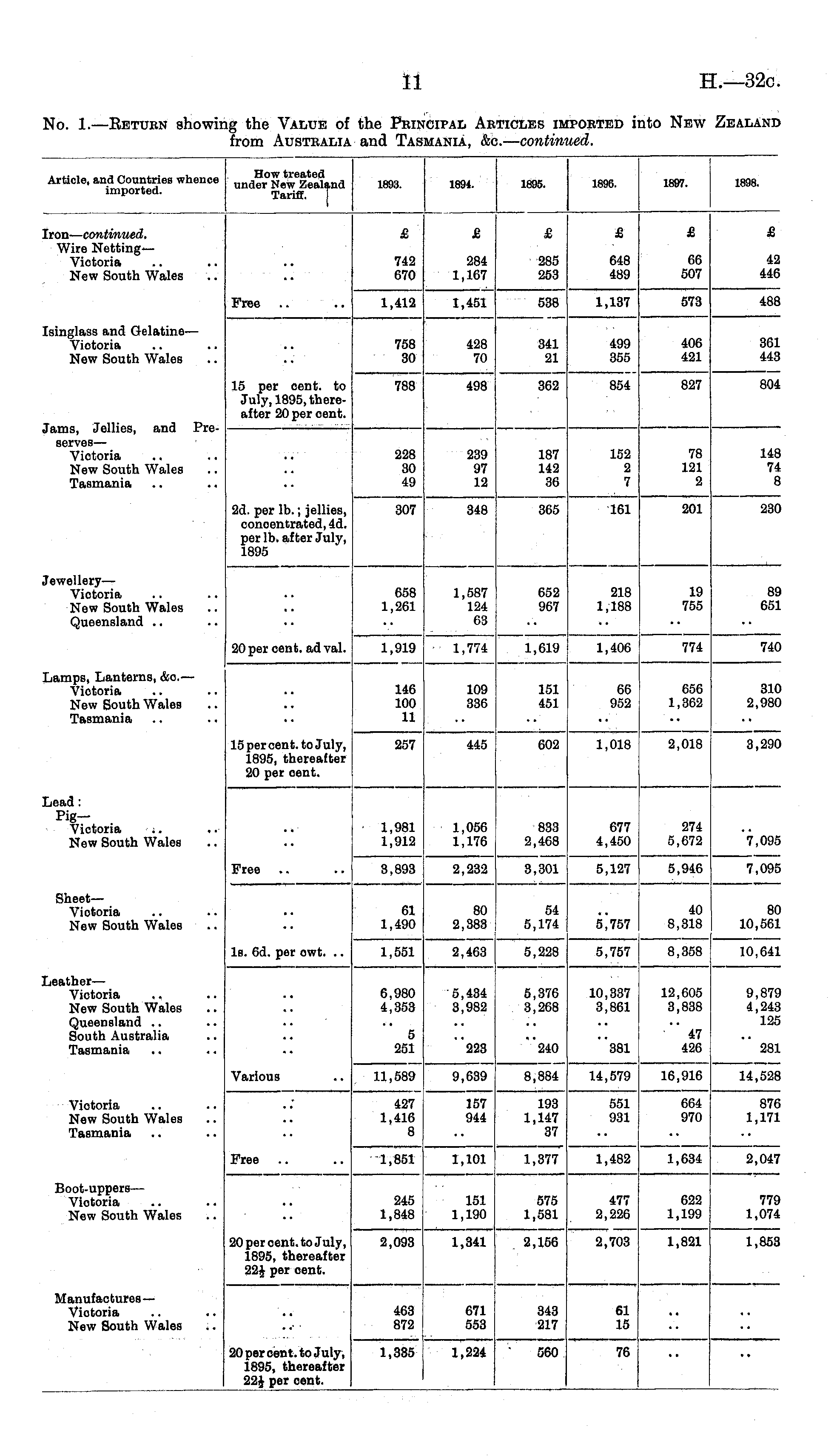 Article, and Countries whence imported. How treated under New Zealand Tariff. 1893. 1894. 1895. 1896. 1897. 1898. iron— continued. Wire NettingVictoria New South Wales £ 742 670 £ 284 1,167 £ 285 253 £ 648 489 £ 66 507 £ 42 446 Free 1,412 1,451 538 1,137 573 488 Isinglass and Gelatine— Victoria New South Wales 758 30 428 70 341 21 499 355 406 421 861 443 15 per oent. to July, 1895, thereafter 20 per oent. 788 498 362 854 827 804 fams, Jellies, and Pi serves — Victoria New South Wales Tasmania »re228 30 49 239 97 12 187 142 36 152 2 7 78 121 2 148 74 8 2d. per lb.; jellies, conoentrated, 4d. per lb. after July, 1895 201 230 307 348 365 161 fewellery— Victoria New South Wales Queensland .. 658 1,261 1,587 124 63 652 967 218 1,188 19 755 89 651 20 per oent. ad val. 774 740 1,919 1,774 1,619 1,406 Liamps, Lanterns, &c. — Victoria New South WaleB Tasmania 146 100 11 109 336 151 451 66 952 656 1,362 310 2,980 15 per oent. to July, 1895, thereafter 20 per cent. 257 445 602 1,018 2,018 3,290 jead : PigViotona 1. New South Wales Free 1,981 1,912 1,056 1,176 833 2,468 677 4,450 5,127 274 5,672 5,946 7,095 7,095 Sheet— Viotoria New South Wales 3,893 2,232 3,301 61 1,490 80 2,383 54 5,174 5\757 40 8,318 80 10,561 10,641 Is. 6d. per cwt. .. 1,551 2,463 5,228 5,757 8,358 lieather — Viotoria New South Wales Queensland .. South Australia Tasmania 6,980 4,353 5,434 3,982 5,376 3,268 10,337 3,861 12,605 3,838 9,879 4,243 125 5 251 "223 "240 "381 47 426 281 Various 11,589 9,639 8,884 14,579 16,916 14,528 Viotoria New South Wales Tasmania 427 1,416 8 157 944 193 1,147 37 551 931 664 970 876 1,171 Free 1,634 2,047 1,851 1,101 1,377 1,482 Boot-uppers— Viotoria New South Wales 245 1,848 2,093 151 1,190 1,341 575 1,581 2,156 477 2,226 2,703 622 1,199 779 1,074 20 per oent. to July, 1895, thereafter 22} per oent. 1,821 1,853 Manufactures— Viotoria New South Wales 463 872 671 553 343 217 61 15 20 per oent. to July, 1895, thereafter 22} per cent. 1,335 1,224 560 76