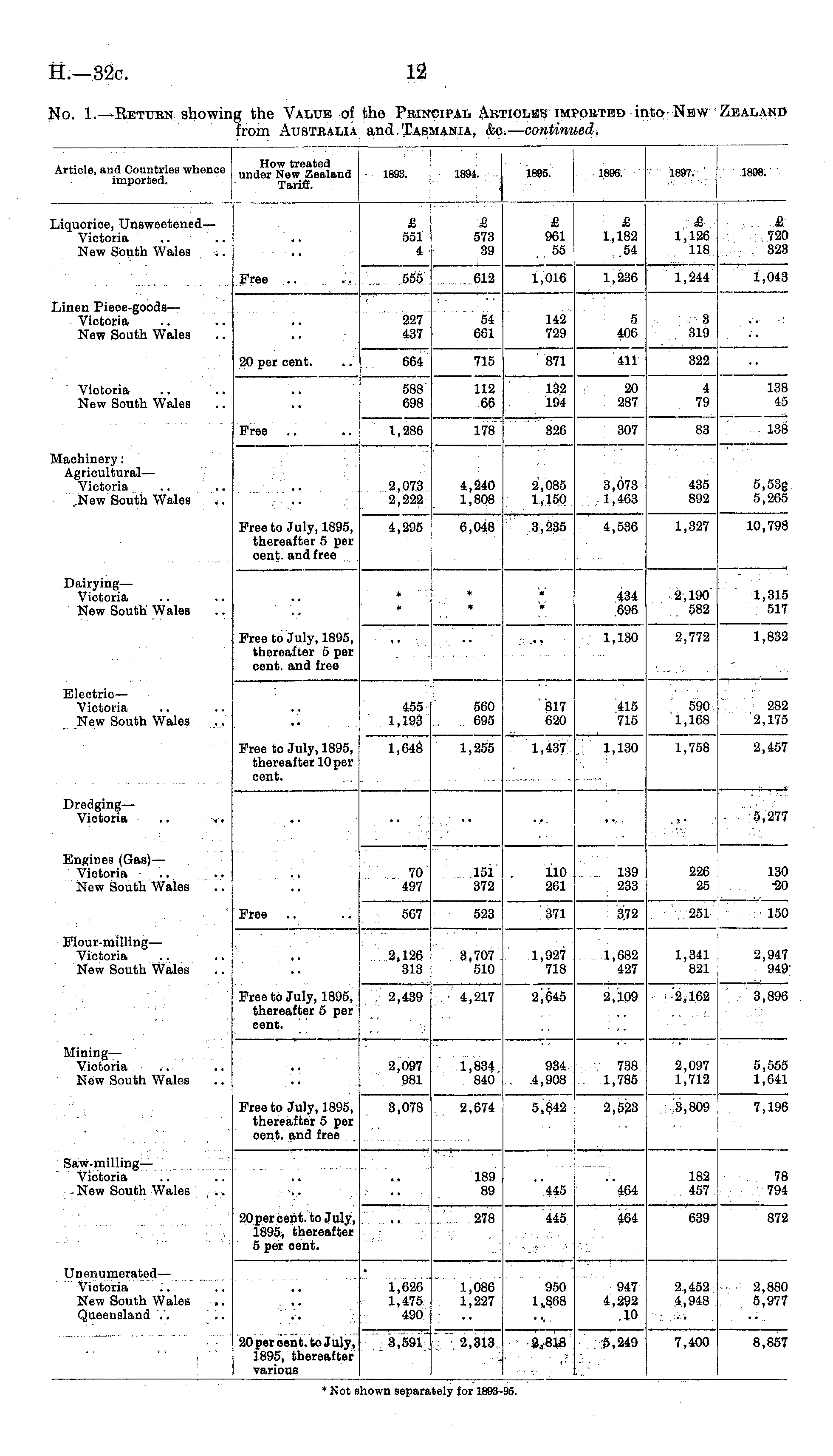 Article, and Countries whence imported. How treated under New Zealand Tariff. 1893. 1894. 1895. 1896. 1897. 1898. Liquorice, Unsweetened — Victoria New South Wales £ 551 4 £ 573 39 ,612 £ 961 55 £ 1,182 54 1,236 £ 1,126 118 720 323 Free 555 1,016 1,244 1,043 Linen Pieoe-goods— Victoria New South Wales 227 437 54 661 142 729 5 406 3 319 20 per oent. 664 715 871 411 322 Victoria New South Wales 588 698 112 66 132 194 20 287 4 79 138 45 Free 178 326 307 83 138 1,286 Maohinery: Agricultural— Victoria .. ,New South Wales 2,073 2,222 4,240 1,808 2,085 1,150 3,073 1,463 435 892 5,53g 5,265 Free to July, 1895, thereafter 5 per cent, and free 4,295 6,048 3,235 4,536 1,327 10,798 Dairying— Viotoria New South Wales * * * * * 434 696 2,190 582 1,315 517 * Free to July, 1895, thereafter 5 per cent, and free 1,130 2,772 1,832 Electric— Victoria New South Wales 455 1,193 1,648 560 695 '817 620 415 715 590 1,168 282 2,175 Free to July, 1895, thereafter 10 per oent. 1,255 1,437 1,130 1,758 2,457 Dredging— Victoria . . t • Engines (Gas) — Viotoria New South Wales 70 497 151 372 110 261 139 233 226 25 130 -20 Free 371 372 251 150 567 523 Flour-milling— Victoria New South Wales 2,126 313 3,707 510 1,927 718 1,682 427 1,341 821 2,947 949 Free to July, 1895, thereafter 5 per oent. 2,439 4,217 2,645 2,109 -2,162 3,896 Mining— Victoria New South Wales 2,097 981 1,834 840 934 4,908 V 738 1,785 2,097 1,712 5,555 1,641 Free to July, 1895, thereafter 5 per oent. and free 3,078 2,674 5,842 2,523 3,809 7,196 Saw-milling— Viotoria - New South Wales 189 89 "445 "464 464 182 457 78 794 20 per oent. to July, 1895, thereafter 5 per oent. .'.. 278 445 639 872 Unenumerated — Viotoria New South Wales ,. Queensland .. 1,626 1,475 490 1,086 1,227 950 1,868 947 4,292 10 2,452 4,948 2,880 5,977 20 per oent. to July, 1895, thereafter various 5,249 7,400 8,857 '3,591- ". 2,313 2,818 * Not shown separate!; for 1893-95.