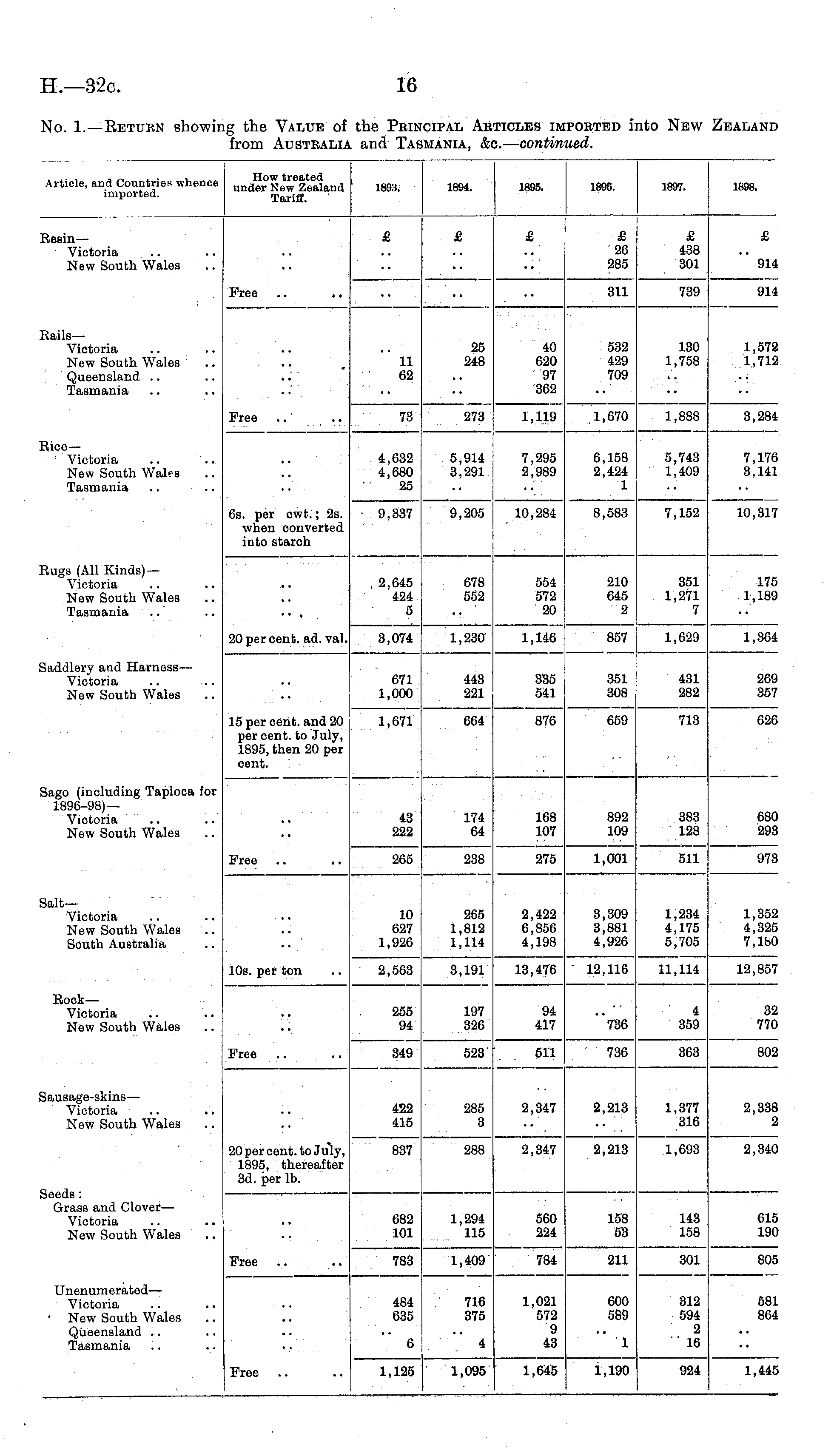 Article, and Countries whence Zealand imported. Tariff 1893. 1894. 1895. 1896. 1897. 1898. lesin — Victoria New South Wales £ £ £ £ 26 285 £ 438 301 £ 914 Free 311 739 914 tails — Victoria New South Wales Queensland Tasmania 11 62 25 248 40 620 97 362 532 429 709 130 1,758 1,572 1,712 Free 73 273 1,119 1,670 1,888 3,284 lice— Victoria New South Wales Tasmania 4,632 4,680 25 5,914 3,291 7,295 2,989 6,158 2,424 1 5,743 1,409 7,176 3,141 6s. per cwfc.; 2s. when converted into starch 9,337 9,205 10,284 8,583 7,152 10,317 tugs (All Kinds)— Victoria New South Wales Tasmania 2,645 424 5 678 552 554 572 20 210 645 2 351 1,271 7 175 1,189 20 per cent. ad. val. 3,074 1,230 1,146 857 1,629 1,364 laddlery and Harness— Victoria New South Wales 671 1,000 443 221 335 541 351 308 431 282 269 357 15 per cent, and 20 per cent, to July, 1895,then 20 per cent. 1,671 664 876 659 713 626 Sago (including Tapioca for 1896-98)— Victoria New South Wales 168 107 275 680 293 43 222 174 64 892 109 1,001 383 128 511 Free 265 238 973 lalt— Victoria New South Wales South Australia 10 627 1,926 2,563 265 1,812 1,114 3,191 2,422 6,856 4,198 13,476 3,309 3,881 4,926 1,234 4,175 5,705 1,352 4,325 7,lb0 10s. per ton 12,116 11,114 12,857 RockVictoria New South Wales 255 94 197 326 94 417 4 359 32 770 "736 Free 349 523 511 736 363 802 iausage-skins— Victoria New South Wales 422 415 285 3 2,347 2,213 1,377 316 2,338 2 20 per cent, to July, 1895, thereafter 3d. per lb. 837 288 2,347 2,213 1,693 2,340 Seeds : Grass and Clover — Victoria New South Wales 1,294 115 560 224 158 53 143 158 615 190 682 101 Free .. 783 1,409 784 211 301 805 Unenumerated — Victoria • New South Wales Queensland Tasmania '.. 484 635 716 375 1,021 572 9 43 600 589 312 594 2 " 16 581 864 6 4 1 Free 1,125 1,095 1,645 1,190 924 1,445