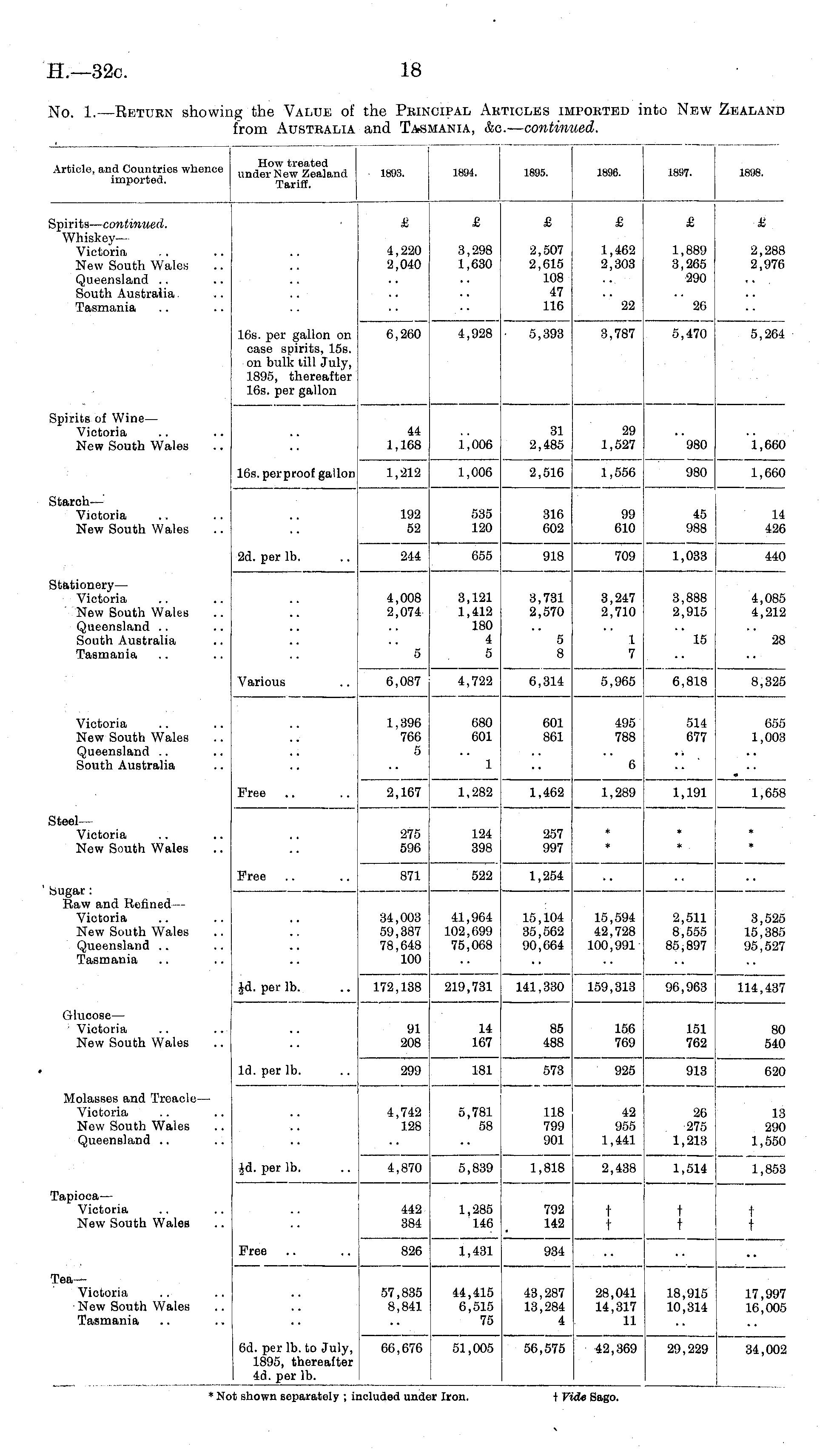 Article, and Countries whence lm imported. Tarifl] 1894. 1895. 1896. 1897. 1898. Spirits— continued. WhiskeyVictoria New South Wales Queensland .. South Australia Tasmania £ £ £ £ £ £ 4,220 2,040 3,298 1,630 2,507 2,615 108 47 116 1,462 2,303 1,889 3,265 290 2,288 2,976 22 26 16s. per gallon on ease spirits, 15s. on bulk till July, 1895, thereafter 16s. per gallon 6,260 4,928 5,393 3,787 5,470 5,264 Spirits of Wine— Victoria New South Wales 44 1,168 31 2,485 29 1,527 980 1,660 i^006 16s. perproof gallon 1,212 1,006 2,516 1,556 980 1,660 Starch — Viotoria New South Wales 192 52 535 120 316 602 99 610 45 988 14 426 2d. per lb. 244 655 918 709 1,033 440 Stationery— Victoria New South Wales Queensland .. South Australia Tasmania 4,008 2,074 3,121 1,412 180 4 5 3,731 2,570 3,247 2,710 3,888 2,915 4,085 4,212 5 8 1 7 15 28 5 Various 6,087 4,722 6,314 5,965 6,818 8,325 I Victoria New South Wales Queensland .. South Australia 1,396 766 5 680 601 601 861 495 788 514 677 655 1,003 1 6 Free 2,167 1,282 1,462 1,289 1,191 1,658 iteel— Victoria New South Wales 275 596 124 398 257 997 * * * * Free 871 522 iiirro.i* • 1,254 Raw and Refined — Victoria New South Wales Queensland Tasmania 34,003 59,387 78,648 100 41,964 102,699 75,068 15,104 35,562 90,664 15,594 42,728 100,991 2,511 8,555 85,897 3,525 15,385 95,527 Jd. per lb. 172,138 Glucose— Victoria New South Wales 219,731 141,330 159,313 96,963 114,437 91 i 208 14 167 85 488 156 i 769 I 151 762 80 540 Id. per lb. 299 181 573 925 913 620 Molasses and Treacle— Victoria New South Wales Queensland 4,742 128 5,781 58 118 799 901 42 955 1,441 I 26 275 1,213 1,514 13 290 1,550 i<3. per lb. 4,870 5,839 1,818 2,438 1,853 Tapioca— Victoria New South Wales 442 384 1,285 146 1,431 792 142 t t t t t t Free 826 934 i i .. .. TeaVictoria New South Wales Tasmania 57,835 8,841 44,415 6,515 75 43,287 13,284 4 28,041 14,317 11 18,915 10,314 17,997 16,005 6d. per lb. to July, 1895, thereafter 4d. per lb. 66,676 51,005 56,575 42,369 29,229 34,002 *Noi shown separately ; included under Iron. t Vide Sago.