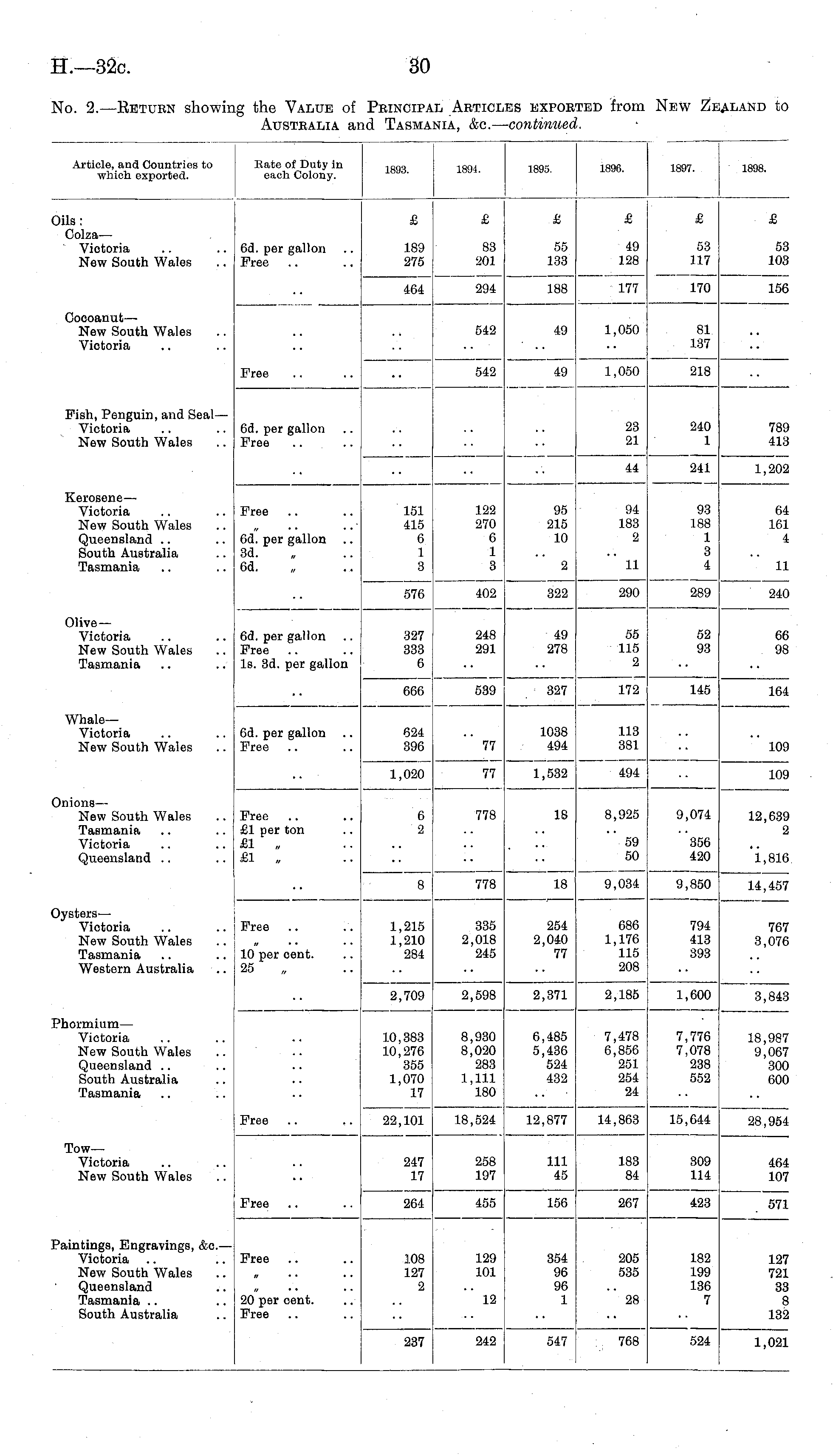 Article, and Countries to which exported. Rate of Duty in each Colony. 1893. 1894. 1895. 1896. 1897. 1898. )ils: Colza— Viotoria New South Wales 6d. per gallon Free .. £ 189 275 £ 83 201 £ 55 133 £ 49 128 £ 53 117 £ 53 103 188 177 170 156 464 294 Cocoanut — New South Wales Viotoria 542 49 1,050 81 137 Free 542 49 1,050 218 Fish, Penguin, and Seal— Viotoria New South Wales 6d. per gallon Free 23 21 240 1 789 413 44 241 1,202 Kerosene — Viotoria New South Wales Queensland South Australia Tasmania Free .. 6d. per gallon 3d. 6d. 151 415 6 1 3 122 270 6 1 3 95 215 10 94 183 2 93 188 1 3 4 64 161 4 2 11 11 576 402 322 290 289 240 Olive — Viotoria New South Wales Tasmania 6d. per gallon Free Is. 3d. per gallon 327 333 6 248 291 49 278 55 115 2 52 93 66 98 164 666 539 327 172 145 Whale— Viotoria New South Wales 6d. per gallon Free .. 624 396 1038 494 113 381 77 109 1,020 77 1,532 494 109 }mons — New South Wales Tasmania Viotoria Queenslaod .. Free £1 per ton £1 „ SX „ 6 2 778 18 8,925 9,074 356 420 12,639 2 59 50 'i,816 8 778 18 9,034 9,850 14,457 )ysters>— Viotoria New South Wales Tasmania Western Australia Free .. 10 per cent. 25 1,215 1,210 284 335 2,018 245 254 2,040 77 686 1,176 115 208 794 413 393 767 3,076 2,709 2,598 2,185 3,843 2,371 1,600 3 bormium— Victoria New South Wales Queensland South Australia Tasmania 10,383 10,276 355 1,070 17 8,930 8,020 283 1,111 180 6,485 5,436 524 432 7,478 6,856 251 254 24 7,776 7,078 238 552 18,987 9,067 300 600 Free 22,101 18,524 12,877 14,863 15,644 28,954 Tow— Viotoria New South Wales 247 17 258 197 111 45 183 84 309 114 464 107 Free 264 455 156 267 423 571 D aintings, Engravings, &o. — Viotoria New South Wales Queensland Tasmania South Australia Free .. 108 127 2 129 101 354 96 96 1 205 535 182 199 136 7 127 721 33 8 132 20 per cent. Free .. 12 28 237 242 547 768 524 1,021