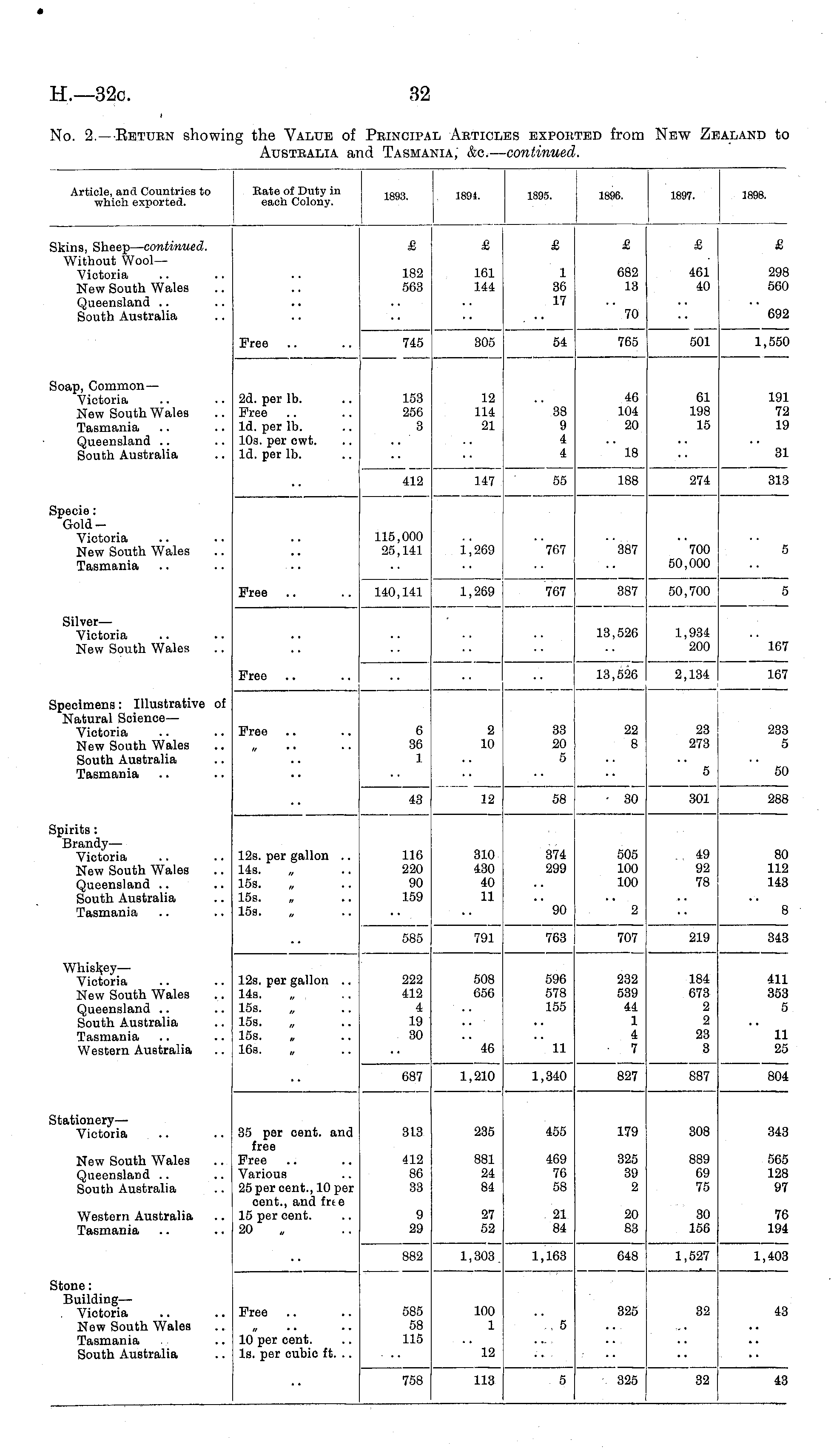 Article, and Countries to which exported. Kate of Duty in each Colony. 1893. 1894. 1895. 1896. 1897. 1898. Skins, Sheep— continued. Without WoolVictoria New South Wales Queensland South Australia £ £ £ £ & £ 182 563 161 144 1 36 17 682 13 461 40 298 560 70 692 Free 745 305 54 765 501 1,550 !oap, Common — Victoria New South Wales Tasmania Queensland South Australia 2d. per lb. Free Id. per lb. 10a. per cwt. Id. per lb. 153 256 3 12 114 21 38 9 4 4 46 104 20 61 198 15 191 72 19 18 31 412 147 55 188 274 313 Specie: GoldVictoria New South Wales Tasmania 115,000 25,141 1,269 767 "387 "700 50,000 5 Free 140,141 1,269 767 387 50,700 5 SilverVictoria New South Wales 13,526 1,934 200 167 Free 13,526 2,134 167 Specimens: Illustrative of Natural Science — Victoria New South Wales South Australia Tasmania Free 6 36 1 2 10 33 20 5 22 8 23 273 233 5 5 50 43 12 58 30 301 288 Spirits : Brandy— Victoria New South Wales Queensland South Australia Tasmania 12s. per gallon .. 14s. 15s. 15s. 15s. 116 220 90 159 310 430 40 11 374 299 505 100 100 49 92 78 80 112 143 90 2 8 707 219 343 585 791 763 Whiskey— Victoria New South Wales Queensland South Australia Tasmania Western Australia 12s. per gallon .. 14s. 15s. 15s. 15s. 16s. 222 412 4 19 30 508 656 596 578 155 232 539 44 1 4 7 184 673 2 2 23 3 411 353 5 46 11 11 25 804 687 1,210 1,340 827 887 Stationery— Victoria 35 p8r cent, and free Free Various 25 per cent., 10 per cent., and frte 15 per cent. 20 313 235 455 179 308 343 New South Wales Queensland South Australia 412 86 33 881 24 84 469 76 58 325 39 2 889 69 75 565 128 97 Western Australia Tasmania 9 29 27 52 21 84 20 83 30 156 76 194 Stone: BuildingVictoria New South Wales Tasmania South Australia 882 1,303. 1,163 648 1,527 1,403 325 32 43 Free 585 58 115 100 1 10 per cent. Is. per cubic ft. .. 5 12 758 113 5 325 32 43
