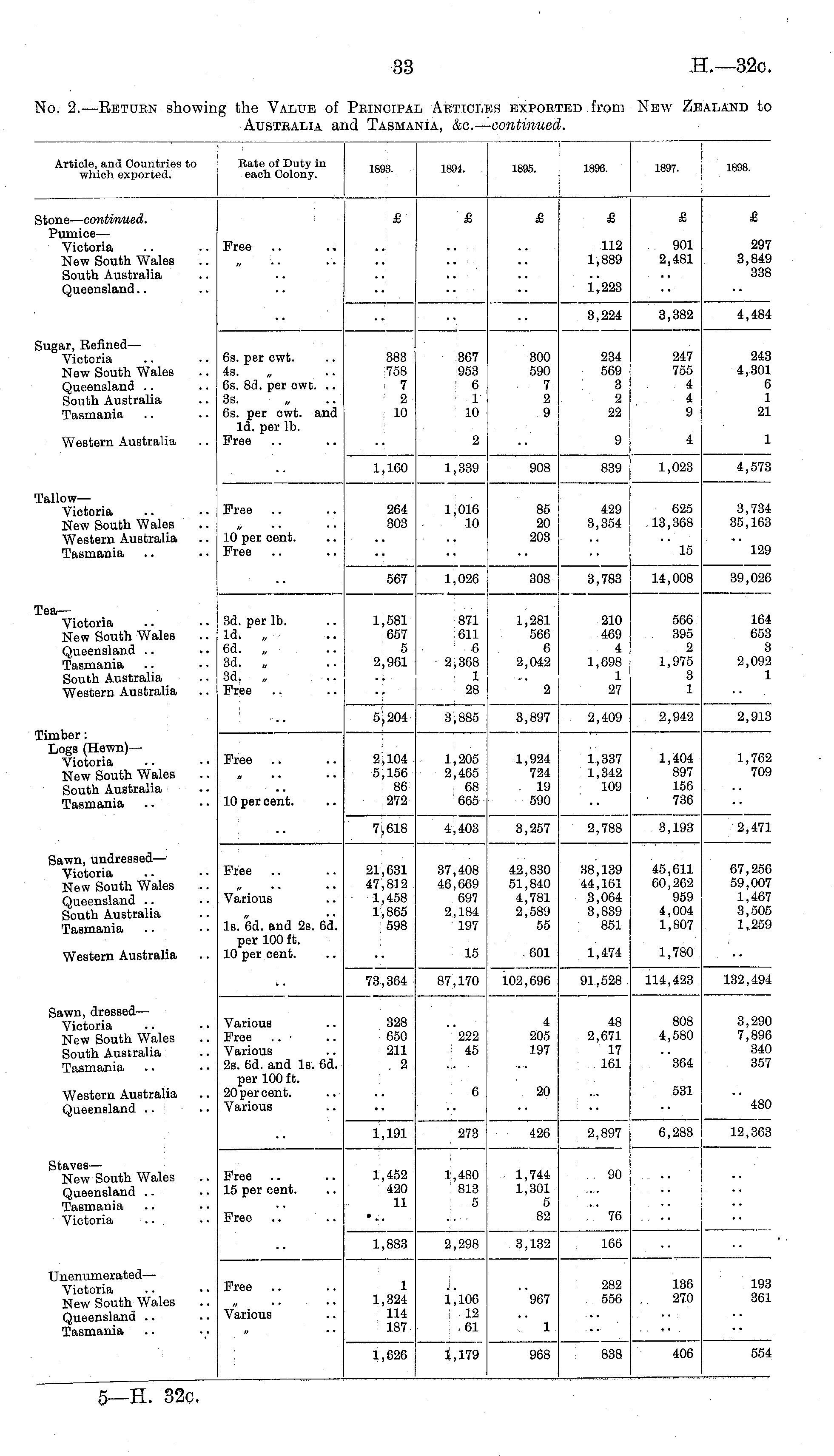 Article, and Countries to which exported. Rate of Duty in each Colony. 1893. 1891. 1895. 1896. 1897. 1898. Stone — continued. Pumice — Victoria New South Wales South Australia Queensland.. & & & & £ £ Free 112 1,889 . 901 2,481 297 3,849 338 1,223 lugar, Refined — Victoria New South Wales Queensland .. South Australia Tasmania 3,224 3,382 4,484 6s. per owt. 4s. 6s. 8d. per owe. .. 3s. 6s. per owt. and Id. per lb. Free 383 758 7 2 10 367 ■953 6 1 10 300 590 7 2 9 234 569 3 2 22 247 755 4 4 9 243 4,301 6 1 21 Western Australia 2 9 4 1 1,160 1,339 908 839 1,023 4,573 — Victoria New South Wales Western Australia Tasmania Free 10 per cent. Free 264 303 1,016 10 85 20 203 429 3,354 625 13,368 3,734 35,163 15 129 567 1,026 308 3,783 14,008 39,026 )ea— Victoria New South Wales Queensland .. Tasmania South Australia Western Australia 3d. per lb. Id. „ 6d. „ 3d. „ 3d. „ Free 1,581 657 5 2,961 871 611 6 2,368 1 28 1,281 566 6 2,042 210 469 4 1,698 1 27 566 395 2 1,975 3 1 164 653 3 2,092 1 5,204 2 3,885 3,897 2,409 2,942 2,913 timber: Logs (Hewn)— Victoria New South Wales South Australia Tasmania Free .. 2,104 . 5,156 86 272 1,205 2,465 68 665 1,924 724 19 590 1,337 1,342 109 1,404 897 156 736 1,762 709 10 per cent. 7>618 4,403 3,257 2,788 3,193 2,471 Sawn, undressed — Victoria New South Wales Queensland .. South Australia Tasmania Free Various 21,631 47,812 1,458 1,865 598 37,408 46,669 697 2,184 197 42,830 51,840 4,781 2,589 55 88,139 44,161 .3,064 3,839 851 45,611 60,262 959 4,004 1,807 67,256 59,007 1,467 3,505 1,259 Is. 6d. and 2s. 6d. per 100 ft. 10 per cent. 15 601 1,474 1,780 Western Australia 73,364 87,170 102,696 91,528 114,423 132,494 Sawn, dressed — Victoria New South Wales South Australia Tasmania Various Free .. • Various 2s. 6d. and Is. 6d. per 100 ft. 20 per cent. Various 328 650 211 2 222 45 4 205 197 48 2,671 17 161 808 4,580 3,290 7,896 340 357 "364 Western Australia Queensland .. 6 20 531 480 1,191 273 426 2,897 6,283 12,363 Staves — New South Wales Queensland .. Tasmania Victoria Free 15 per cent. 1,452 420 11 1,480 813 5 1,744 1,301 5 82 90 Free .. • t t 76 1,883 2,298 3,132 166 Unemimerated — Victoria New South Wales Queensland .. Tasmania Free 1 1,324 114 187 1,106 12 . 61 "967 282 556 136 2Y0 193 361 Various 1 1,626 1,179 968 838 406 554