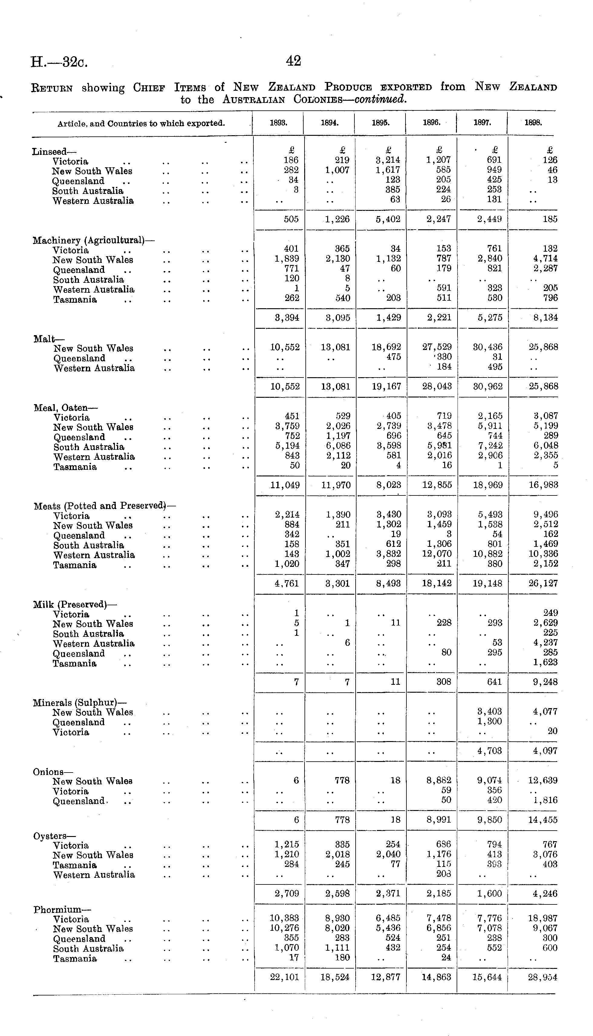 Article, and Countries to which exported. 1893. 1891. 1895. 1896. 1897. 1898. Linseed— Victoria New South Wales Queensland South Australia Western Australia £ 186 282 34 3 £ 219 1,007 M 3,214 1,617 123 385 63 £ 1,207 585 205 224 26 £ 691 949 425 253 131 £ 126 46 13 505 1,226 5,402 2,247 2,449 185 Machinery (Agricultural) — Victoria New South Wales Queensland South Australia Western Australia Tasmania 401 1,839 771 120 1 262 365 2,130 47 8 5 540 34 1,132 60 153 787 179 761 2,840 821 132 4,714 2,287 203 "591 511 "323 530 205 796 3,394 3,095 1,429 2,221 5,275 8,134 MaltNew South Wales Queensland Western Australia 10,552 13,081 18,692 475 27,529 •330 ■ 184 30,436 31 495 25,868 10,552 13,081 19,167 28,043 30,962 25,868 Meal, Oaten — Victoria New South Wales Queensland South Australia Western Australia Tasmania 451 3,759 752 5,194 843 50 529 2,026 1,197 6,086 2,112 20 405 2,739 696 3,598 581 4 719 3,478 645 5,981 2,016 16 2,165 5,911 744 7,242 2,906 1 3,087 5,199 289 6,048 2,355 5 11,049 11,970 8,023 12,855 18,969 16,983 Meats (Potted and Preserved)— Victoria New South Wales Queensland South Australia Western Australia Tasmania 2,214 884 342 158 143 1,020 1,390 211 351 1,002 347 3,430 1,302 19 612 3,832 298 3,093 1,459 3 1,306 12,070 211 5,493 1,538 54 801 10,882 380 9,496 2,512 162 1,469 10,336 2,152 4.761 3,301 8,493 18,142 19,148 26,127 Milk (Preserved) — Victoria New South Wales South Australia Western Australia Queensland Tasmania 1 5 1 1 11 228 293 249 2,629 225 4,237 285 1,623 9,248 6 53 295 80 11 308 641 Minerals (Sulphur)— New South Wales Queensland Victoria 3,403 1,300 4,077 20 4,703 4,097 Onions — New South Wales Victoria Queensland 6 778 18 8,882 59 50 9,074 356 420 12,639 1,816 14,455 Oysters— Victoria New South Wales Tasmania Western Australia 778 IS 8,991 9,850 1,215 1,210 284 335 2,018 245 254 2,040 77 686 1,176 115 203 794 413 393 767 3,076 403 Phormium — Victoria New South Wales Queensland South Australia Tasmania 2,709 2,598 2,371 2,185 1,600 4,246 10,383 j 10,276 ; 355 1,070 17 8,930 8,020 283 1,111 180 6,485 5,436 524 432 7,478 6,856 251 254 24 7,776 7,078 238 552 18,987 9,067 300 GOO 22,101 18,524 12,877 14,863 15,644 28,954