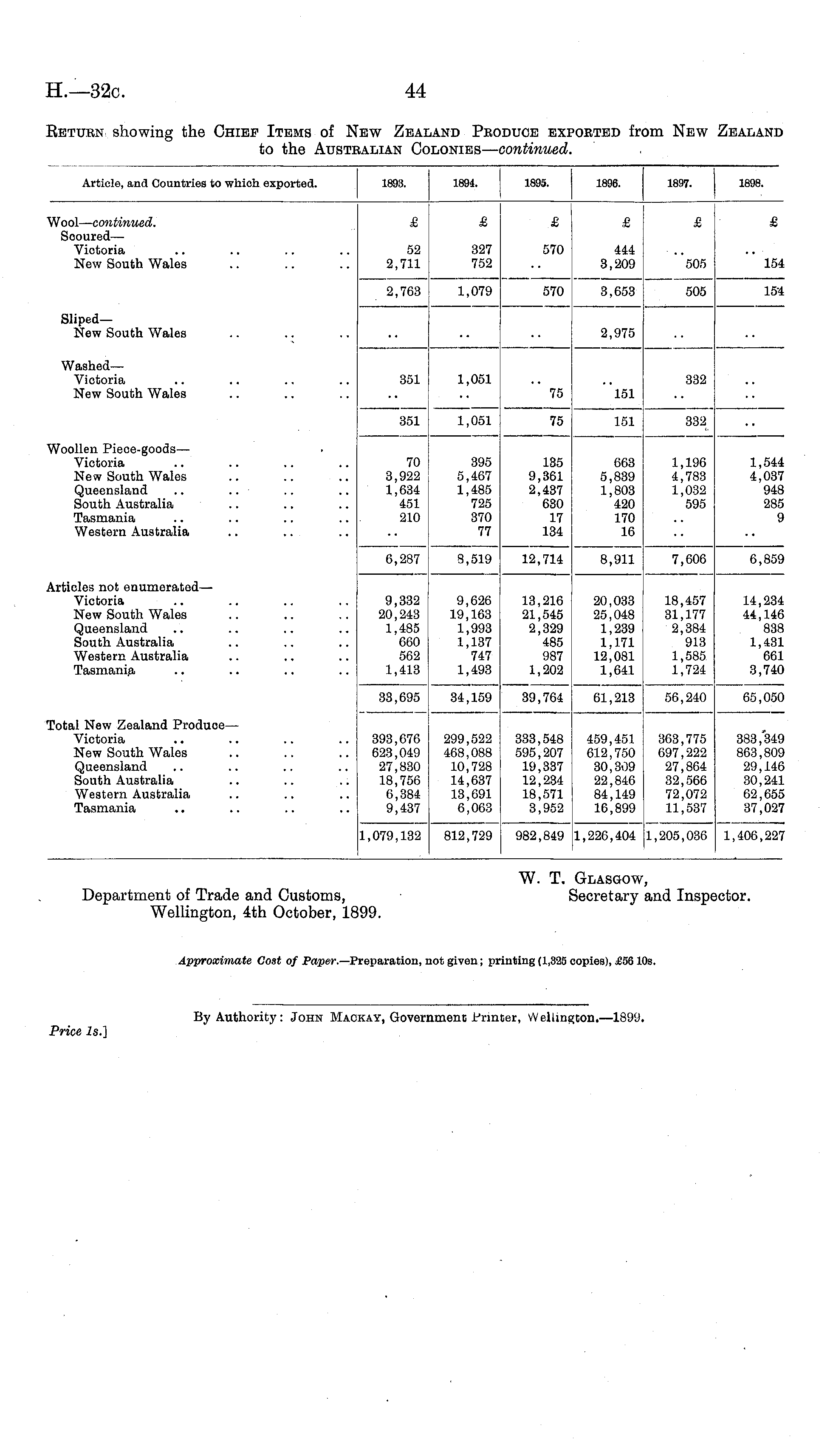W. T. Glasgow, Department of Trade and Customs, ■ Secretary and Inspector. Wellington, 4th October, 1899. Approximate Cost of Paper.— Preparation, not given; printing (1,325 copies), £56 10s.