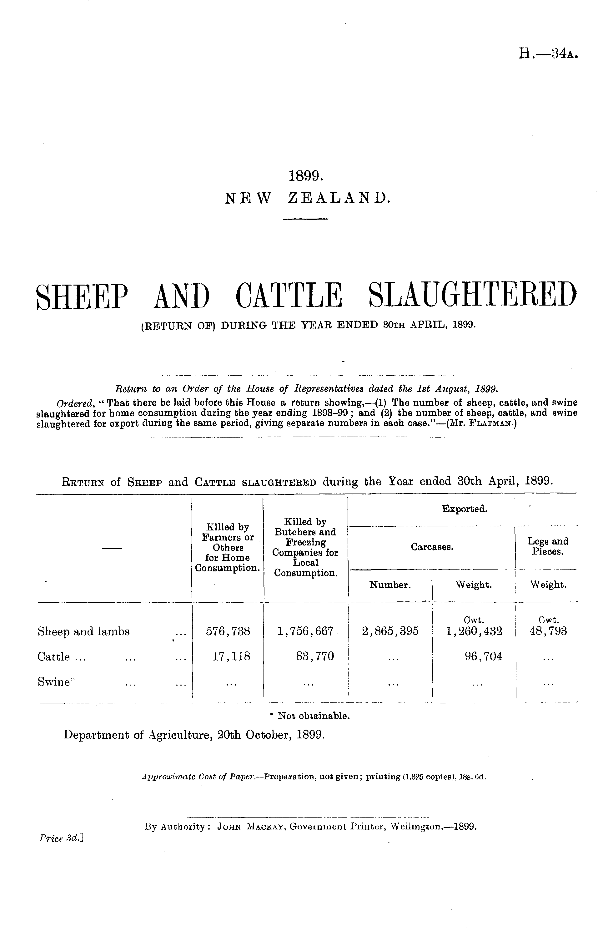 Return to an Order of the House of Representatives dated the Ist August, 1899. Ordered, " That there be laid before this House a return showing,—(l) The number of sheep, cattle, and swine slaughtered for home consumption during the year ending 1898-99 ; and (2) the number of sheep, cattle, and swine slaughtered for export during the same period, giving separate numbers in eaoh case."—(Mr. Flatman,)