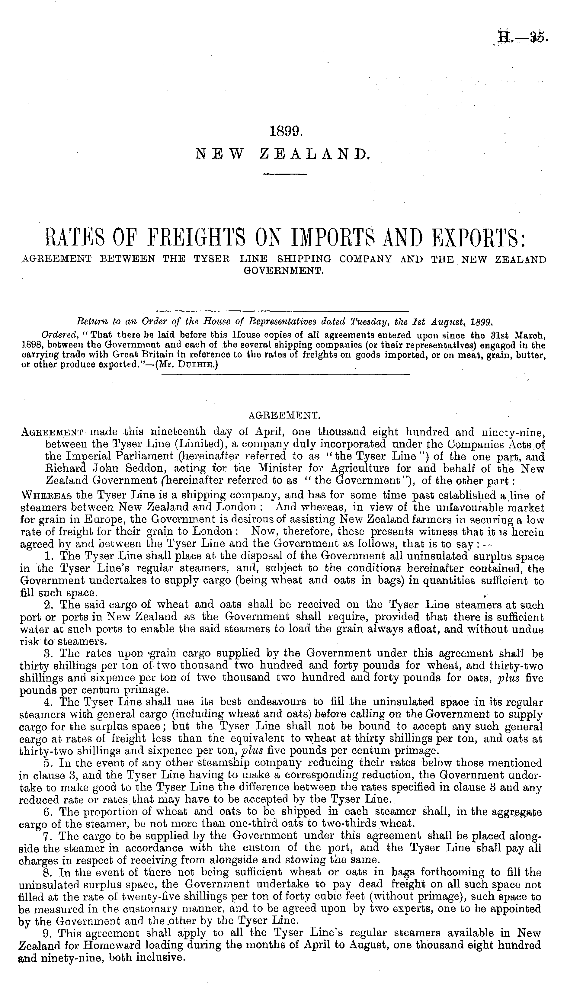 RATES OF FREIGHTS ON IMPORTS AND EXPORTS: AGREEMENT BETWEEN THE TYSER LINE SHIPPING COMPANY AND THE NEW ZEALAND GOVERNMENT.