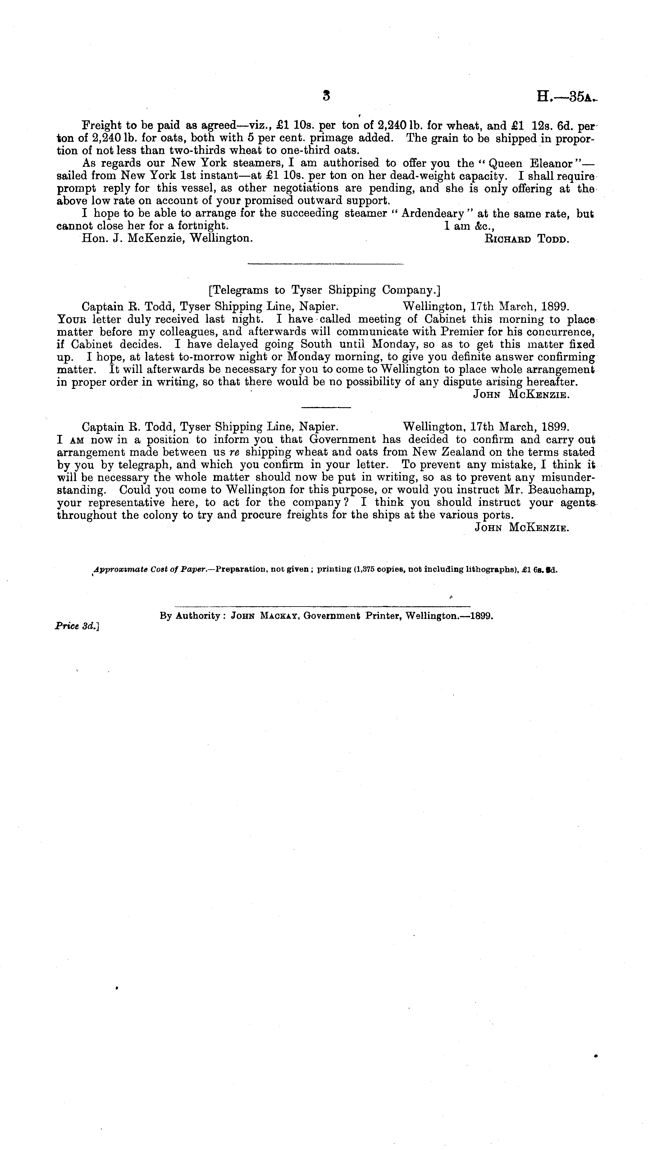 Captain E. Todd, Tyser Shipping Line, Napier. Wellington, 17th March, 1899. I am now in a position to inform you that Government has decided to confirm and carry out arrangement made between us re shipping wheat and oats from New Zealand on the terms stated by you by telegraph, and which you confirm in your letter. To prevent any mistake, I think it will be necessary the whole matter should now be put in writing, so as to prevent any misunderstanding. Could you come to Wellington for this purpose, or would you instruct Mr. Beauchamp, your representative here, to act for the company ? I think you should instruct your agents throughout the colony to try and procure freights for the ships at the various ports. John McKbnzik. Approximate Cost of Paper. —Preparation, not given ; printing (1,375 copies, not including lithographs), £1 6s. cd.