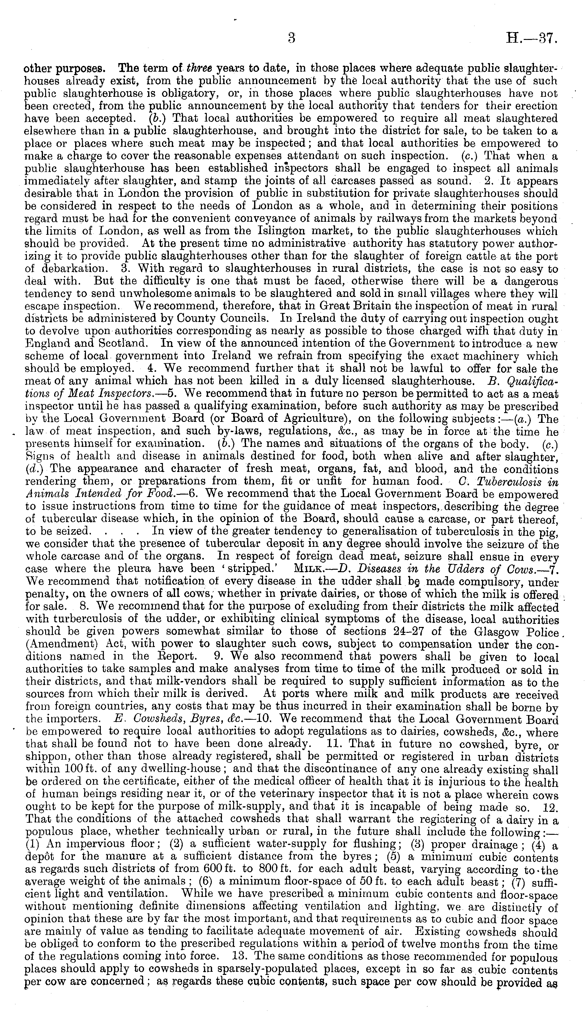 other purposes. The term of three years to date, in those places where adequate public slaughterhouses already exist, from the public announcement by the local authority that the use of such public slaughterhouse is obligatory, or, in those places where public slaughterhouses have not been erected, from the public announcement by the local authority that tenders for their erection have been accepted, (b.) That local authorities be empowered to require all meat slaughtered elsewhere than in a public slaughterhouse, and brought into the district for sale, to be taken to a place or places where such meat may be inspected; and that local authorities be empowered to make a charge to cover the reasonable expenses attendant on such inspection, (c.) That when a public slaughterhouse has been established inspectors shall be engaged to inspect all animals immediately after slaughter, and stamp the joints of all carcases passed as sound. 2. It appears desirable that in London the provision of public in substitution for private slaughterhouses should be considered in respect to the needs of London as a whole, and in determining their positions regard must be had for the convenient conveyance of animals by railways from the markets beyond the limits of London, as well as from the Islington market, to the public slaughterhouses which should be provided. At the present time no administrative authority has statutory power authorizing it to provide public slaughterhouses other than for the slaughter of foreign cattle at the port of debarkation. 3. With regard to slaughterhouses in rural districts, the case is not so easy to deal with. But the difficulty is one that must be faced, otherwise there will be a dangerous tendency to send unwholesome animals to be slaughtered and sold in small villages where they will escape inspection. We recommend, therefore, that in Great Britain the inspection of meat in rural districts be administered by County Councils. In Ireland the duty of carrying out inspection ought to devolve upon authorities corresponding as nearly as possible to those charged wifh that duty in England and Scotland. In view of the announced intention of the Government to introduce a new scheme of local government into Ireland we refrain from specifying the exact machinery which should be employed. 4. We recommend further that it shall not be lawful to offer for sale the meat of any animal which has not been killed in a duly licensed slaughterhouse. B. Qualifications of Meat Inspectors. —s. We recommend that in future no person be permitted to act as a meat inspector until he has passed a qualifying examination, before such authority as may be prescribed by the Local Government Board (or Board of Agriculture), on the following subjects:— (a.) The law of meat inspection, and such by-laws, regulations, &c, as may be in force at the time he presents himself for examination, (b.) The names and situations of the organs of the body, (c.) Signs of health and disease in animals destined for food, both when alive and after slaughter, (d.) The appearance and character of fresh meat, organs, fat, and blood, and the conditions rendering them, or preparations from them, fit or unfit for human food. C. Tuberculosis in Animals Intended for Food. —6. We recommend that the Local Government Board be empowered to issue instructions from time to time for the guidance of meat inspectors, describing the degree of tubercular disease which, in the opinion of the Board, should cause a carcase, or part thereof, to be seized. ... In view of the greater tendency to generalisation of tuberculosis in the pig, we consider that the presence of tubercular deposit in any degree should involve the seizure of the whole carcase and of the organs. In respect of foreign dead meat, seizure shall ensue in every case where the pleura have been ' stripped.' Milk.— D. Diseases in the Udders of Cows. —7. We recommend that notification of every disease in the udder shall b§ made compulsory, under penalty, on the owners of all cows, whether in private dairies, or those of which the milk is offered for sale. 8. We recommend that for the purpose of excluding from their districts the milk affected with turberculosis of the udder, or exhibiting clinical symptoms of the disease, local authorities should be given powers somewhat similar to those of sections 24-27 of the Glasgow Police (Amendment) Act, with power to slaughter such cows, subject to compensation under the conditions named in the Eeport. 9. We also recommend that powers shall be given to local authorities to take samples and make analyses from time to time of the milk produced or sold in their districts, and that milk-vendors shall be required to supply sufficient information as to the sources from which their milk is derived. At ports where milk and milk products are received from foreign countries, any costs that may be thus incurred in their examination shall be borne by the importers. E. Cowsheds, Byres, &c. —lo. We recommend that the Local Government Board be empowered to require local authorities to adopt regulations as to dairies, cowsheds, &0., where that shall be found not to have been done already. 11. That in future no cowshed, byre, or shippon, other than those already registered, shall be permitted or registered in urban districts within 100 ft. of any dwelling-house ; and that the discontinance of any one already existino- shall be ordered on the certificate, either of the medical officer of health that it is injurious to the health of human beings residing near it, or of the veterinary inspector that it is not a place wherein cows ought to be kept for the purpose of milk-supply, and that it is incapable of being made so. 12. That the conditions of the attached cowsheds that shall warrant the registering of a dairy in a populous place, whether technically urban or rural, in the future shall include the following: (1) An impervious floor; (2) a sufficient water-
