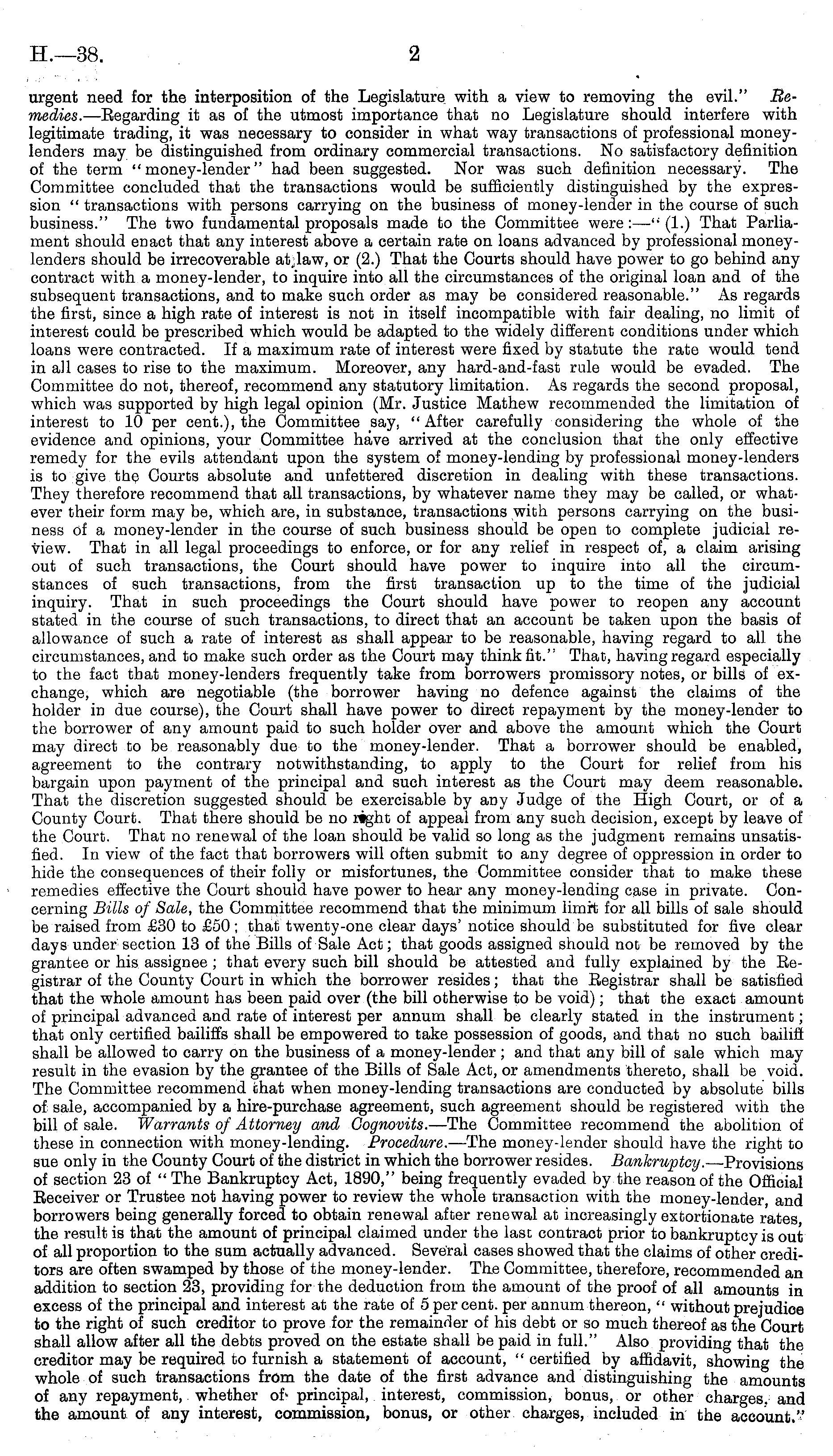 urgent need for the interposition of the Legislature with a view to removing the evil." Remedies.—Eegarding it as of the utmost importance that no Legislature should interfere with legitimate trading, it was necessary to consider in what way transactions of professional moneylenders may be distinguished from ordinary commercial transactions. No satisfactory definition of the term "money-lender" had been suggested. Nor was such definition necessary. The Committee concluded that the transactions would be sufficiently distinguished by the expression " transactions with persons carrying on the business of money-lender in the course of such business." The two fundamental proposals made to the Committee were:—■"(!.) That Parliament should enact that any interest above a certain rate on loans advanced by professional moneylenders should be irrecoverable at,law, or (2.) That the Courts should have power to go behind any contract with a money-lender, to inquire into all the circumstances of the original loan and of the subsequent transactions, and to make such order as may be considered reasonable." As regards the first, since a high rate of interest is not in itself incompatible with fair dealing, no limit of interest could be prescribed which would be adapted to the widely different conditions under which loans were contracted. If a maximum rate of interest were fixed by statute the rate would tend in all cases to rise to the maximum. Moreover, any hard-and-fast rule would be evaded. The Committee do not, thereof, recommend any statutory limitation. As regards the second proposal, which was supported by high legal opinion (Mr. Justice Mathew recommended the limitation of interest to 10 per cent.), the Committee say, "After carefully considering the whole of the evidence and opinions, your Committee have arrived at the conclusion that the only effective remedy for the evils attendant upon the system of money-lending by professional money-lenders is to give the Courts absolute and unfettered discretion in dealing with these transactions. They therefore recommend that all transactions, by whatever name they may be called, or whatever their form may be, which are, in substance, transactions with persons carrying on the business of a money-lender in the course of such business should be open to complete judicial review. That in all legal proceedings to enforce, or for any relief in respect of, a claim arising out of such transactions, the Court should have power to inquire into all the circumstances of such transactions, from the first transaction up to the time of the judicial inquiry. That in such proceedings the Court should have power to reopen any account stated in the course of such transactions, to direct that an account be taken upon the basis of allowance of such a rate of interest as shall appear to be reasonable, having regard to all the circumstances, and to make such order as the Court may think fit." That, having regard especially to the fact that money-lenders frequently take from borrowers promissory notes, or bills of exchange, which are negotiable (the borrower having no defence against the claims of the holder in due course), the Court shall have power to direct repayment by the money-lender to the borrower of any amount paid to such holder over and above the amount which the Court may direct to be reasonably due to the money-lender. That a borrower should be enabled, agreement to the contrary notwithstanding, to apply to the Court for relief from his bargain upon payment of the principal and such interest as the Court may deem reasonable. That the discretion suggested should be exercisable by any Judge of the High Court, or of a County Court. That there should be no light of appeal from any such decision, except by leave of the Court. That no renewal of the loan should be valid so long as the judgment remains unsatisfied. In view of the fact that borrowers will often submit to any degree of oppression in order to hide the consequences of their folly or misfortunes, the Committee consider that to make these remedies effective the Court should have power to hear any money-lending case in private. Concerning Bills of Sale, the Committee recommend that the minimum limit for all bills of sale should be raised from £30 to £50 ; that twenty-one clear days' notice should be substituted for five clear days under section 13 of the Bills of Sale Act; that goods assigned should not be removed by the grantee or his assignee ; that every such bill should be attested and fully explained by the Registrar of the County Court in which the borrower resides; that the Registrar shall be satisfied that the whole amount has been paid over (the bill otherwise to be void); that the exact amount of principal advanced and rate of interest per annum shall be clearly stated in the instrument; that only certified bailiffs shall be empowered to take possession of goods, and that no such bailiff shall be allowed to carry on the business of a money-lender ; and that any bill of sale which may result in the evasion by the grantee of the Bills of Sale Act, or amendments thereto, shall be void. The Committee recommend chat when money-lending transactions are conducted by absolute bills of sale, accompanied by a hire-purchase agreement, such agreement should be registered with the bill of sale. Warrants of Attorney and Cognovits. —The Committee recommend the abolition of these in connection with money-lending. Procedure. —The money-lender should have the right to sue only in the County Court of the district in which the borrower resides. Bankruptcy. —Provisions of section 23 of " The Bankruptcy Act, 1890," being frequently evaded by the reason of the Official Eeceiver or Trustee not having power to review the whole transaction with the money-lender, and borrowers being generally forced to obtain renewal after renewal at increasingly extortionate rates the result is that the amount of principal claimed 