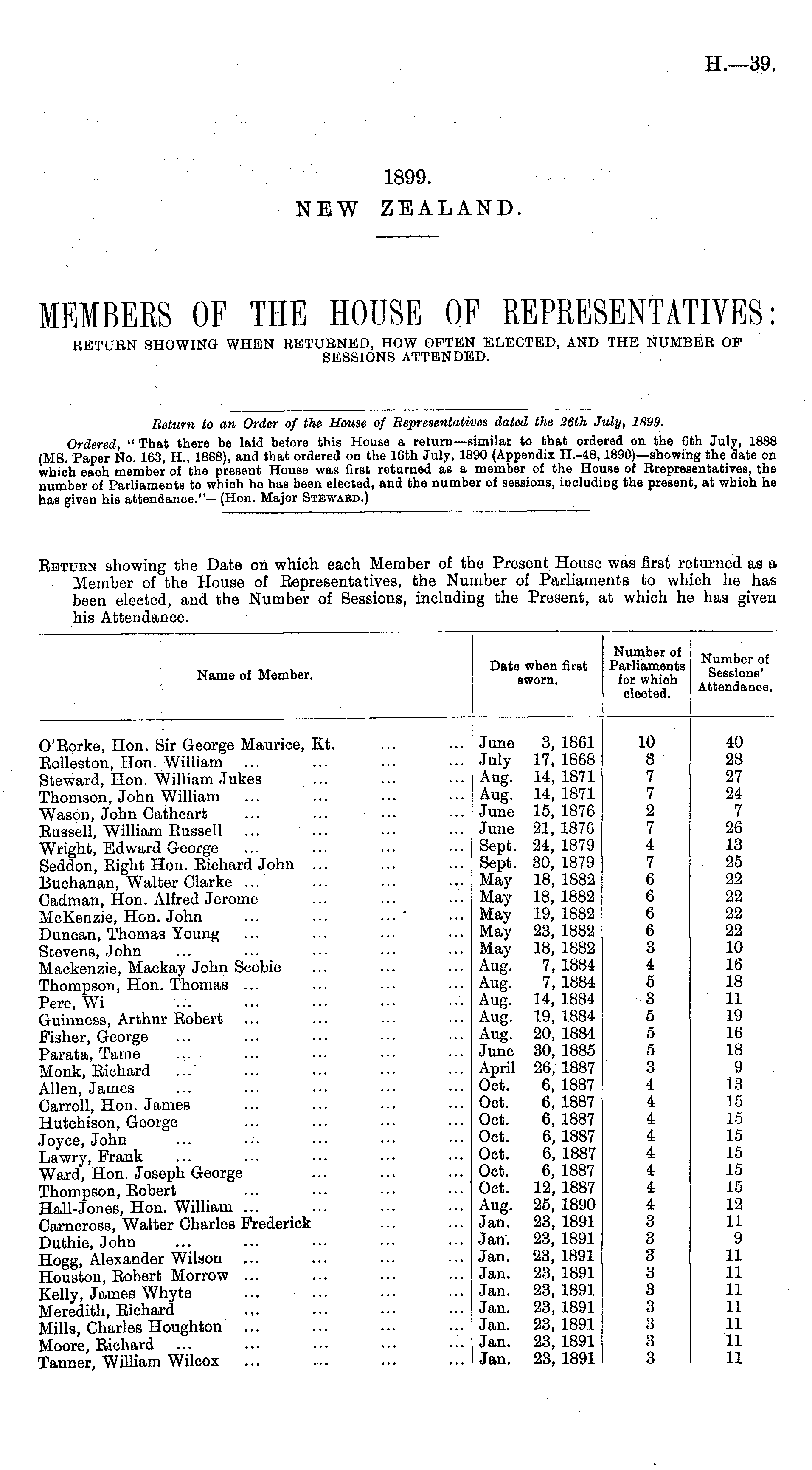 Return to an Order of the House of Representatives dated the 26th July, 1899. Ordered, " That there be laid before this Houbo a return—similar to that ordered on the 6th July, 1888 (MS. Paper No. 163, H., 1888), and that ordered on the 16th July, 1890 (Appendix H.-48,1890)—showing the date on whioh each member of the present House was first returned as a member of the House of Rrepresentatives, the number of Parliaments to whioh he hae been elected, and the number of sessions, iucluding the present, at whioh he has given his attendance."—(Hon. Major Steward.)