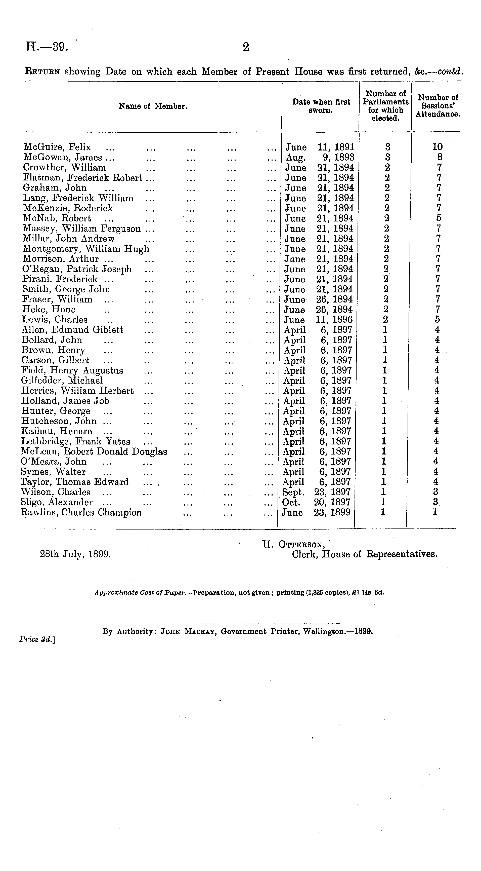 Name of Member. Date when first sworn. Number of Parliaments for whioh elected. Number of Sessions' Attendance. McGuire, Felix McGowan, James ... Crowther, William Flatman, Frederick Robert ... Graham, John Lang, Frederick William McKenzie, Eoderick McNab, Eobert Massey, William Ferguson ... Millar, John Andrew Montgomery, William Hugh Morrison, Arthur ... O'Eegan, Patrick Joseph Pirani, Frederick ... Smith, George John Fraser, William Heke, Hone Lewis, Charles Allen, Edmund Giblett Bollard, John Brown, Henry Carson, Gilbert Field, Henry Augustus Gilfedder, Michael Hemes, William Herbert ... Holland, James Job Hunter, George Hutcheson, John ... Kaihau, Henare Lethbridge, Frank Yates McLean, Robert Donald Douglas O'Meara, John Symes, Walter Taylor, Thomas Edward Wilson, Charles Sligo, Alexander ... Eawlins, Charles Champion June Aug. June June June June June June June June June June June June June June June June April April April April April April April April April April April April April April April April Sept. Oct. June 11, 1891 9, 1893 21, 1894 21, 1894 21, 1894 21, 1894 21, 1894 21, 1894 21, 1894 21, 1894 21, 1894 21, 1894 21, 1894 21, 1894 21, 1894 26, 1894 26, 1894 11, 1896 6, 1897 6, 1897 6, 1897 6, 1897 6, 1897 6, 1897 6, 1897 6, 1897 6, 1897 6, 1897 6, 1897 6, 1897 6, 1897 6, 1897 6, 1897 6, 1897 23, 1897 20, 1897 23, 1899 3 3 2 2 2 2 2 2 2 2 2 2 2 2 2 2 2 2 1 1 1 1 1 1 1 1 1 1 1 1 1 1 1 1 1 1 1 10 8 7 7 7 7 7 5 7 7 7 7 7 7 7 7 7 5 4 4 4 4 4 4 4 4 4 4 4 4 4 4 4 4 3 3 1
