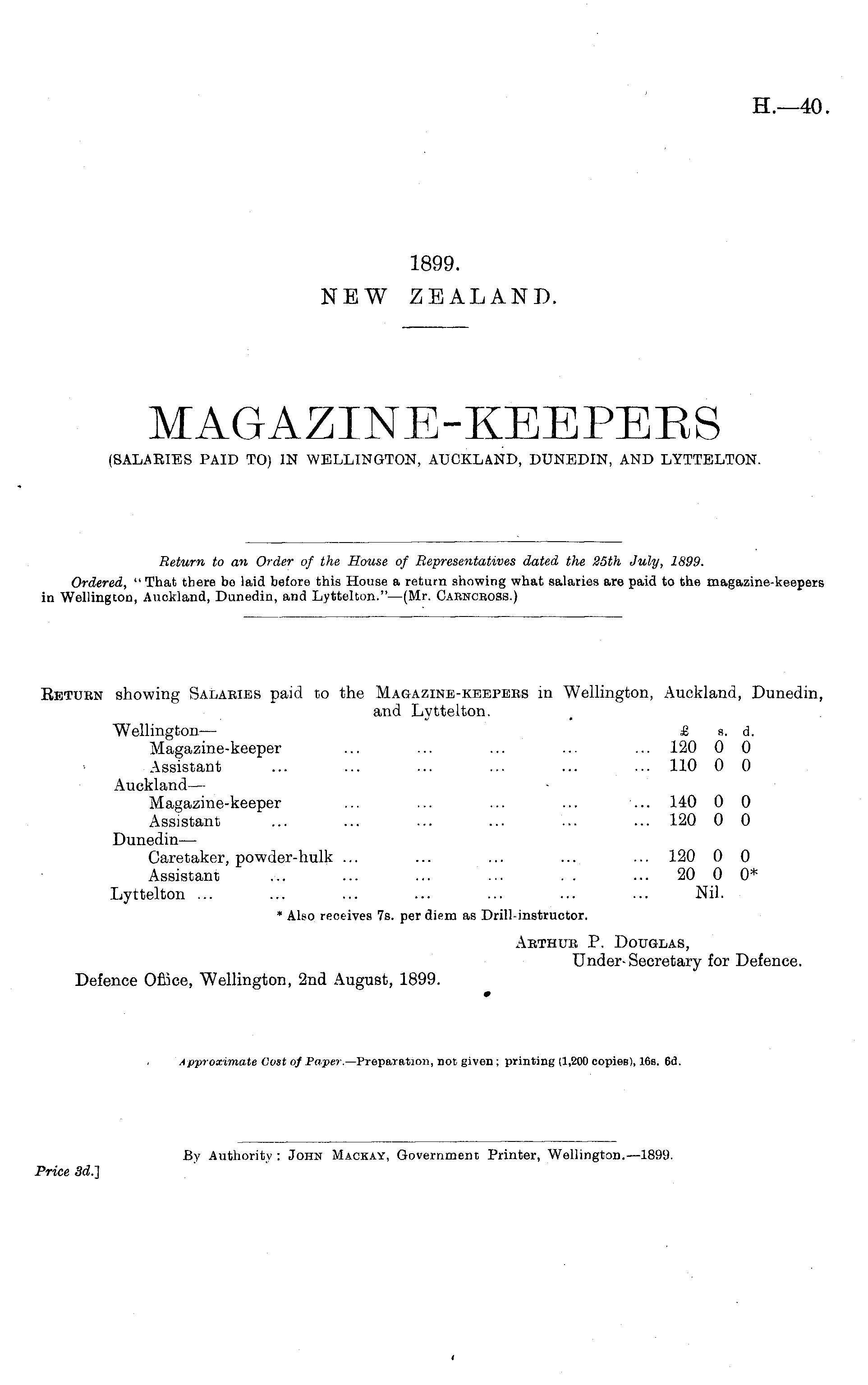 Return showing Salaries paid to the Magazine-keepers in Wellington, Auckland, Dunedin, and Lyttelton. Wellington — £ s. d. Magazine-keeper ... ... ... ... ... 120 0 0 Assistant ... ... ... ... ... ... 110 0 0 Auckland — Magazine-keeper ... ... ... ... ... 140 0 0 Assistant ... ... ... ... ... ... 120 0 0 Dunedin — Caretaker, powder-hulk ... ... ... ... ... 120 0 0 Assistant ... ... ... ... . . ... 20 0 0* Lyttelton ... ... ... ... ... ... ... Nil. * Also receives 7s. per diem as Drill-instructor. Arthur P. Douglas, Under-Secretary for Defence. Defence Office, Wellington, 2nd August, 1899. 0 Approximate Cost of Paper. —Preparation, not given; printing (1,200 copies), 16b. 6d.