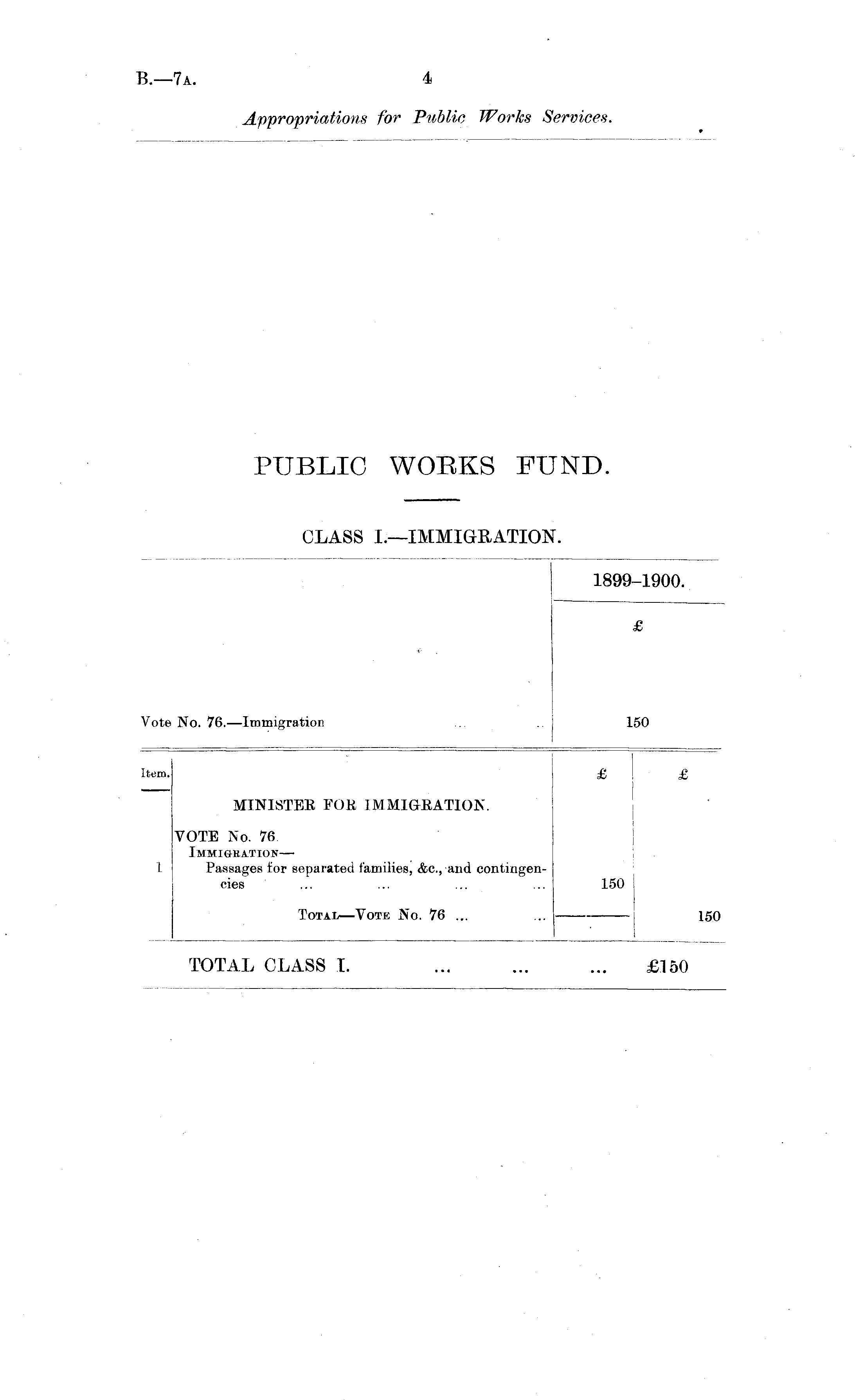 1899-1900. ♦ £ ote No. 76.—Immigration 150 £ £ tem. MINISTER FOR IMMIGRATION. VOTE No. 76 Immigration— Passages for separated families, &c, and contingencies 150 Total—Vote No. 76 ... 150 TOTAL CLASS I. £150 • • ■