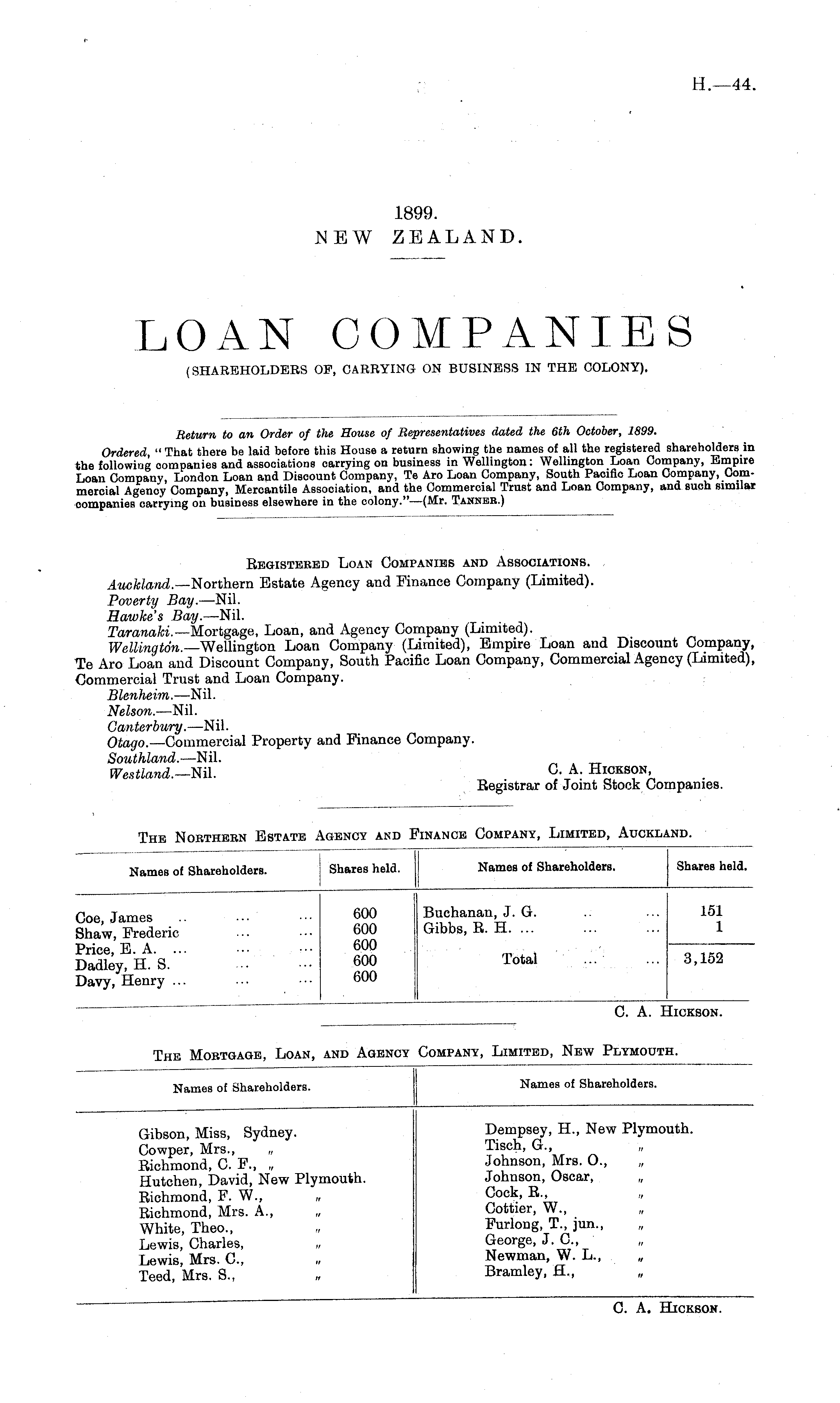 Return to an Order of the House of Representatives dated the 6th October, 1899. Ordered, " That there be laid before this House a return showing the names of all the registered shareholders in the following oompanies and associations carrying on business in Wellington: Wellington Loan Company, Empire Loan Company, London Loan and Discount Company, Te Aro Loan Company, South Pacific Loan Company, Commercial Agenoy Company, Mercantile Association, and the Commercial Trust and Loan Company, and such similar oompanies carrying on business elsewhere in the colony."—(Mr. Tanner.)