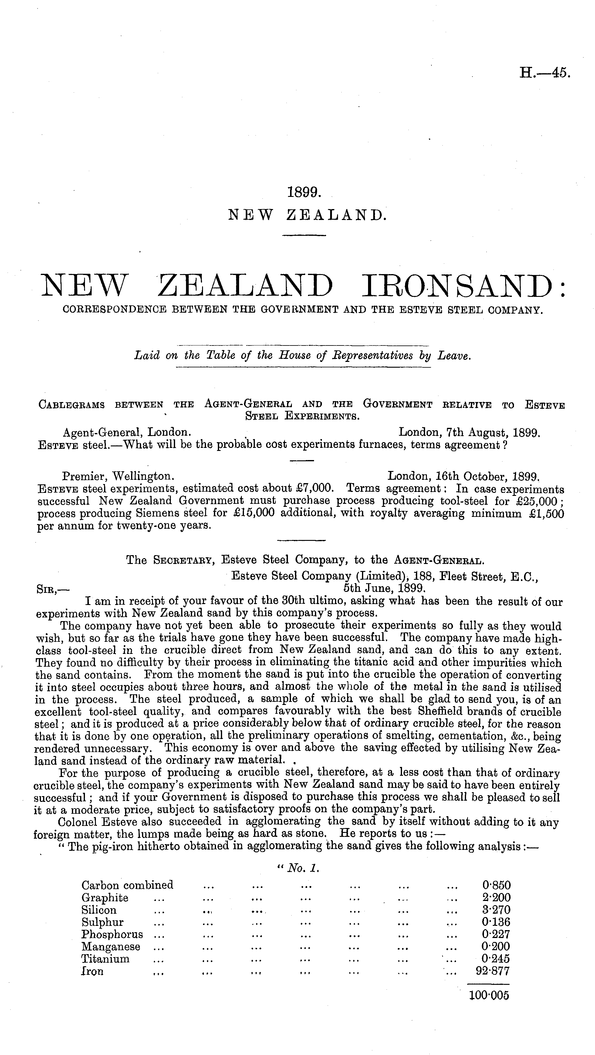 The Secretary, Esteve Steel Company, to the Agent-General. Esteve Steel Company (Limited), 188, Fleet Street, E.C., Sir,— sth June, 1899. I am in receipt of your favour of the 30th ultimo, asking what has been the result of our experiments with New Zealand sand by this company's process. The company have not yet been able to prosecute their experiments so fully as they would wish, but so far as the trials have gone they have been successful. The company have made highclass tool-steel in the crucible direct from New Zealand sand, and can do this to any extent. They found no difficulty by their process in eliminating the titanic acid and other impurities which the sand contains. From the moment the sand is put into the crucible the operation of converting it into steel occupies about three hours, and almost the whole of the metal in the sand is utilised in the process. The steel produced, a sample of which we shall be glad to send you, is of an excellent tool-steel quality, and compares favourably with the best Sheffield brands of crucible steel; and it is produced at a price considerably below that of ordinary crucible steel, for the reason that it is done by one operation, all the preliminary operations of smelting, cementation, &c, being rendered unnecessary. This economy is over and above the saving effected by utilising New Zealand sand instead of the ordinary raw material. . For the purpose of producing a crucible steel, therefore, at a less cost than that of ordinary crucible steel, the company's experiments with New Zealand sand may be said to have been entirely successful; and if your Government is disposed to purchase this process we shall be pleased to sell it at a moderate price, subject to satisfactory proofs on the company's part. Colonel Esteve also succeeded in agglomerating the sand by itself without adding to it any foreign matter, the lumps made being as hard as stone. He reports to us : — " The pig-iron hitherto obtained in agglomerating the sand gives the following analysis :— " No. 1. Carbon combined ... ... ... ... ... ... 0-850 Graphite ... ... ... ... ... ... ... 2-200 Silicon ... ... ... ... ... ... ... 3-270 Sulphur ... ... ... ... ... ... ... 0-136 Phosphorus ... ... ... ... ... ... ... 0-227 Manganese ... ... ... ... ... ... ... 0-200 Titanium ... ... ... ... ... ... ... 0-245 Iron ~. ... ~, ... ... ... ... 92-877 100-005