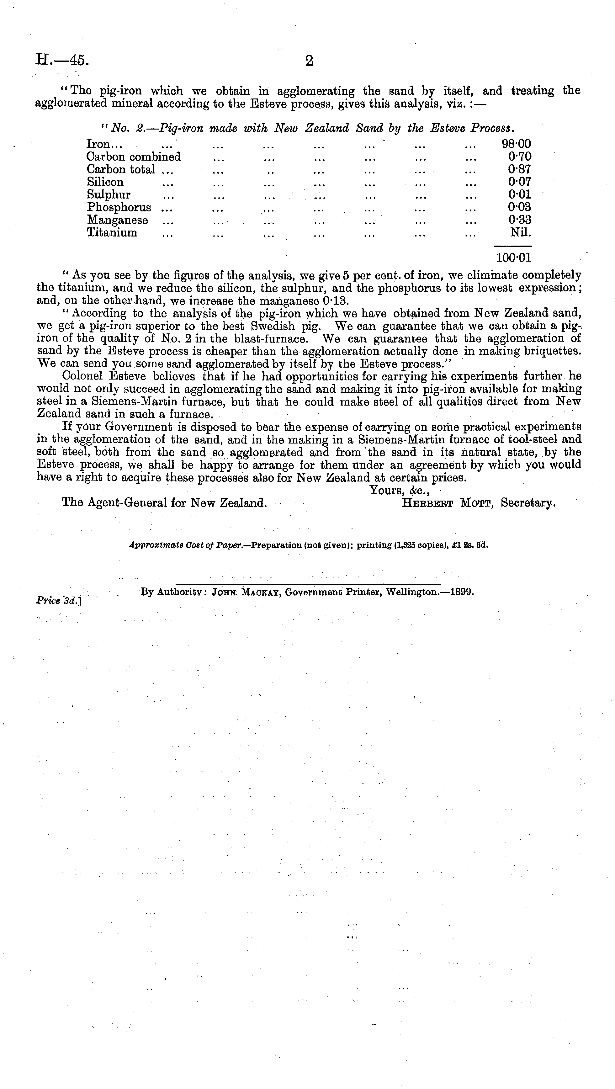 "The pig-iron which we obtain in agglomerating the sand by itself, and treating the agglomerated mineral according to the Esteve process, gives this analysis, viz. :— "No. 2. — Pig-iron made with New Zealand Sand by the Esteve Process. 1r0n... ... ... ... ... ... ' ... ... 98-00 Carbon combined ... ... ... ... ... ... 0-70 Carbon total ... ... .. ... ... ... ... 0-87 Silicon ... ... ... ... ... ... ... 0-07 Sulphur ... ... ... ... ... ... ... 0-01 Phosphorus ... ... ... ... ... ... ... 0-03 Manganese ... ... ... ... ... ... ... 0-33 Titanium ... ... ... ... ... ... ... Nil. 100-01 " As you see by the figures of the analysis, we give 5 per cent, of iron, we eliminate completely the titanium, and we reduce the silicon, the sulphur, and the phosphorus to its lowest expression; and, on the other hand, we increase the manganese OT3. "According to the analysis of the pig-iron which we have obtained from New Zealand sand, we get a pig-iron superior to the best Swedish pig. We can guarantee that we can obtain a pigiron of the quality of No. 2in the blast-furnace. We can guarantee that the agglomeration of sand by the Esteve process is cheaper than the agglomeration actually done in making briquettes. We can send you some sand agglomerated by itself by the Esteve process." Colonel Esteve believes that if he had opportunities for carrying his experiments further he would not only succeed in agglomerating the sand and making it into pig-iron available for making steel in a Siemens-Martin furnace, but that he could make steel of all qualities direct from New Zealand sand in such a furnace. If your Government is disposed to bear the expense of carrying on some practical experiments in the agglomeration of the sand, and in the making in a Siemens-Martin furnace of tool-steel and soft steel, both from the sand so agglomerated and from the sand in its natural state, by the Esteve process, we shall be happy to arrange for them Under an agreement by which you would have a right to acquire these processes also for New Zealand at certain prices. Yours, &c, The Agent-General for New Zealand. Herbert Mott, Secretary. Approximate Cost of Paper.—Preparation (not given); printing (1,325 copies), £1 2s. 6d.