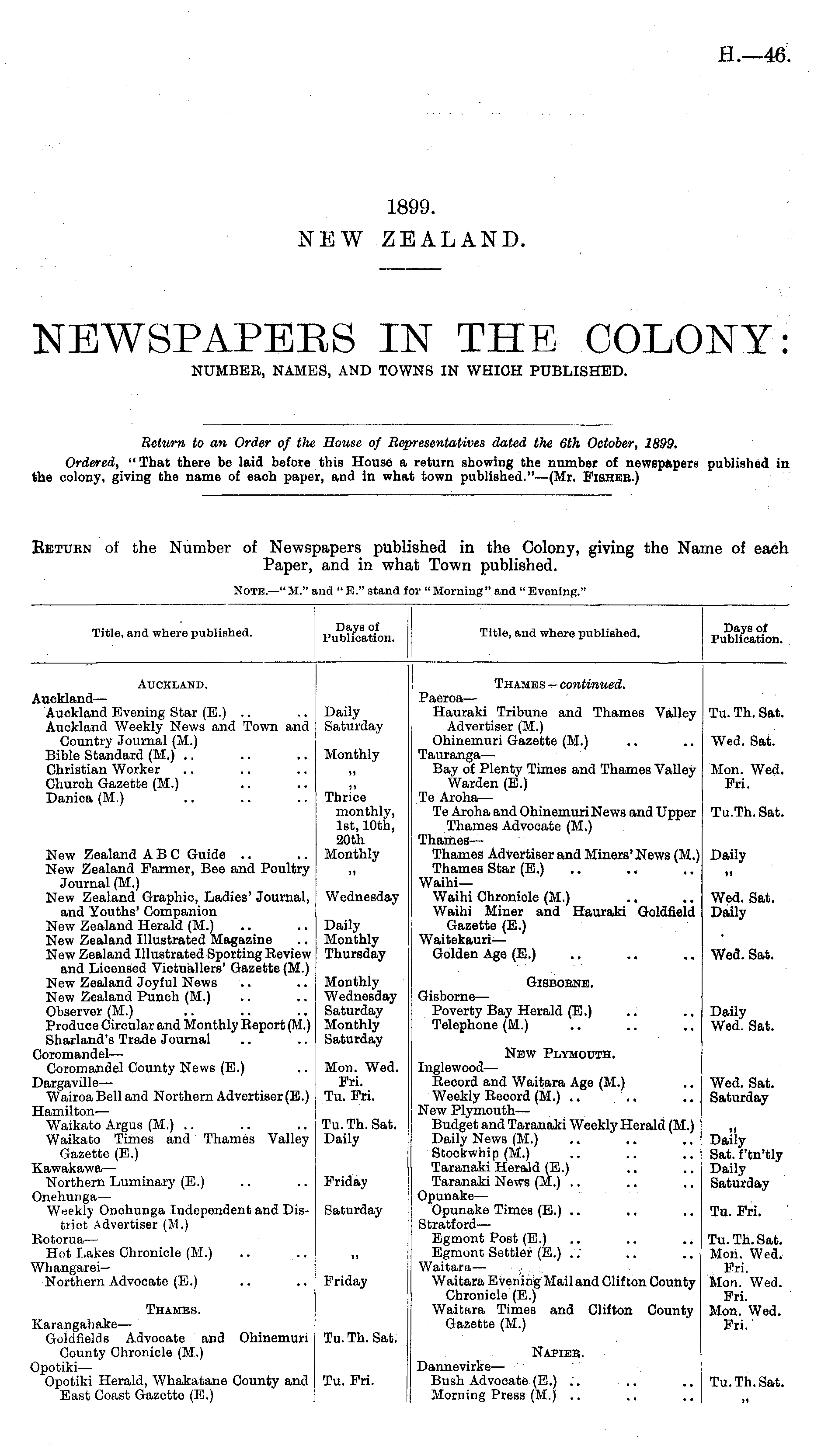 Beturn to an Order of the House of Representatives dated the 6th October, 1899. Ordered, " That there be laid before this House a return showing the number of newspapers published in the colony, giving the name of eaoh paper, and in what town published."—(Mr. Fisher.)