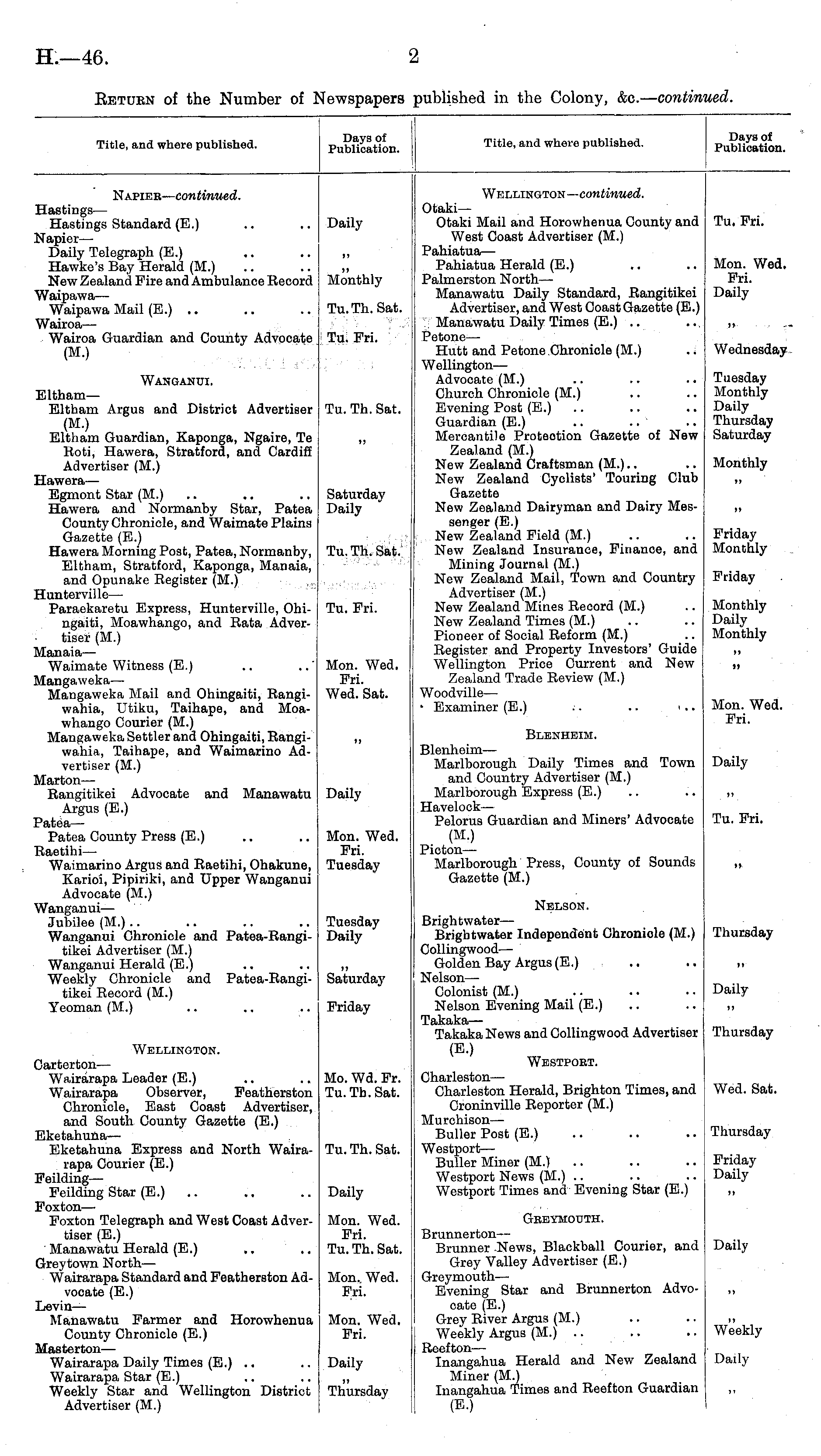 Title, and where published. Days of Publication. Title, and where published. Days of Publication. Napieb— continued. Wellington— continued. Hastings— Hastings Standard (E.) Napier — Daily Telegraph (E.) Hawke's Bay Herald (M.) New Zealand Fire and Ambulance Record Waipawa— Waipawa Mail (E.) .. Wairoa — Wairoa Guardian and County Advocate (M.) Wanganui. Eltham— Eltham Argus and District Advertiser (M.) Eltham Guardian, Kaponga, Ngaire, Te Roti, Hawera, Stratford, and Cardiff Advertiser (M.) Hawera — Egmont Star (M.) Hawera and Normanby Star, Patea County Chronicle, and Waimate Plains Gazette (E.) Hawera Morning Post, Patea, Normanby, Eltham, Stratford, Kaponga, Manaia, and Opunake Register (M.) Hunterville — Paraekaretu Express, Hunterville, Ohingaiti, Moawhango, and Rata Advertiser (M.) Manaia — Waimate Witness (E.) Mangaweka— Mangaweka Mail and Ohingaiti, Rangiwahia, Utiku, Taihape, and Moawhango Courier (M.) Mangaweka Settler and Ohingaiti, Rangiwahia, Taihape, and Waimarino Advertiser (M.) Marton — Rangitikei Advocate and Manawatu Argus (E.) Patea — Patea County Press (E.) Raetihi — Waimarino Argus and Raetihi, Ohakune, Karioi, Pipiriki, and Upper Wanganui Advocate (M.) Wanganui— Jubilee (M.) Wanganui Chronicle and Patea-Rangi-tikei Advertiser (M.) Wanganui Herald (E.) Weekly Chronicle and Patea-Rangi-tikei Record (M.) Yeoman (M.) Daily Monthly Tu.Th. Sat. i Tu. Fri. Tu.Th. Sat. 11 Otaki— Otaki Mail and Horowhenua County and West Coast Advertiser (M.) Pahiatua — Pahiatua Herald (E.) Palmerston North — Manawatu Daily Standard, Rangitikei Advertiser, and West Coast Gazette (E.) Manawatu Daily Times (E.) .. Petone — Hutt and Petone Chronicle (M.) Wellington— Advocate (M.) Church Chronicle (M.) Evening Post (E.) Guardian (E.) Mercantile Protection Gazette of New Zealand (M.) New Zealand Craftsman (M.) New Zealand Cyclists' Touring Club Gazette New Zealand Dairyman and Dairy Messenger (E.) New Zealand Field (M.) New Zealand Insurance, Finance, and Mining Journal (M.) New Zealand Mail, Town and Country Advertiser (M.) New Zealand Mines Record (M.) New Zealand Times (M.) Pioneer of Social Reform (M.) Register and Property Investors' Guide Wellington Price Current and New Zealand Trade Review (M.) Woodville — ■ Examiner (E.) .. .. i .. Tu. Fri. Mon. Wed. Fri. Daily ii . Wednesday Tuesday Monthly Daily Thursday Saturday Monthly Saturday Daily ii Tu.Th. Sat/ Friday Monthly Friday Tu. Fri. Monthly Daily Monthly Mon. Wed. Fri. Wed. Sat. ii Mon. Wed. Fri. n Blenheim. Blenheim — Marlborough Daily Times and Town and Country Advertiser (M.) Marlborough Express (E.) Havelock — Pelorus Guardian and Miners' Advocate (M.) Picton — Marlborough Press, County of Sounds Gazette (M.) Daily Daily Mon. Wed. Fri. Tuesday Tu. Fri. II Tuesday Daily Nelson. Brightwater — Brightwater Independent Chronicle (M.) Collingwood— Golden Bay Argus (E.) Nelson— Colonist (M.) Nelson Evening Mail (E.) Takaka — Takaka News and Collingwood Advertiser (E.) Westport. Thursday n Saturday !> Daily Friday ii Thursday Wellington. Mo. Wd. Fr. Tu.Th. Sat. Carterton — Wairarapa Leader (E.) Wairarapa Observer, Featherston Chronicle, East Coast Advertiser, and South County Gazette (E.) Eketahuna— Eketahuna Express and North Wairarapa Courier (E.) Feilding— Feilding Star (E.) .. Foxton — Foxton Telegraph and West Coast Advertiser (E.) Manawatu Herald (E.) Greytown North — Wairarapa Standard and Featherston Advocate (E.) Levin— Manawatu Farmer and Horowhenua County Chronicle (E.) Masterton — Wairarapa Daily Times (E.) .. Wairarapa Star (E.) Weekly Star and Wellington District Advertiser (M.) Tu. Th. Sat. Daily Mon. Wed. Fri. Tu. Th. Sat. Charleston — Charleston Herald, Brighton Times, and Croninville Reporter (M.) Murchison — Buller Post (E.) Westport— Buller Miner (M.) Westport News (M.) Westport Times and Evening Star (E.) Greymouth. Brunnerton — Brunner -News, Blackball Courier, and Grey Valley Advertiser (E.) Greymouth — Evening Star and Brunnerton Advocate 05.) Grey River Argus (M.) Weekly Argus (M.) Reefton — Inangahua Herald and New Zealand Miner (M.) Inangahua Times and Reefton Guardian (E.) Wed. Sat. Thursday Friday Daily ii Daily Mon., Wed. Fri. Mon. Wed. Fri. Weekly Daily Daily 11 Thursday