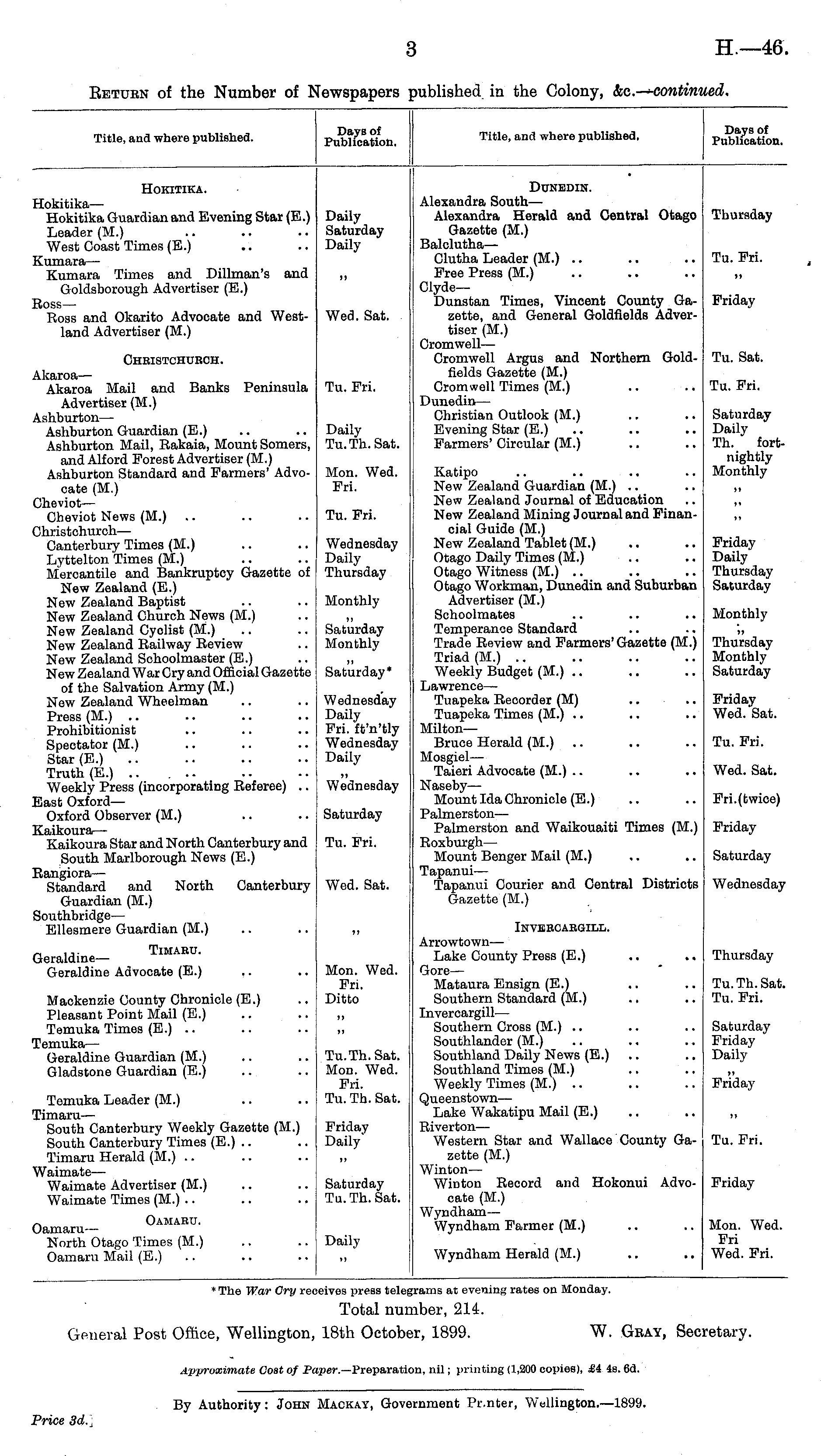 Total number, 214. General Post Office, Wellington, 18th October, 1899. W. Gray, Secretary. Approximate Cost of Paper.— Preparation, nil; printing (1,200 copies), £& 4s. 6d.