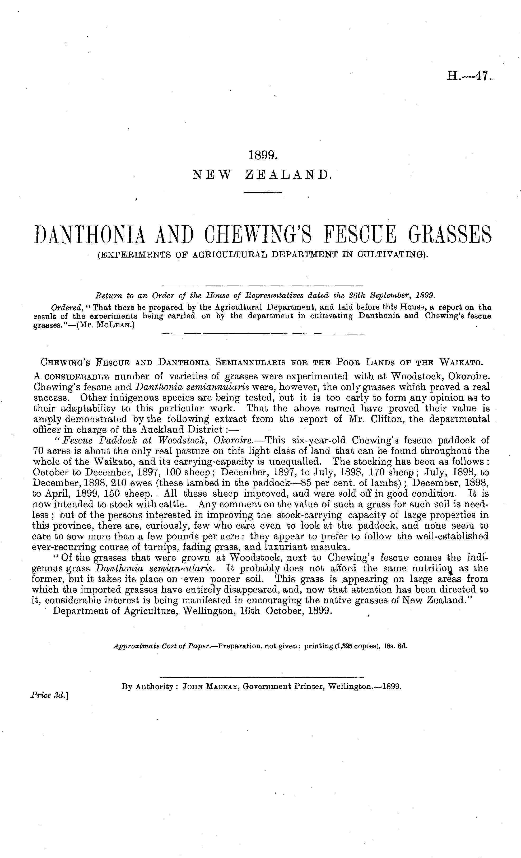 Return to an Order of the House of Representatives dated the 26th September, 1899. Ordered, " That there be prepared by the Agricultural Department, and laid before this Housi, a report on the result of the experiments being carried on by the department in cultivating Danthonia and Chewing's fescue grasses."—(Mr. McLean.)