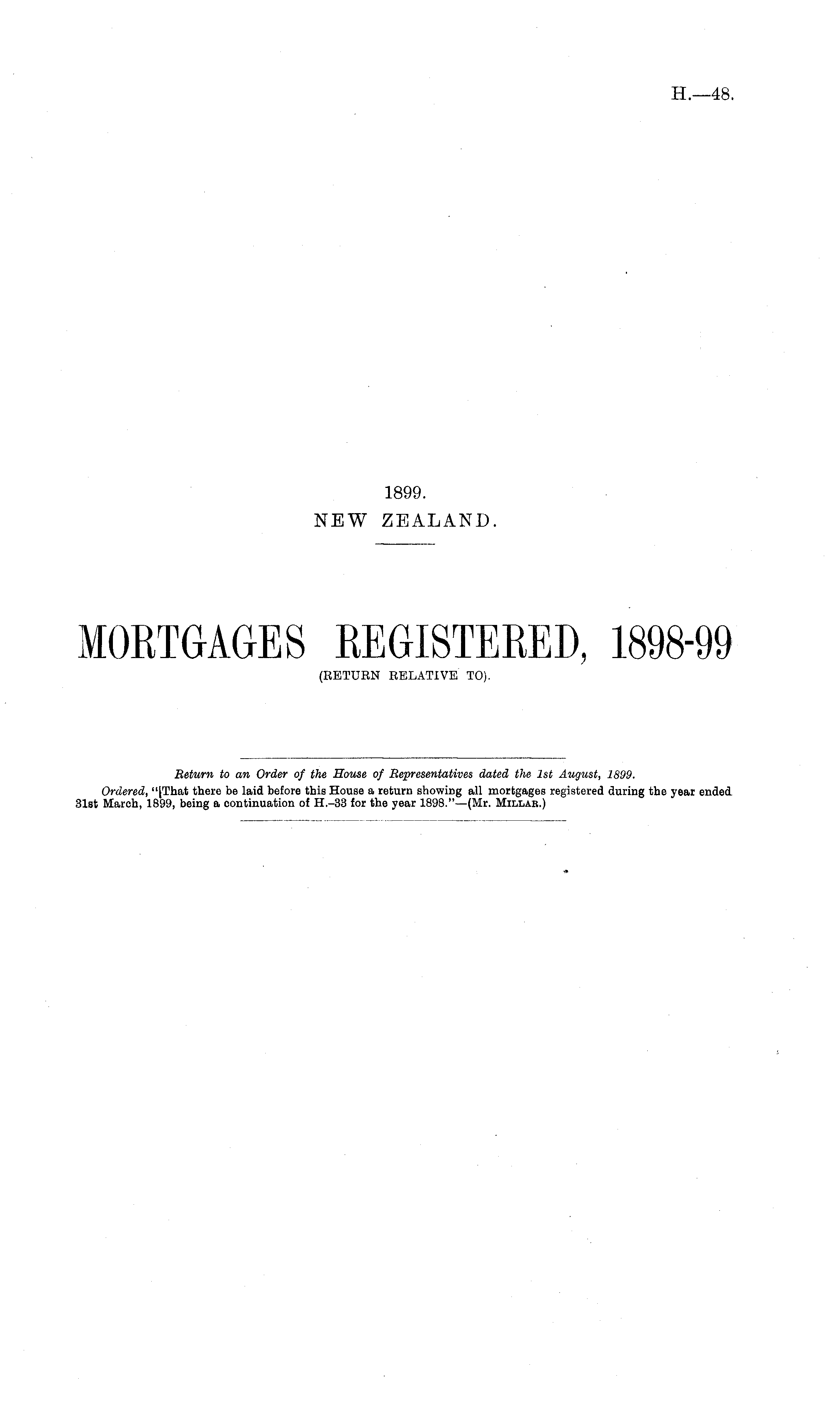 Return to an Order of the House of Representatives dated the Ist August, 1899. Ordered, "[That there be laid before this House a return showing all mortgages registered during the year ended 31st March, 1899, being a continuation of H.-33 for the year 1898."—(Mr. Millab.)