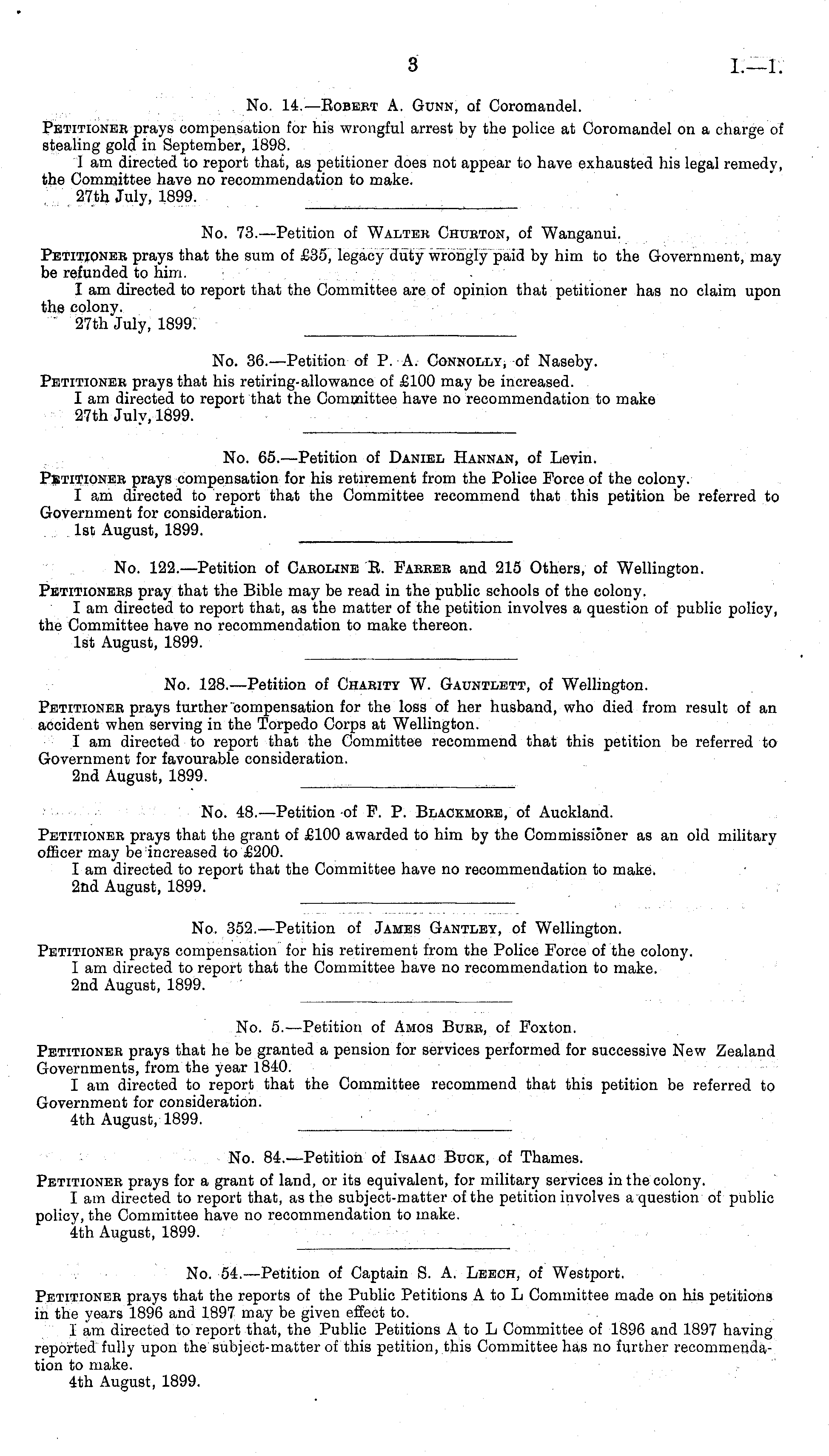 No. 14.—Bobert A. Gunn, of Coromandel. Petitioner prays compensation for his wrongful arrest by the police at Coromandel on a charge of stealing gold in September, 1898. I am directed to report that, as petitioner does not appear to have exhausted his legal remedy, the Committee have no recommendation to make. 27th July, 1899. ____________