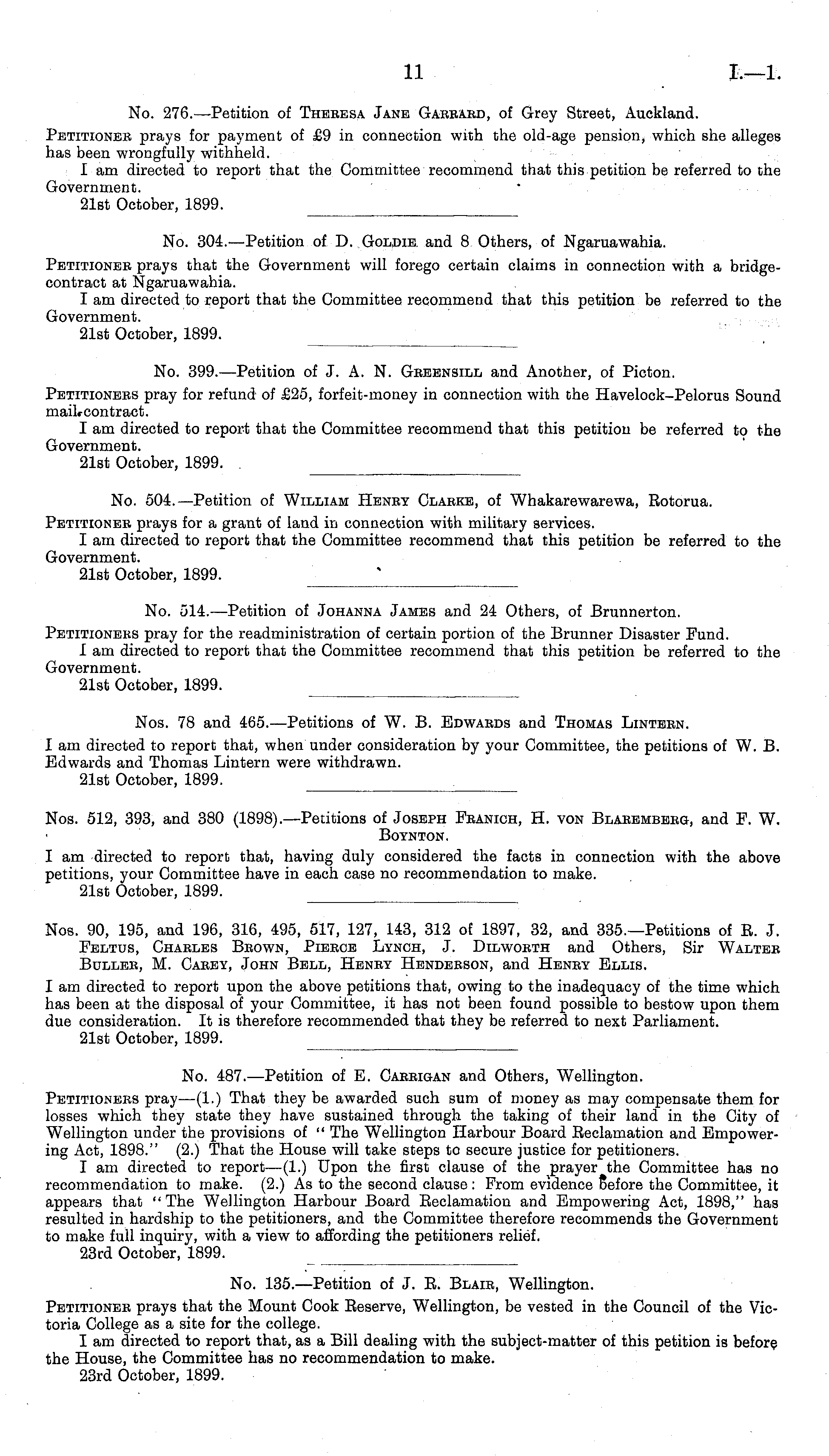 No. 487.—Petition of E. Carrigan and Others, Wellington. Petitioners pray —(1.) That they be awarded such sum of money as may compensate them for losses which they state they have sustained through the taking of their land in the City of Wellington under the provisions of " The Wellington Harbour Board Beclamation and Empowering Act, 1898." (2.) That the House will take steps to secure justice for petitioners. I am directed to report —(1.) Upon the first clause of the prayer the Committee has no recommendation to make. (2.) As to the second clause : Prom evidence Before the Committee, it appears that " The Wellington Harbour Board Beclamation and Empowering Act, 1898," has resulted in hardship to the petitioners, and the Committee therefore recommends the Government to make full inquiry, with a view to affording the petitioners relief. 23rd October, 1899.