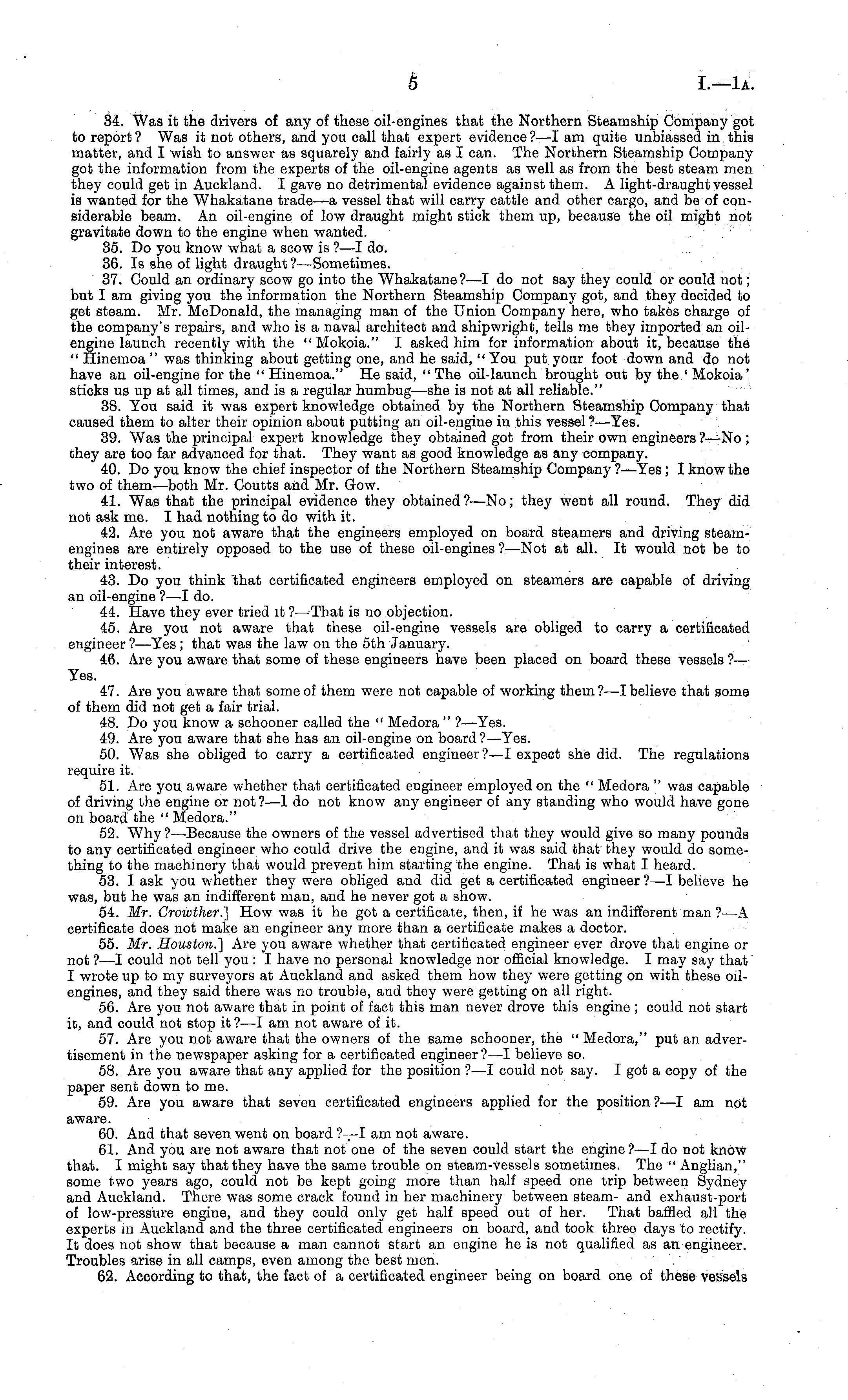 34. Was it the drivers of any of these oil-engines that the Northern Steamship Company got to report ? Was it not others, and you call that expert evidence ?—I am quite unbiassed in this matter, and I wish to answer as squarely and fairly as I can. The Northern Steamship Company got the information from the experts of the oil-engine agents as well as from the best steam men they could get in Auckland. I gave no detrimental evidence against them. A light-draught vessel is wanted for the Whakatane trade—a vessel that will carry cattle and other cargo, and be of considerable beam. An oil-engine of low draught might stick them up, because the oil might not gravitate down to the engine when wanted. 35. Do you know what a scow is ?—I do. 36. Is she of light draught? —Sometimes. 37. Could an ordinary scow go into the Whakatane?—l do not say they could or could not; but I am giving you the information the Northern Steamship Company got, and they decided to get steam. Mr. McDonald, the managing man of the Union Company here, who takes charge of the company's repairs, and who is a naval architect and shipwright, tells me they imported an oilengine launch recently with the " Mokoia." I asked him for information about it, because the " Hinemoa " was thinking about getting one, and he said, " You put your foot down and do not have an oil-engine for the "Hinemoa." He said, "The oil-launch brought out by the ' Mokoia' sticks us up at all times, and is a regular humbug—she is not at all reliable." 38. You said it was expert knowledge obtained by the Northern Steamship Company that caused them to alter their opinion about putting an oil-engine in this vessel ?—Yes. 39. Was the principal expert knowledge they obtained got from their own engineers ?—No ; they are too far advanced for that. They want as good knowledge as any company. 40. Do you know the chief inspector of the Northern Steamship Company ?—Yes; I know the two of them—both Mr. Coutts and Mr. Gow. 41. Was that the principal evidence they obtained ?—No; they went all round. They did not ask me. I had nothing to do with it. 42. Are you not aware that the engineers employed on board steamers and driving steamengines are entirely opposed to the use of these oil-engines ?—Not at all. It would not be to their interest. 43. Do you think that certificated engineers employed on steamers are capable of driving an oil-engine ? —I do. 44. Have they ever tried it ?—-That is no objection. 45. Are you not aware that these oil-engine vessels are obliged to carry a certificated engineer ?—Yes; that was the law on the sth January. 46. Are you aware that some of these engineers have been placed on board these vessels ?— Yes. 47. Are you aware that some of them were not capable of working them?—l believe that some of them did not get a fair trial. 48. Do you know a schooner called the " Medora" ?—Yes. 49. Are you aware that she has an oil-engine on board?— Yes. 50. Was she obliged to carry a certificated engineer?—l expect she did. The regulations require it. 51. Are you aware whether that certificated engineer employed on the " Medora " was capable of driving the engine or not ?—1 do not know any engineer of any standing who would have gone on board the " Medora." 52. Why?— Because the owners of the vessel advertised that they would give so many pounds to any certificated engineer who could drive the engine, and it was said that they would do something to the machinery that would prevent him starting the engine. That is what I heard. 53. I ask you whether they were obliged and did get a certificated engineer ?—I believe he was, but he was an indifferent man, and he never got a show. 54. Mr. Crowther.] How was it he got a certificate, then, if he was an indifferent man ?—A certificate does not make an engineer any more than a certificate makes a doctor. 55. Mr. Houston.'] Are you aware whether that certificated engineer ever drove that engine or not ? —I could not tell you : I have no personal knowledge nor official knowledge. I may say that I wrote up to my surveyors at Auckland and asked them how they were getting on with these oilengines, and they said there was no trouble, and they were getting on all right. 56. Are you not aware that in point of fact this man never drove this engine ; could not start it, and could not stop it ? —I am not aware of it. 57. Are you not aware that the owners of the same schooner, the " Medora," put an advertisement in the newspaper asking for a certificated engineer? —I believe so. 58. Are you aware that any applied for the position ? —I could not say. I got a copy of the paper sent down to me. 59. Are you aware that seven certificated engineers applied for the position ?—I am not aware. 60. And that seven went on board ?—I am not aware. 61. And you are not aware that not one of the seven could start the engine?—l do not know that. I might say that they have the same trouble on steam-vessels sometimes. The " Anglian," some two years ago, could not be kept going more than half speed one trip between Sydney and Auckland. There was some crack found in her machinery between steam- and exhaust-port of low-pressure engine, and they could only get half speed out of her. That baffled all the experts m Auckland and the three certificated engineers on board, and took three days to rectify. It does not show that because a man cannot start an engine he is not qualified as an engineer. Troubles arise in all camps, even among the best men. 62. According to that, the fact of a certificated engineer being on board one of these vessels