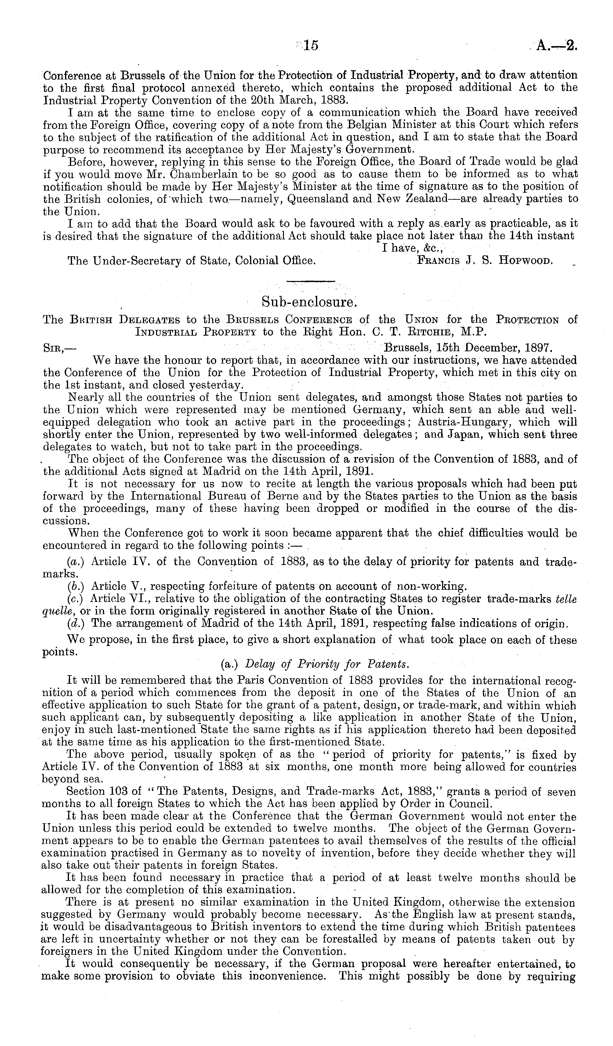 Sub-enclosure. The British Delegates to the Bbussels Conference of the Union for the Protection of Industrial Property to the Eight Hon. C. T. Eitchie, M.P. Sir, — Brussels, 15th December, 1897. We have the honour to report that, in accordance with our instructions, we have attended the Conference of the Union for the Protection of Industrial Property, which met in this city on the Ist instant, and closed yesterday. Nearly all the countries of the Union sent delegates, and amongst those States not parties to the Union which were represented may be mentioned Germany, which sent an able and wellequipped delegation who took an active part in the proceedings; Austria-Hungary, which will shortly enter the Union, represented by two well-informed delegates; and Japan, which sent three delegates to watch, but not to take part in the proceedings. The object of the Conference was the discussion of a revision of the Convention of 1883, and of the additional Acts signed at Madrid on the 14th April, 1891. It is not necessary for us now to recite at length the various proposals which had been put forward by the International Bureau of Berne and by the States parties to the Union as the basis of the proceedings, many of these having been dropped or modified in the course of the discussions. When the Conference got to work it soon became apparent that the chief difficulties would be encountered in regard to the following points : — (a.) Article IV. of the Convention of 1883, as to the delay of priority for patents and trademarks. (b.) Article V., respecting forfeiture of patents on account of non-working. (c.) Article "VI., relative to the obligation of the contracting States to register trade-marks telle quelle, or in the form originally registered in another State of the Union. (d.) The arrangement of Madrid of the 14th April, 1891, respecting false indications of origin. We propose, in the first place, to give a short explanation of what took place on each of these points. (a.) Delay of Priority for Patents. It will be remembered that the Paris Convention of 1883 provides for the international recognition of a period which commences from the deposit in one of the States of the Union of an effective application to such State for the grant of a patent, design, or trade-mark, and within which such applicant can, by subsequently depositing a like application in another State of the Union, enjoy in such last-mentioned State the same rights as if his application thereto had been deposited at the same time as his application to the first-mentioned State. The above period, usually spoken of as the " period of priority for patents," is fixed by Article IV. of the Convention of 1883 at six months, one month more being allowed for countries beyond sea. Section 103 of "The Patents, Designs, and Trade-marks Act, 1883," grants a period of seven months to all foreign States to which the Act has been applied by Order in Council. It has been made clear at the Conference that the German Government would not enter the Union unless this period could be extended to twelve months. The object of the German Government appears to be to enable the German patentees to avail themselves of the results of the official examination practised in Germany as to novelty of invention, before they decide whether they will also take out their patents in foreign States. It has been found necessary in practice that a period of at least twelve months should be allowed for the completion of this examination. There is at present no similar examination in the United Kingdom, otherwise the extension suggested by Germany would probably become necessary. Asthe English law at present stands, it would be disadvantageous to British inventors to extend the time during which British patentees are left in uncertainty whether or not they can be forestalled by means of patents taken out by foreigners in the United Kingdom under the Convention. It would consequently be necessary, if the German proposal were hereafter entertained, to make some provision to obviate this inconvenience. This might possibly be done by requiring