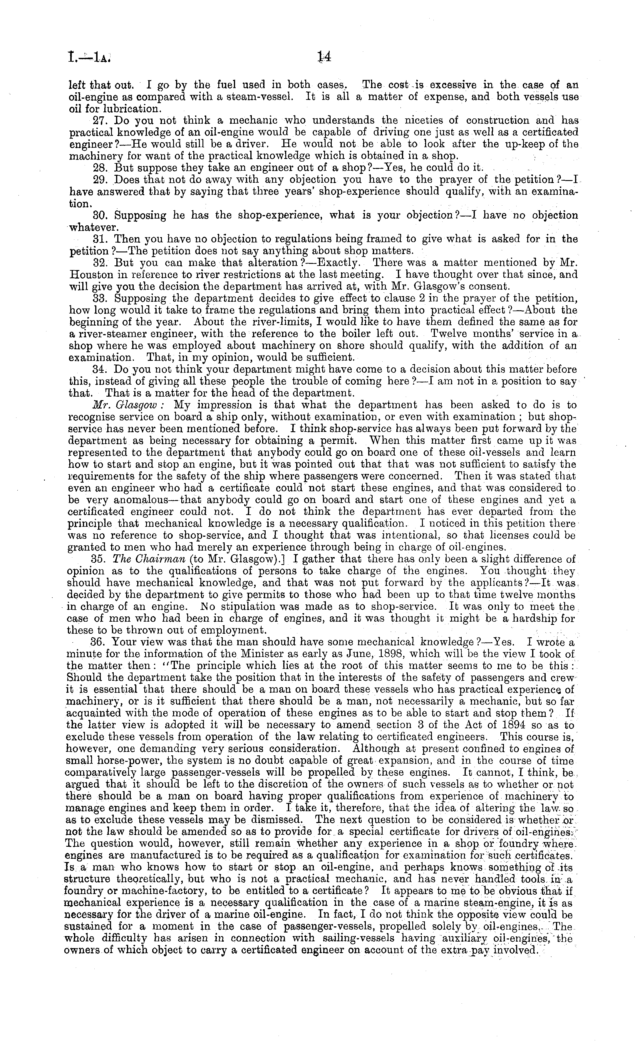 left that out. Igo by the fuel used in both cases. The cost is excessive in the case of an oil-engine as compared with a steam-vessel. It is all a matter of expense, and both vessels use oil for lubrication. 27. Do you not think a mechanic who understands the niceties of construction and has practical knowledge of an oil-engine would be capable of driving one just as well as a certificated engineer?—He would still be a driver. He would not be able to look after the up-keep of the machinery for want of the practical knowledge which is obtained in a shop. 28. But suppose they take an engineer out of a shop?— Yes, he could do it. 29. Does that not do away with any objection you have to the prayer of the petition ?—I have answered that by saying that three years' shop-experience should qualify, with an examination. 30. Supposing he has the shop-experience, what is your objection?—l have no objection whatever. 31. Then you have no objection to regulations being framed to give what is asked for in the petition ? —The petition does not say anything about shop matters. 32. But you can make that alteration? —Exactly. There was a matter mentioned by Mr. Houston in reference to river restrictions at the last meeting. I have thought over that since, and will give you the decision the department has arrived at, with Mr. Glasgow's consent. 33. Supposing the department decides to give effect to clause 2 in the prayer of the petition, how long would it take to frame the regulations and bring them into practical effect ?—About the beginning of the year. About the river-limits, I would like to have them defined the same as for a river-steamer engineer, with the reference to the boiler left out. Twelve months' service in a shop where he was employed about machinery on shore should qualify, with the addition of an examination. That, in my opinion, would be sufficient. 34. Do you not think your department might have come to a decision about this matter before this, instead of giving all these people the trouble of coming here ?—I am not in a position to say that. That is a matter for the head of the department. Mr. Glasgow : My impression is that what the department has been asked to do is to recognise service on board a ship only, without examination, or even with examination ; but service has never been mentioned before. I think shop-service has always been put forward by the department as being necessary for obtaining a permit. When this matter first came up it was represented to the department that anybody could go on board one of these oil-vessels and learn how to start and stop an engine, but it was pointed out that that was not sufficient to satisfy the requirements for the safety of the ship where passengers were concerned. Then it was stated that even an engineer who had a certificate could not start these engines, and that was considered to be very anomalous—that anybody could go on board and start one of these engines and yet a certificated engineer could not. I do not think the department has ever departed from the principle that mechanical knowledge is a necessary qualification. I noticed in this petition there was no reference to shop-service, and I thought that was intentional, so that licenses could be granted to men who had merely an experience through being in charge of oil-engines. 35. The Chairman (to Mr. Glasgow).] I gather that there has only been a slight difference of opinion as to the qualifications of persons to take charge of the engines. You thought they should have mechanical knowledge, and that was not put forward by the applicants?—lt was decided by the department to give permits to those who had been up to that time twelve months in charge of an engine. Mo stipulation was made as to shop-service. It was only to meet the. case of men who had been in charge of engines, and it was thought it might be a hardship for these to be thrown out of employment. . ...... 36. Your view was that the man should have some mechanical knowledge ?—Yes. I wrote a minute for the information of the Minister as early as June, 1898, which will be the view I took of the matter then: "The principle which lies at the root of this matter seems to me to be this : Should the department take the position that in the interests of the safety of passengers and crew it is essential that there should be a man on board these vessels who has practical experience of machinery, or is it sufficient that there should be a man, not necessarily a mechanic, but so far acquainted with the mode of operation of these engines as to be able to start and stop them? If the latter view is adopted it will be necessary to amend section 3 of the Act of 1894 so as to exclude these vessels from operation of the law relating to certificated engineers. This course is, however, one demanding very serious consideration. Although at present confined to engines of small horse-power, the system is no doubt capable of great expansion, and in the course of time comparatively large passenger-vessels will be propelled by these engines. It cannot, I think, be.. argued that it should be left to the discretion of the owners of such vessels as to whether or not there should be a man on board having proper qualifications from experience of machinery ■to manage engines and keep them in order. I take it, therefore, that the idea of altering the law. so as to exclude these vessels may be dismissed. The next question to be considered is whether or, not the law should be amended so as to provide for a special certificate for drivers of oil-engines:. ; The question would, however, still remain whether any experience in a shop or foundry where. engines are manufactured is to be required as a qualification for examination for such certificates. Is a man who knows how to start or stop an oil-engine, and perhaps knows something of .its structure theoretically, but who is not a practical mechanic, and has never handled tools, in a foundr