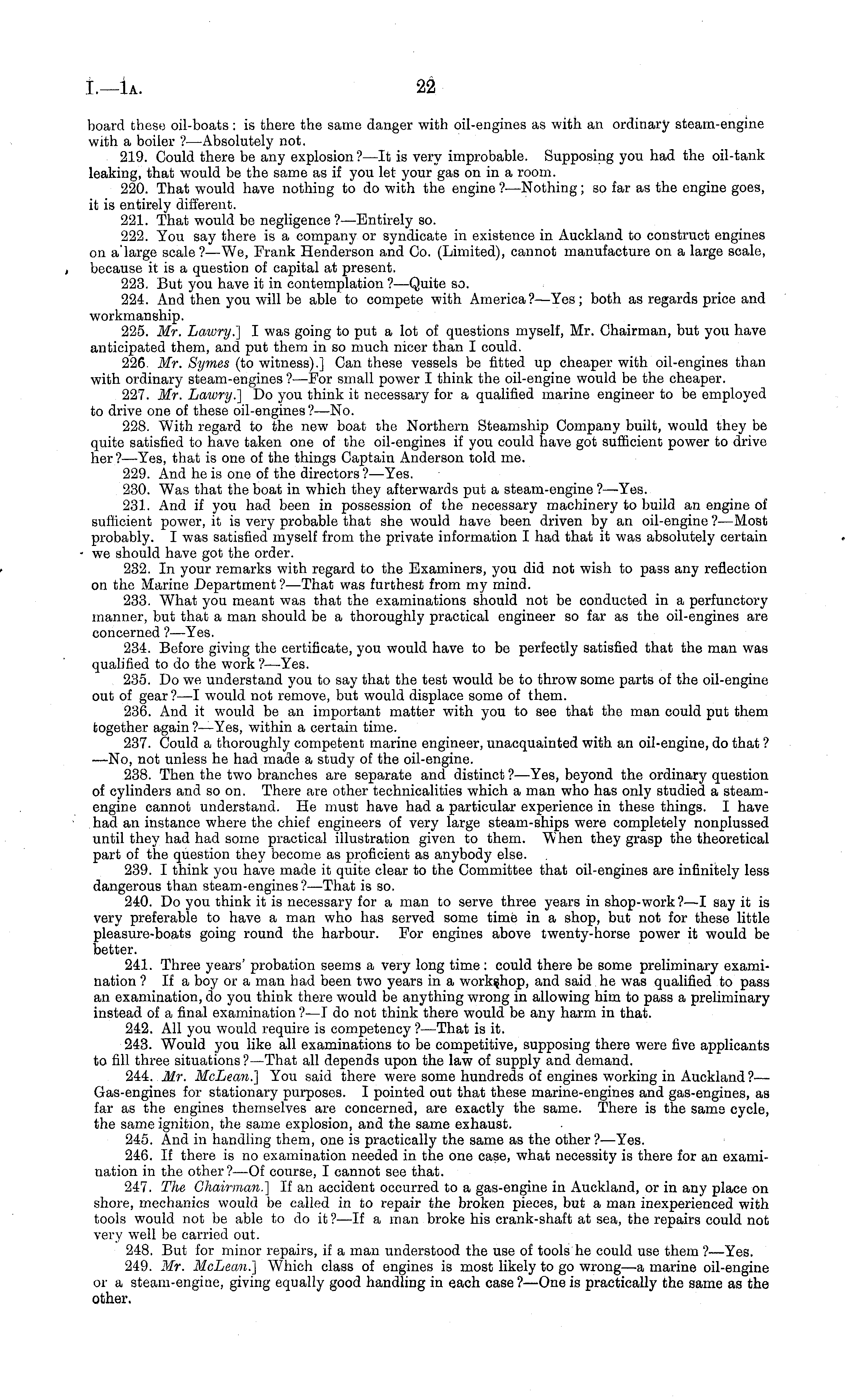 board these oil-boats: is there the same danger with oil-engines as with an ordinary steam-engine with a boiler ?—Absolutely not. 219. Could there be any explosion ?—lt is very improbable. Supposing you had the oil-tank leaking, that would be the same as if you let your gas on in a room. 220. That would have nothing to do with the engine ?—Nothing; so far as the engine goes, it is entirely different. 221. That would be negligence ? —Entirely so. 222. You say there is a company or syndicate in existence in Auckland to construct engines on a'large scale ? —We, Frank Henderson and Co. (Limited), cannot manufacture on a large scale, , because it is a question of capital at present. 223. But you have it in contemplation ?—Quite so. 224. And then you will be able to compete with America?—-Yes; both as regards price and workmanship. 225. Mr. Lawry.] I was going to put a lot of questions myself, Mr. Chairman, but you have anticipated them, and put them in so much nicer than I could. 226. Mr. Symes (to witness).] Can these vessels be fitted up cheaper with oil-engines than with ordinary steam-engines ?—For small power I think the oil-engine would be the cheaper. 227. Mr. Lawry.] Do you think it necessary for a qualified marine engineer to be employed to drive one of these oil-engines?— No. 228. With regard to the new boat the Northern Steamship Company built, would they be quite satisfied to have taken one of the oil-engines if you could have got sufficient power to drive her ?—Yes, that is one of the things Captain Anderson told me. 229. And he is one of the directors ?—Yes. 230. Was that the boat in which they afterwards put a steam-engine ?—Yes. 231. And if you had been in possession of the necessary machinery to build an engine of sufficient power, it is very probable that she would have been driven by an oil-engine ? —Most probably. I was satisfied myself from the private information I had that it was absolutely certain • we should have got the order. 232. In your remarks with regard to the Examiners, you did not wish to pass any reflection on the Marine Department? —That was furthest from my mind. 233. What you meant was that the examinations should not be conducted in a perfunctory manner, but that a man should be a thoroughly practical engineer so far as the oil-engines are concerned ?—Yes. 234. Before giving the certificate, you would have to be perfectly satisfied that the man was qualified to do the work ?—Yes. 235. Do we understand you to say that the test would be to throw some parts of the oil-engine out of gear?—l would not remove, but would displace some of them. 236. And it would be an important matter with you to see that the man could put them together again ?—Yes, within a certain time. 237. Could a thoroughly competent marine engineer, unacquainted with an oil-engine, do that ? —No, not unless he had made a study of the oil-engine. 238. Then the two branches are separate and distinct ?—Yes, beyond the ordinary question of cylinders and so on. There are other technicalities which a man who has only studied a steamengine cannot understand. He must have had a particular experience in these things. I have had an instance where the chief engineers of very large steam-ships were completely nonplussed until they had had some practical illustration given to them. When they grasp the theoretical part of the question they become as proficient as anybody else. 239. I think you have made it quite clear to the Committee that oil-engines are infinitely less dangerous than steam-engines?— That is so. 240. Do you think it is necessary for a man to serve three years in shop-work ?—I say it is very preferable to have a man who has served some time in a shop, but not for these little pleasure-boats going round the harbour. For engines above twenty-horse power it would be better. 241. Three years' probation seems a very long time : could there be some preliminary examination ? If a boy or a man had been two years in a workshop, and said he was qualified to pass an examination, do you think there would be anything wrong in allowing him to pass a preliminary instead of a final examination ? —I do not think there would be any harm in that. 242. All you would require is competency? —That is it. 243. Would you like all examinations to be competitive, supposing there were five applicants to fill three situations? —That all depends upon the law of supply and demand. 244. Mr. McLean.] You said there were some hundreds of engines working in Auckland ?— Gas-engines for stationary purposes. I pointed out that these marine-engines and gas-engines, as far as the engines themselves are concerned, are exactly the same. There is the same cycle, the same ignition, the same explosion, and the same exhaust. 245. And in handling them, one is practically the same as the other ?—Yes. 246. If there is no examination needed in the one case, what necessity is there for an examination in the other?—Of course, I cannot see that. 247. The Chairman.] If an accident occurred to a gas-engine in Auckland, or in any place on shore, mechanics would be called in to repair the broken pieces, but a man inexperienced with tools would not be able to do it?—lf a man broke his crank-shaft at sea, the repairs could not very well be carried out. 248. But for minor repairs, if a man understood the use of tools he could use them ?—Yes. 249. Mr. McLean.] Which class of engines is most likely to go wrong—a marine oil-engine or a steam-engine, giving equally good handling in each case?— One is practically the same as the other.