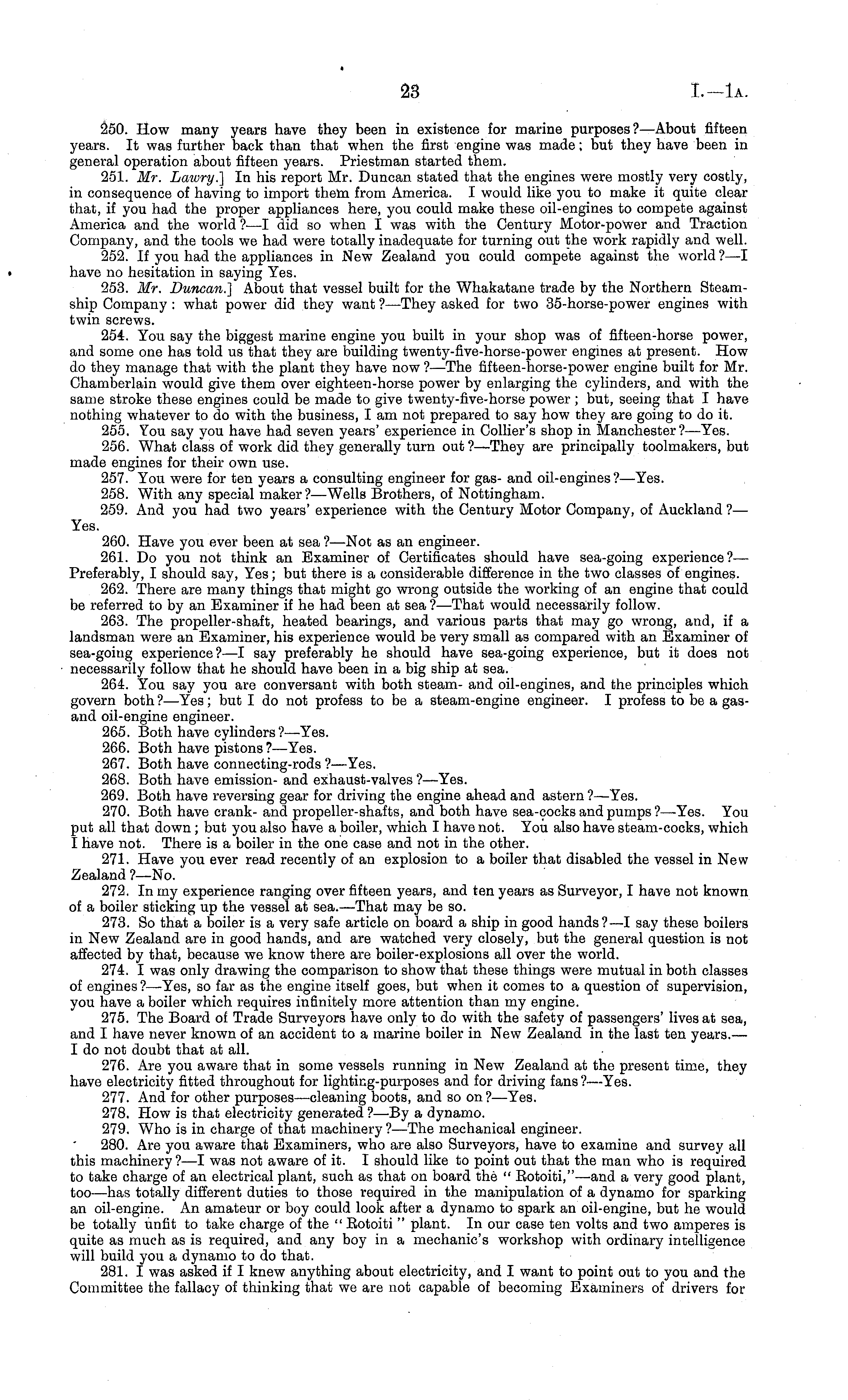 250. How many years have they been in existence for marine purposes?— About fifteen years. It was further back than that when the first engine was made; but they have been in general operation about fifteen years. Priestman started them. 251. Mr. Lawry.] In his report Mr. Duncan stated that the engines were mostly very costly, in consequence of having to import them from America. I would like you to make it quite clear that, if you had the proper appliances here, you could make these oil-engines to compete against America and the world ? —I did so when I was with the Century Motor-power and Traction Company, and the tools we had were totally inadequate for turning out the work rapidly and well. 252. If you had the appliances in New Zealand you could compete against the world? —I have no hesitation in saying Yes. 253. Mr. Duncan.] About that vessel built for the Whakatane trade by the Northern Steamship Company : what power did they want ? —They asked for two 35-horse-power engines with twin screws. 254. You say the biggest marine engine you built in your shop was of fifteen-horse power, and some one has told us that they are building twenty-five-horse-power engines at present. How do they manage that with the plant they have now ? —The fifteen-horse-power engine built for Mr. Chamberlain would give them over eighteen-horse power by enlarging the cylinders, and with the same stroke these engines could be made to give twenty-five-horse power ; but, seeing that I have nothing whatever to do with the business, I am not prepared to say how they are going to do it. 255. You say you have had seven years' experience in Collier's shop in Manchester? —Yes. 256. What class of work did they generally turn out ? —They are principally toolmakers, but made engines for their own use. 257. You were for ten years a consulting engineer for gas- and oil-engines?— Yes. 258. With any special maker?— Wells Brothers, of Nottingham. 259. And you had two years' experience with the Century Motor Company, of Auckland ?— Yes. 260. Have you ever been at sea ?—Not as an engineer. 261. Do you not think an Examiner of Certificates should have sea-going experience?— Preferably, I should say, Yes; but there is a considerable difference in the two classes of engines. 262. There are many things that might go wrong outside the working of an engine that could be referred to by an Examiner if he had been at sea ? —That would necessarily follow. 263. The propeller-shaft, heated bearings, and various parts that may go wrong, and, if a landsman were an Examiner, his experience would be very small as compared with an Examiner of sea-going experience?—l say preferably he should have sea-going experience, but it does not necessarily follow that he should have been in a big ship at sea. 264. You say you are conversant with both steam- and oil-engines, and the principles which govern both ?—Yes; but I do not profess to be a steam-engine engineer. I profess to be a gasand oil-engine engineer. 265. Both have cylinders?— Yes. 266. Both have pistons ?—Yes. 267. Both have connecting-rods ?—Yes. 268. Both have emission- and exhaust-valves ?—Yes. 269. Both have reversing gear for driving the engine ahead and astern ? —Yes. 270. Both have crank- and propeller-shafts, and both have sea-cocks and pumps ?—Yes. You put all that down; but you also have a boiler, which I have not. You also have steam-cocks, which I have not. There is a boiler in the one case and not in the other. 271. Have you ever read recently of an explosion to a boiler that disabled the vessel in New Zealand ?—No. 272. In my experience ranging over fifteen years, and ten years as Surveyor, I have not known of a boiler sticking up the vessel at sea.—That may be so. 273. So that a boiler is a very safe article on board a ship in good hands?—l say these boilers in New Zealand are in good hands, and are watched very closely, but the general question is not affected by that, because we know there are boiler-explosions all over the world. 274. I was only drawing the comparison to show that these things were mutual in both classes of engines ? —Yes, so far as the engine itself goes, but when it comes to a question of supervision, you have a boiler which requires infinitely more attention than my engine. 275. The Board of Trade Surveyors have only to do with the safety of passengers' lives at sea, and I have never known of an accident to a marine boiler in New Zealand in the last ten years.— I do not doubt that at all. 276. Are you aware that in some vessels running in New Zealand at the present time, they have electricity fitted throughout for lighting-purposes and for driving fans?— Yes. 277. And for other purposes—cleaning boots, and so on?— Yes. 278. How is that electricity generated ?—-By a dynamo. 279. Who is in charge of that machinery ?—The mechanical engineer. 280. Are you aware that Examiners, who are also Surveyors, have to examine and survey all this machinery ? —I was not aware of it. I should like to point out that the man who is required to take charge of an electrical plant, such as that on board the " Botoiti," —and a very good plant, too —has totally different duties to those required in the manipulation of a dynamo for sparking an oil-engine. An amateur or boy could look after a dynamo to spark an oil-engine, but he would be totally unfit to take charge of the " Eotoiti " plant. In our case ten volts and two amperes is quite as much as is required, and any boy in a mechanic's workshop with ordinary intelligence will build you a dynamo to do that. 281. I was asked if I knew anything about electricity, and I want to point out to you and the Committee the fallacy of thinking that we are not capable of becoming Examiners of drivers for