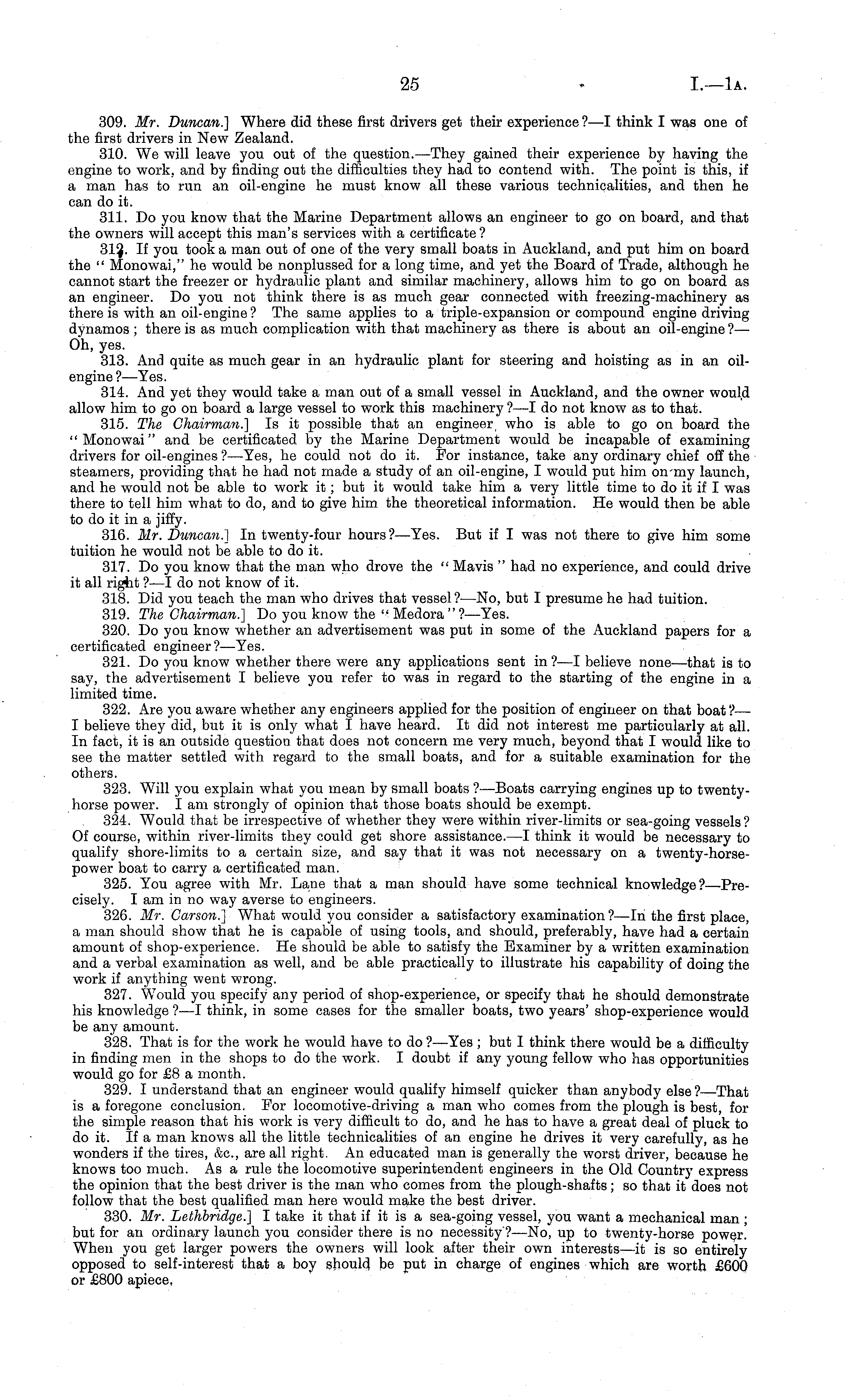 309. Mr. Duncan.] Where did these first drivers get their experience ?—I think I was one of the first drivers in New Zealand. 310. We will leave you out of the question.—They gained their experience by having the engine to work, and by finding out the difficulties they had to contend with. The point is this, if a man has to run an oil-engine he must know all these various technicalities, and then he can do it. 311. Do you know that the Marine Department allows an engineer to go on board, and that the owners will accept this man's services with a certificate ? If you took a man out of one of the very small boats in Auckland, and put him on board the " Monowai," he would be nonplussed for a long time, and yet the Board of Trade, although he cannot start the freezer or hydraulic plant and similar machinery, allows him to go on board as an engineer. Do you not think there is as much gear connected with freezing-machinery as there is with an oil-engine ? The same applies to a triple-expansion or compound engine driving dynamos ; there is as much complication with that machinery as there is about an oil-engine ?— Oh, yes. 313. And quite as much gear in an hydraulic plant for steering and hoisting as in an oilengine?— Yes. 314. And yet they would take a man out of a small vessel in Auckland, and the owner would allow him to go on board a large vessel to work this machinery?—-I do not know as to that. 315. The Chairman.] Is it possible that an engineer, who is able to go on board the "Monowai" and be certificated by the Marine Department would be incapable of examining drivers for oil-engines ? —Yes, he could not do it. For instance, take any ordinary chief off the steamers, providing that he had not made a study of an oil-engine, I would put him on'iny launch, and he would not be able to work it; but it would take him a very little time to do it if I was there to tell him what to do, and to give him the theoretical information. He would then be able to do it in a jiffy. 316. Mr. Duncan.] In twenty-four hours?— Yes. But if I was not there to give him some tuition he would not be able to do it. 317. Do you know that the man who drove the " Mavis " had no experience, and could drive it all right ?—I do not know of it. 318. Did you teach the man who drives that vessel?—No, but I presume he had tuition. 319. The Chairman.] Do you know the "Medora"?—Yes. 320. Do you know whether an advertisement was put in some of the Auckland papers for a certificated engineer? —Yes. 321. Do you know whether there were any applications sent in? —I believe none—that is to say, the advertisement I believe you refer to was in regard to the starting of the engine in a limited time. 322. Are you aware whether any engineers applied for the position of engineer on that boat ?— I believe they did, but it is only what I have heard. It did not interest me particularly at all. In fact, it is an outside question that does not concern me very much, beyond that I would like to see the matter settled with regard to the small boats, and for a suitable examination for the others. 323. Will you explain what you mean by small boats ? —Boats carrying engines up to twentyhorse power. lam strongly of opinion that those boats should be exempt. 324. Would that be irrespective of whether they were within river-limits or sea-going vessels? Of course, within river-limits they could get shore assistance.—l think it would be necessary to qualify shore-limits to a certain size, and say that it was not necessary on a twenty-horse-power boat to carry a certificated man. 325. You agree with Mr. Lane that a man should have some technical knowledge?— Precisely. lamin no way averse to engineers. 326. Mr. Carson.] What would you consider a satisfactory examination?—ln the first place, a man should show that he is capable of using tools, and should, preferably, have had a certain amount of shop-experience. He should be able to satisfy the Examiner by a written examination and a verbal examination as well, and be able practically to illustrate his capability of doing the work if anything went wrong. 327. Would you specify any period of shop-experience, or specify that he should demonstrate his knowledge ? —I think, in some cases for the smaller boats, two years' shop-experience would be any amount. 328. That is for the work he would have to do ?—Yes ; but I think there would be a difficulty in finding men in the shops to do the work. I doubt if any young fellow who has opportunities would go for £8 a month. 329. I understand that an engineer would qualify himself quicker than anybody else ? That is a foregone conclusion. For locomotive-driving a man who comes from the plough is best, for the simple reason that his work is very difficult to do, and he has to have a great deal of pluck to do it. If a man knows all the little technicalities of an engine he drives it very carefully, as he wonders if the tires, &c, are all right. An educated man is generally the worst driver, because he knows too much. As a rule the locomotive superintendent engineers in the Old Country express the opinion that the best driver is the man who comes from the plough-shafts; so that it does not follow that the best qualified man here would make the best driver. 330. Mr. Lethbridge.] I take it that if it is a sea-going vessel, you want a mechanical man ; but for an ordinary launch you consider there is no necessity?—No, up to twenty-horse power. When you get larger powers the owners will look after their own interests—it is so entirely opposed to self-interest that a boy should be put in charge of engines which are worth £600 or £800 apiece,