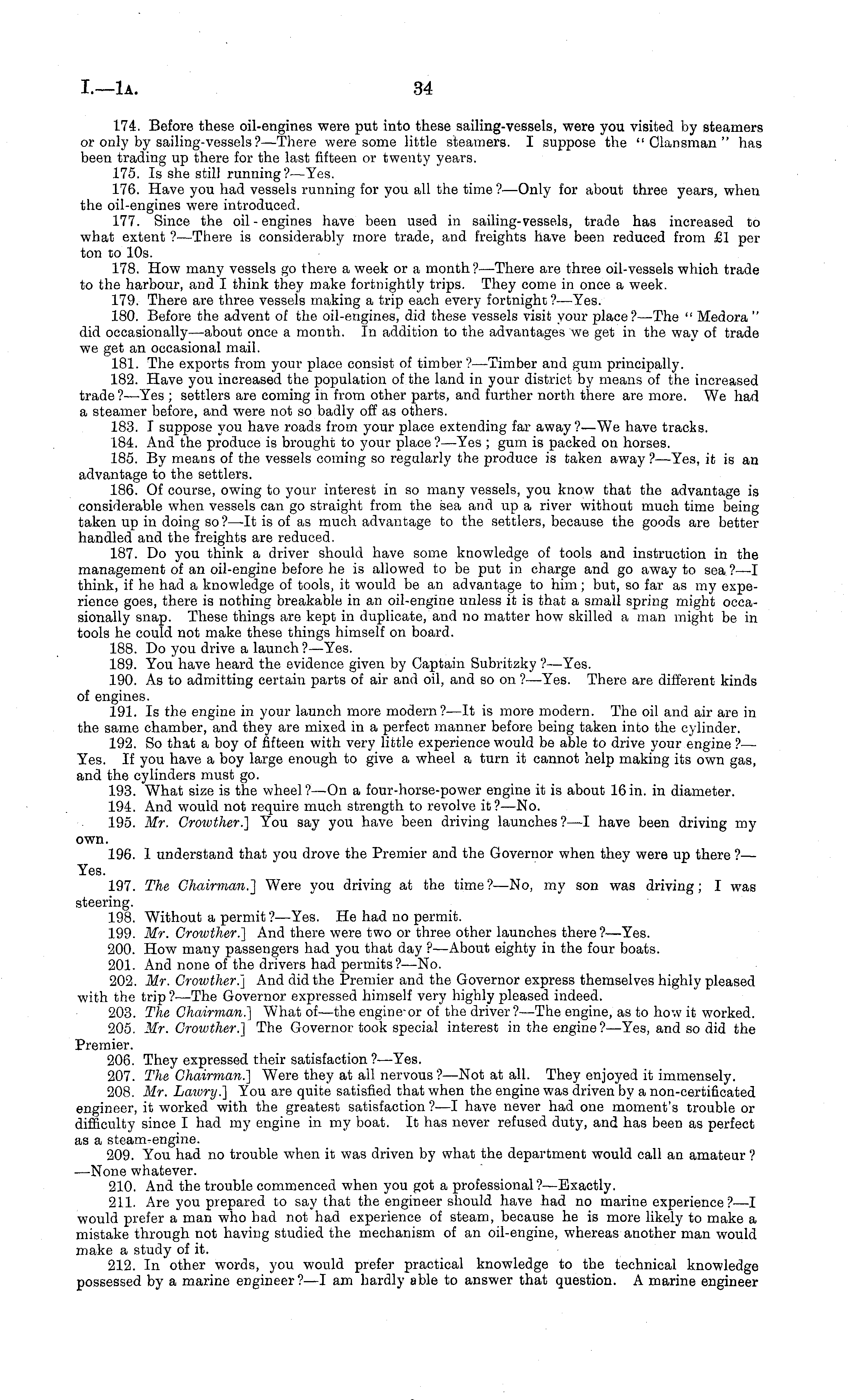 174. Before these oil-engines were put into these sailing-vessels, were you visited by steamers or only by sailing-vessels ?—There were some little steamers. I suppose the "Clansman" has been trading up there for the last fifteen or twenty years. 175. Is she still running?— Yes. 176. Have you had vessels running for you all the time ?—Only for about three years, when the oil-engines were introduced. 177. Since the oil-engines have been used in sailing-vessels, trade has increased to what extent ?—There is considerably more trade, and freights have been reduced from £1 per ton to 10s. 178. How many vessels go there a week or a month ?—There are three oil-vessels which trade to the harbour, and I think they make fortnightly trips. They come in once a week. 179. There are three vessels making a trip each every fortnight ?—Yes. 180. Before the advent of the oil-engines, did these vessels visit your place?— The " Medora " did occasionally—about once a month. In addition to the advantages we get in the wav of trade we get an occasional mail. 181. The exports from your place consist of timber ?—Timber and gum principally. 182. Have you increased the population of the land in your district by means of the increased trade ? —Yes ; settlers are coming in from other parts, and further north there are more. We had a steamer before, and were not so badly off as others. 183. I suppose you have roads from your place extending far away?—We have tracks. 184. And the produce is brought to your place ?—Yes ; gum is packed on horses. 185. By means of the vessels coming so regularly the produce is taken away ?—Yes, it is an advantage to the settlers. 186. Of course, owing to your interest in so many vessels, you know that the advantage is considerable when vessels can go straight from the sea and up a river without much time being taken up in doing so ?—lt is of as much advantage to the settlers, because the goods are better handled and the freights are reduced. 187. Do you think a driver should have some knowledge of tools and instruction in the management of an oil-engine before he is allowed to be put in charge and go away to sea ?—I think, if he had a knowledge of tools, it would be an advantage to him; but, so far as my experience goes, there is nothing breakable in an oil-engine unless it is that a small spring might occasionally snap. These things are kept in duplicate, and no matter how skilled a man might be in tools he could not make these things himself on board. 188. Do you drive a launch ? —Yes. 189. You have heard the evidence given by Captain Subritzky ?—Yes. 190. As to admitting certain parts of air and oil, and so on ?—Yes. There are different kinds of engines. 191. Is the engine in your launch more modern ?—lt is more modern. The oil and air are in the same chamber, and they are mixed in a perfect manner before being taken into the cylinder. 192. So that a boy of fifteen with very little experience would be able to drive your engine ?— Yes. If you have a boy large enough to give a wheel a turn it cannot help making its own gas, and the cylinders must go. 193. What size is the wheel?—On a four-horse-power engine it is about 16in. in diameter. 194. And would not require much strength to revolve it?— No. 195. Mr. Croivther.] You say you have been driving launches?—l have been driving my own. 196. 1 understand that you drove the Premier and the Governor when they were up there ?— Yes. 197. The Chairman.'] Were you driving at the time?—No, my son was driving; I was steering. 198. Without a permit ? —Yes. He had no permit. 199. Mr. Crowther.] And there were two or three other launches there ?—Yes. 200. How many passengers had you that day ? —About eighty in the four boats. 201. And none of the drivers had permits ?—No. 202. Mr. Growther.] And did the Premier and the Governor express themselves highly pleased with the trip ?—The Governor expressed himself very highly pleased indeed. 203. The Chairman.] What of —the engine or of the driver ?—The engine, as to how it worked. 205. Mr. Croivther.] The Governor took special interest in the engine ?—Yes, and so did the Premier. 206. They expressed their satisfaction ?—Yes. 207. The Chairman.] Were they at all nervous ?—Not at all. They enjoyed it immensely. 208. Mr. Laivry.] You are quite satisfied that when the engine was driven by a non-certificated engineer, it worked with the greatest satisfaction ?—I have never had one moment's trouble or difficulty since I had my engine in my boat. It has never refused duty, and has been as perfect as a steam-engine. 209. You had no trouble when it was driven by what the department would call an amateur ? —-None whatever. 210. And the trouble commenced when you got a professional?— Exactly. 211. Are you prepared to say that the engineer should have had no marine experience?—l would prefer a man who had not had experience of steam, because he is more likely to make a mistake through not having studied the mechanism of an oil-engine, whereas another man would make a study of it. 212. In other words, you would prefer practical knowledge to the technical knowledge possessed by a marine engineer? —I am hardly able to answer that question. A marine engineer