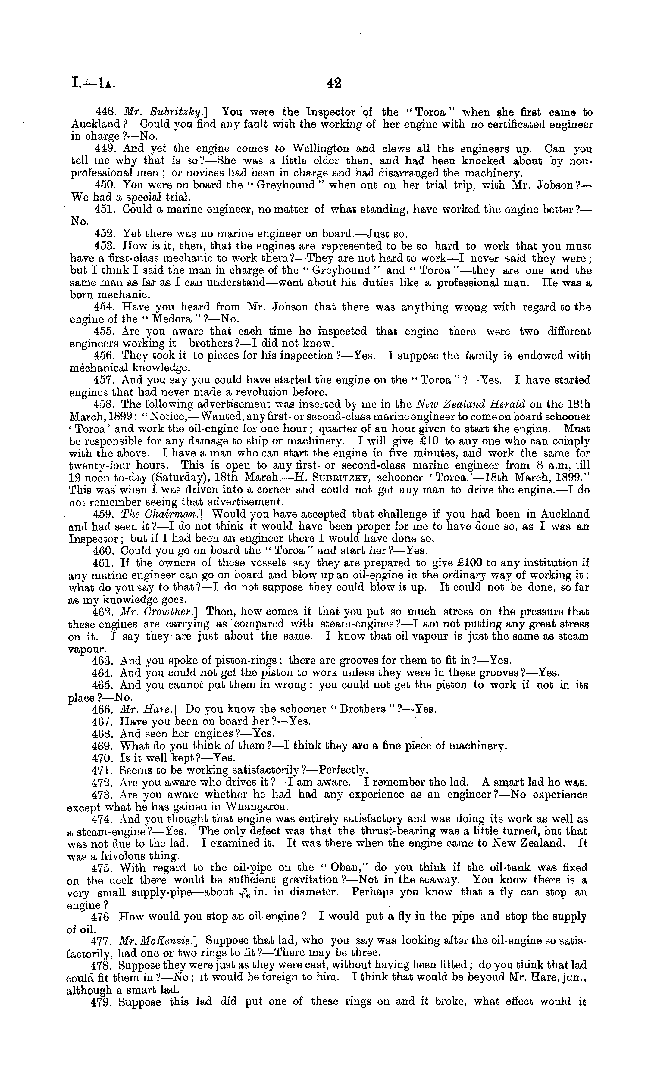 448. Mr. Subritzky .] You were the Inspector of the "Toroa" when she first came to Auckland ? Could you find any fault with the working of her engine with no certificated engineer in charge ?—No. 449. And yet the engine comes to Wellington and clews all the engineers up. Can you tell me why that is so?— She was a little older then, and had been knocked about by nonprofessional men ; or novices had been in charge and had disarranged the machinery. 450. You were on board the " Greyhound " when out on her trial trip, with Mr. Jobson?— We had a special trial. 451. Could a marine engineer, no matter of what standing, have worked the engine better?— No. 452. Yet there was no marine engineer on board.—Just so. 453. How is it, then, that the engines are represented to be so hard to work that you must have a first-class mechanic to work them?— They are not hard to work—l never said they were; but I think I said the man in charge of the " Greyhound " and " Toroa " —they are one and the same man as far as I can understand—went about his duties like a professional man. He was a born mechanic. 454. Have you heard from Mr. Jobson that there was anything wrong with regard to the engine of the " Medora " ?—No. 455. Are you aware that each time he inspected that engine there were two different engineers working it—brothers ?—I did not know. 456. They took it to pieces for his inspection ?—Yes. I suppose the family is endowed with mechanical knowledge. 457. And you say you could have started the engine on the " Toroa " ?—Yes. I have started engines that had never made a revolution before. 458. The following advertisement was inserted by me in the New Zealand Herald on the 18th March, 1899: "Notice, —Wanted, any first-or second-class marine engineer to come on board schooner ' Toroa' and work the oil-engine for one hour; quarter of an hour given to start the engine. Must be responsible for any damage to ship or machinery. I will give £10 to any one who can comply with the above. I have a man who can start the engine in five minutes, and work the same for twenty-four hours. This is open to any first- or second-class marine engineer from 8 a.m, till 12 noon to-day (Saturday), 18th March.—H. Subeitzky, schooner ' Toroa.'—lßth March, 1899." This was when I was driven into a corner and could not get any man to drive the engine.—-I do not remember seeing that advertisement. 459. The Chairman.] Would you have accepted that challenge if you had been in Auckland and had seen it ?—I do not think it would have been proper for me to have done so, as I was an Inspector; but if I had been an engineer there I would have done so. 460. Could you go on board the " Toroa " and start her?— Yes. 461. If the owners of these vessels say they are prepared to give £100 to any institution if any marine engineer can go on board and blow up an oil-engine in the ordinary way of working it; what do you say to that? —I do not suppose they could blow it up. It could not be done, so far as my knowledge goes. 462. Mr. Growther.] Then, how comes it that you put so much stress on the pressure that these engines are carrying as compared with steam-engines ?—I am not putting any great stress on it. I say they are just about the same. I know that oil vapour is just the same as steam vapour. 463. And you spoke of piston-rings: there are grooves for them to fit in?— Yes. 464. And you could not get the piston to work unless they were in these grooves ?—Yes. 465. And you cannot put them in wrong : you could not get the piston to work if not in its place ? —No. 466. Mr. Hare.] Do you know the schooner " Brothers " ?—Yes. 467. Have you been on board her?— Yes. 468. And seen her engines ? —Yes. 469. What do you think of them ?—I think they are a fine piece of machinery. 470. Is it well kept ?—Yes. 471. Seems to be working satisfactorily?— Perfectly. 472. Are you aware who drives it ? —I am aware. I remember the lad. A smart lad he was. 473. Are you aware whether he had had any experience as an engineer?—No experience except what he has gained in Whangaroa. 474. And you thought that engine was entirely satisfactory and was doing its work as well as a steam-engine? —Yes. The only defect was that the thrust-bearing was a little turned, but that was not due to the lad. I examined it. It was there when the engine came to New Zealand. It was a frivolous thing. 475. With regard to the oil-pipe on the " Oban," do you think if the oil-tank was fixed on the deck there would be sufficient gravitation ?—Not in the seaway. You know there is a very small supply-pipe—about T \ in. in diameter. Perhaps you know that a fly can stop an engine ? 476. How would you stop an oil-engine ?—I would put a fly in the pipe and stop the supply of oil. 477. Mr. McKenzie.] Suppose that lad, who you say was looking after the oil-engine so satisfactorily, had one or two rings to fit ? —There may be three. 478. Suppose they were just as they were cast, without having been fitted ; do you think that lad could fit them in ?—No; it would be foreign to him. I think that would be beyond Mr. Hare, jun., although a smart lad. 479. Suppose this lad did put one of these rings on and it broke, what effect would it