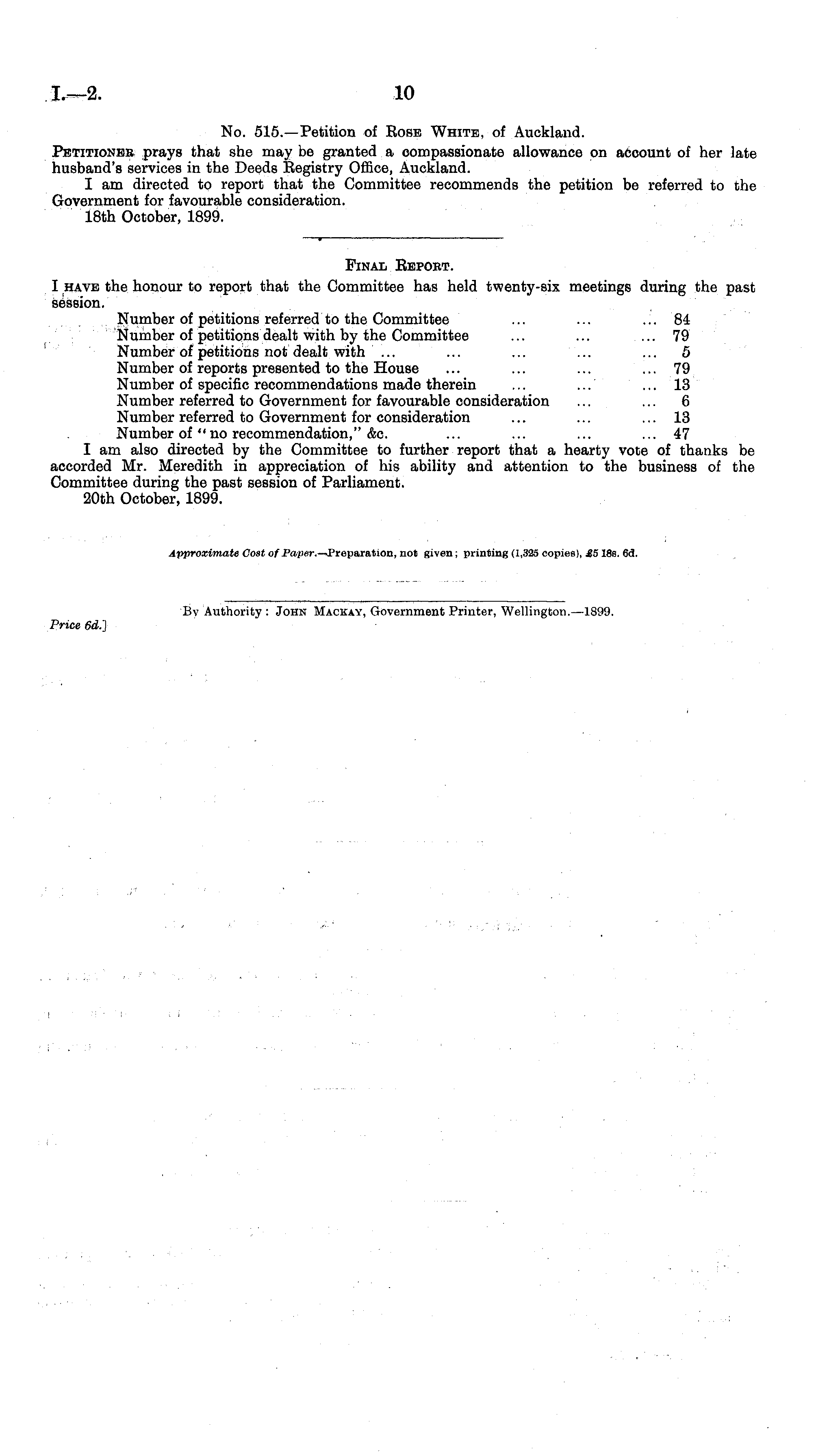 No. 515.—Petition of Eose White, of Auckland. Petitionee prays that she may be granted a compassionate allowance on account of her late husband's services in the Deeds Registry Office, Auckland. I am directed to report that the Committee recommends the petition be referred to the Government for favourable consideration. 18th October, 1899.