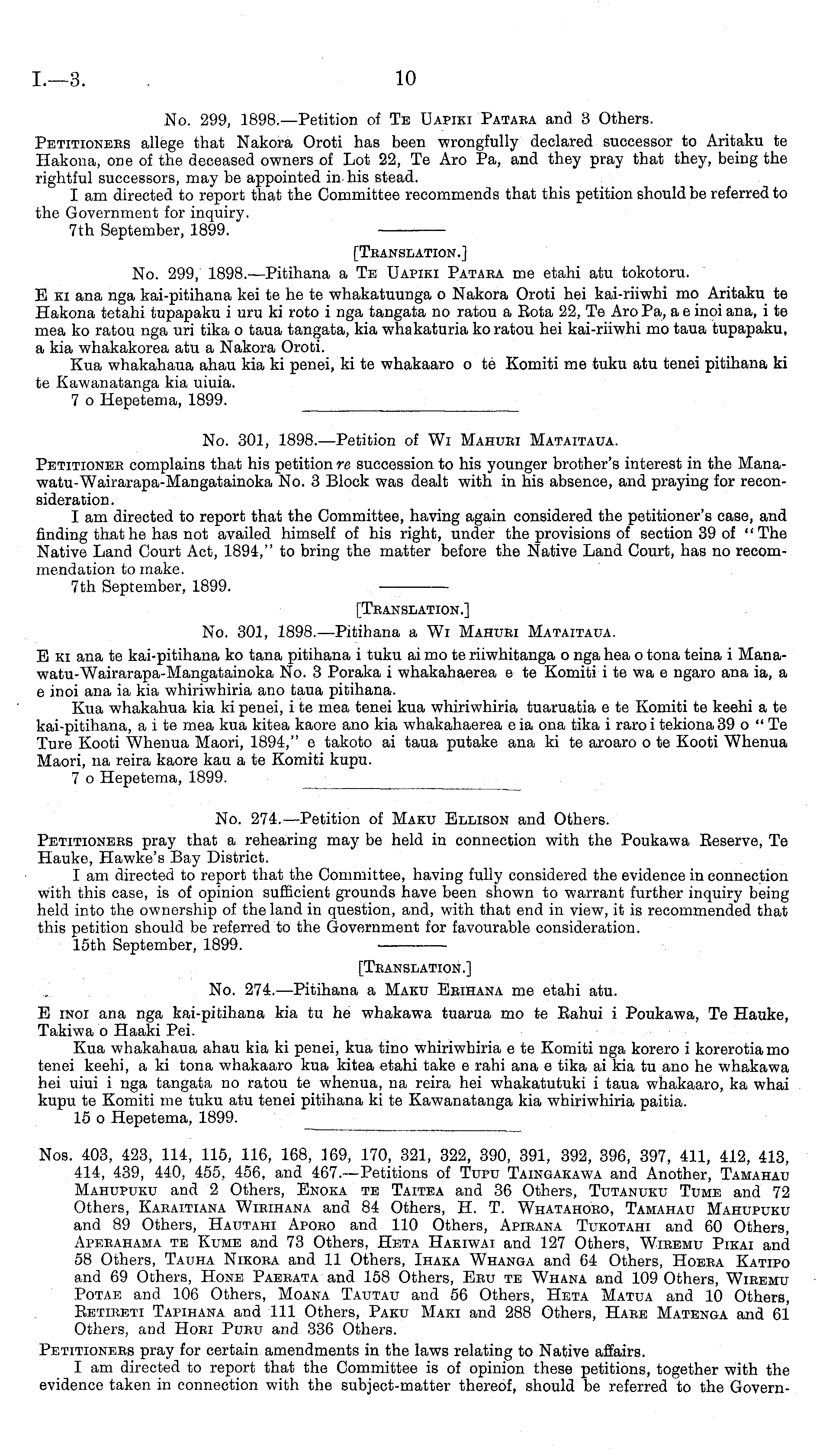 [Teanslation.] No. 301, 1898.—Pitihana a Wi Mahuei Mataitaua. E ki ana te kai-pitihana ko tana pitihana i tuku ai mo te riiwhitanga o nga hea o tona teina i Mana-watu-Wairarapa-Mangatainoka No. 3 Poraka i whakahaerea c te Komiti i te wa c ngaro ana ia, a c inoi ana ia kia whiriwhiria ano taua pitihana. Kua whakahua kia ki penei, i te mea tenei kua whiriwhiria tuaruatia c te Komiti te keehi a te kai-pitihana, a i te mea kua kitea kaore ano kia whakahaerea c ia ona tika i raro i tekiona 39 o " Te Ture Kooti Whenua Maori, 1894," c takoto ai taua putake ana kite aroaro o te Kooti Whenua Maori, na reira kaore kau a te Komiti kupu. 7 o Hepetema, 1899.