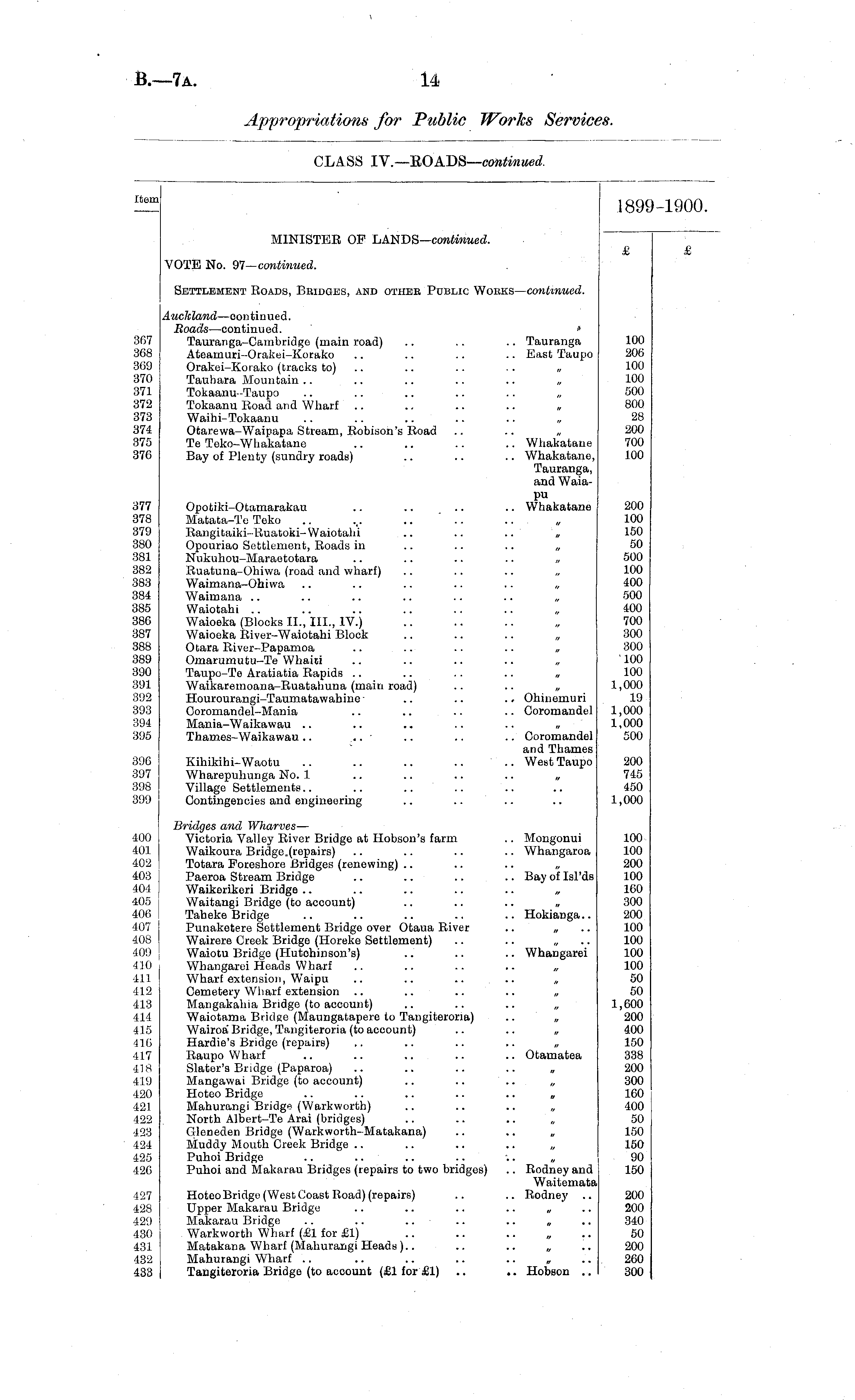 Item .189' -1900. MINISTER OP LANDS— continued. e VOTE No. 97— continued. Settlement Roads, Bbidqes, and other Public Works — continued. 367 368 360 370 371 372 373 374 375 376 S77 S7H (79 580 181 182 183 184 186 186 187 SSH 189 (90 S91 192 (93 194 195 Auckland —oontinued. Roads —continu ed. Tauranga-Cambridge (main road) .. .. .. Tauranga Ateamuri-Orakei-Korako .. .. .. .. East Taupo Orakei-Korako (tracks to) .. .. .. „ Tauhara Mountain .. .. .. .. .. „ Tokaanu-Taupo Tokaanu Road and Wharf .. .. .. .. „ Waihi-Tokaanu Otarewa-Waipapa Stream, Robison's Road .. .. „ Te Teko-Wbakatane .. .. .. .. Whakatane Bay of Plenty (sundry roads) .. .. .. Whakatane, Tauranga, and Waiapu Opotiki-Otamarakau .. .. .. .. Whakatane Matata-Te Teko .. ._. .. .. .. „ Rangitaiki-Ruatoki-Waiotahi .. .. .. „ Opouriao Settlement, Roads in .. .. .. „ Nukuhou-Maraetotara .. .. .. .. ,, Ruatuna-Ohiwa (road and wharf) .. .. .. „ Waimana-Ohiwa Waimana .. .. .. .. .. .. „ Waiotahi Waioeka (Blocks II., III., IV.) Waioeka River-Waiotahi Block Otara River-Papamoa .. .. .. .. „ Omarumutu-Te Whaiti .. .. .. .. „ Taupo-Te Aratiatia Rapids .. .. .. .. „ Waikaremoana-Ruatahuna (main road) .. .. „ Hourourangi-Taumatawahine- .. .. .. Ohinemuri Goromandcl-Mania .. .. .. .. Goromandel Mania-Waikawau .. .. .. .. .. „ Thames-Waikawau .. .. .. .. .. Goromandel and Thames Kihikihi-Waotu .. .. .. .. .. West Taupo Wharepuhunga No. 1 .. .. .. .. „ Village Settlements Contingencies and engineering 100 206 100 100 500 800 28 200 700 100 200 100 150 50 500 100 400 500 400 700 300 300 100 100 1,000 10 1,000 1,000 500 196 197 198 199 200 745 450 1,000 400 401 402 403 404 405 406 407 408 409 410 411 412 413 414 415 416 417 418 419 420 421 422 423 424 425 426 Bridges and Wharves — Victoria Valley River Bridge at Hobson's farm .. Mongonui Waikoura Bridge.(ropairs) .. .. .. .. Whangaroa Totara Foreshore Bridges (renewing) .. .. .. „ Paeroa Stream Bridge .. .. .. .. Bay of Isl'ds Waikerikeri Bridge .. .. .. .. .. „ Waitangi Bridge (to account) Taheke Bridge .. .. .. .. .. Hokianga.. Punaketere Settlement Bridge over Otaua River .. „ Wairere Creek Bridge (Horeke Settlement) .. .. „ Waiotu Bridge (Hutchinson's) .. .. .. Whangarei Whangarei Heads Wharf .. .. .. .. „ Wharf extension, Waipu .. .. .. .. „ Cemetery Wharf extension .. .. .. .. „ Mangakahia Bridge (to account) .. .. .. „ Waiotama Bridge (Maungatapere to Tangiterona) .. „ Wairoa Bridge, Tangiteroria (to account) .. .. „ Hardie's Bridge (repairs) .. .. .. .. „ Raupo Wharf .. .. .. .. .. Otamatea Slater's Bridge (Paparoa) .. .. .. .. „ Mangawai Bridge (to account) .. .. .. „ Hoteo Bridge .. .. .. .. .. „ Mahurangi Bridge (Warkworth) .. .. .. „ North Albert-Te Arai (bridges) .. .. .. „ Gleneden Bridge (Warkworth-Matakana) .. .. „ Muddy Mouth Creek Bridge .. .. .. .. „ Puhoi Bridge .. .. .. .. -.. „ Puhoi and Makafau Bridges (repairs to two bridges) .. Rodney and Waiteniata Hoteo Bridge (West Coast Road) (repairs) .. .. Rodney .. Upper Makarau Bridge .. .. .. .. „ Makarau Bridge .. .. .. .. .. „ Warkworth Wharf (£1 for £1) Matakana Wharf (Mahurangi Heads).. .. .. „ Mahurangi Wharf .. .. .. .. .. „ Tangiteroria Bridge (to account (£1 for £1) .. .. Hobson .. 100 100 200 100 160 300 200 100 100 100 100 50 50 1,600 200 400 150 338 200 300 160 400 50 150 150 00 150 427 428 429 430 431 432 433 200 200 340 50 200 260 300