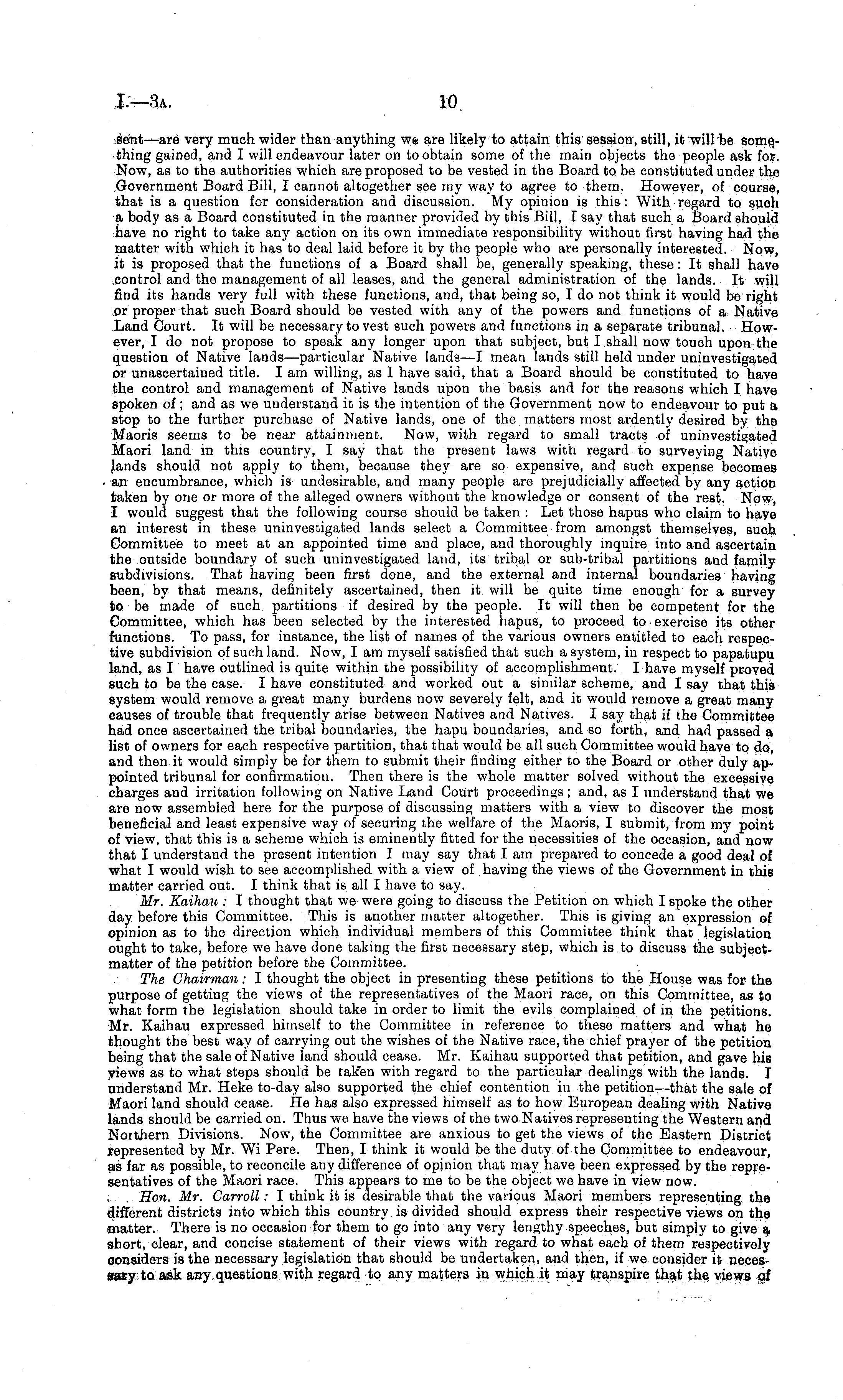 sent—are very much wider than anything w& are likely to attain this session, still, it will be something gained, and I will endeavour later on to obtain some of the main objects the people ask for. Now, as to the authorities which are proposed to be vested in the Board to be constituted under the Government Board Bill, I cannot altogether see my way to agree to them. However, of course, that is a question for consideration and discussion. My opinion is this : With regard to such a body as a Board constituted in the manner provided by this Bill, I say that such a Board should have no right to take any action on its own immediate responsibility without first having had the matter with which it has to deal laid before it by the people who are personally interested. Now, it is proposed that the functions of a Board shall be, generally speaking, these: It shall have .control and the management of all leases, and the general administration of the lands. It will find its hands very full with these functions, and, that being so, I do not think it would be right ;or proper that such Board should be vested with any of the powers and functions of a Native Land Court. It will be necessary to vest such powers and functions in a separate tribunal. However, I do not propose to speak any longer upon that subject, but I shall now touch upon the question of Native lands—particular Native lands—l mean lands still held under uninvestigated or unascertained title. lam willing, as 1 have said, that a Board should be constituted to have the control and management of Native lands upon the basis and for the reasons which I have spoken of; and as we understand it is the intention of the Government now to endeavour to put a stop to the further purchase of Native lands, one of the matters most ardently desired by the Maoris seems to be near attainment. Now, with regard to small tracts of uninvestigated Maori land in this country, I say that the present laws with regard to surveying Native lands should not apply to them, because they are so expensive, and such expense becomes an encumbrance, which is undesirable, and many people are prejudicially affected by any action taken by one or more of the alleged owners without the knowledge or consent of the rest. Now, I would suggest that the following course should be taken : Let those hapus who claim to have an interest in these uninvestigated lands select a Committee from amongst themselves, such Committee to meet at an appointed time and place, and thoroughly inquire into and ascertain the outside boundary of such uninvestigated land, its tribal or sub-tribal partitions and family subdivisions. That having been first done, and the external and internal boundaries having been, by that means, definitely ascertained, then it will be quite time enough for a survey to be made of such partitions if desired by the people. It will then be competent for the Committee, which has been selected by the interested hapus, to proceed to exercise its other functions. To pass, for instance, the list of names of the various owners entitled to each respective subdivision of such land. Now, I am myself satisfied that such a system, in respect to papatupu land, as I have outlined is quite within the possibility of accomplishment. I have myself proved such to be the case. I have constituted and worked out a similar scheme, and I say that this system would remove a great many burdens now severely felt, and it would remove a great many causes of trouble that frequently arise between Natives and Natives. I say that if the Committee had once ascertained the tribal boundaries, the hapu boundaries, and so forth, and had passed a list of owners for each respective partition, that that would be all such Committee would have to do, and then it would simply be for them to submit their finding either to the Board or other duly appointed tribunal for confirmation. Then there is the whole matter solved without the excessive charges and irritation following on Native Land Court proceedings; and, as I understand that we are now assembled here for the purpose of discussing matters with a view to discover the most beneficial and least expensive way of securing the welfare of the Maoris, I submit, from my point of view, that this is a scheme which is eminently fitted for the necessities of the occasion, and now that I understand the present intention I may say that I am prepared to concede a good deal of what I would wish to see accomplished with a view of having the views of the Government in this matter carried out. I think that is all I have to say. Mr. Kaihau : I thought that we were going to discuss the Petition on which I spoke the other day before this Committee. This is another matter altogether. This is giving an expression of opinion as to the direction which individual members of this Committee think that legislation ought to take, before we have done taking the first necessary step, which is to discuss the subjectmatter of the petition before the Committee. The Chairman: I thought the object in presenting these petitions to the House was for the purpose of getting the views of the representatives of the Maori race, on this Committee, as to what form the legislation should take in order to limit the evils complained of in the petitions. Mr. Kaihau expressed himself to the Committee in reference to these matters and what he thought the best way of carrying out the wishes of the Native race, the chief prayer of the petition being that the sale of Native land should cease. Mr. Kaihau supported that petition, and gave his views as to what steps should be taken with regard to the particular dealings with the lands. I understand Mr. Heke to-day also supported the chief contention in the petition—that the sale of Maori land should cease. He has also expressed himself as to how European dealing with Native lands should be carried on. Thus we have the views of the two Natives representing the Wester