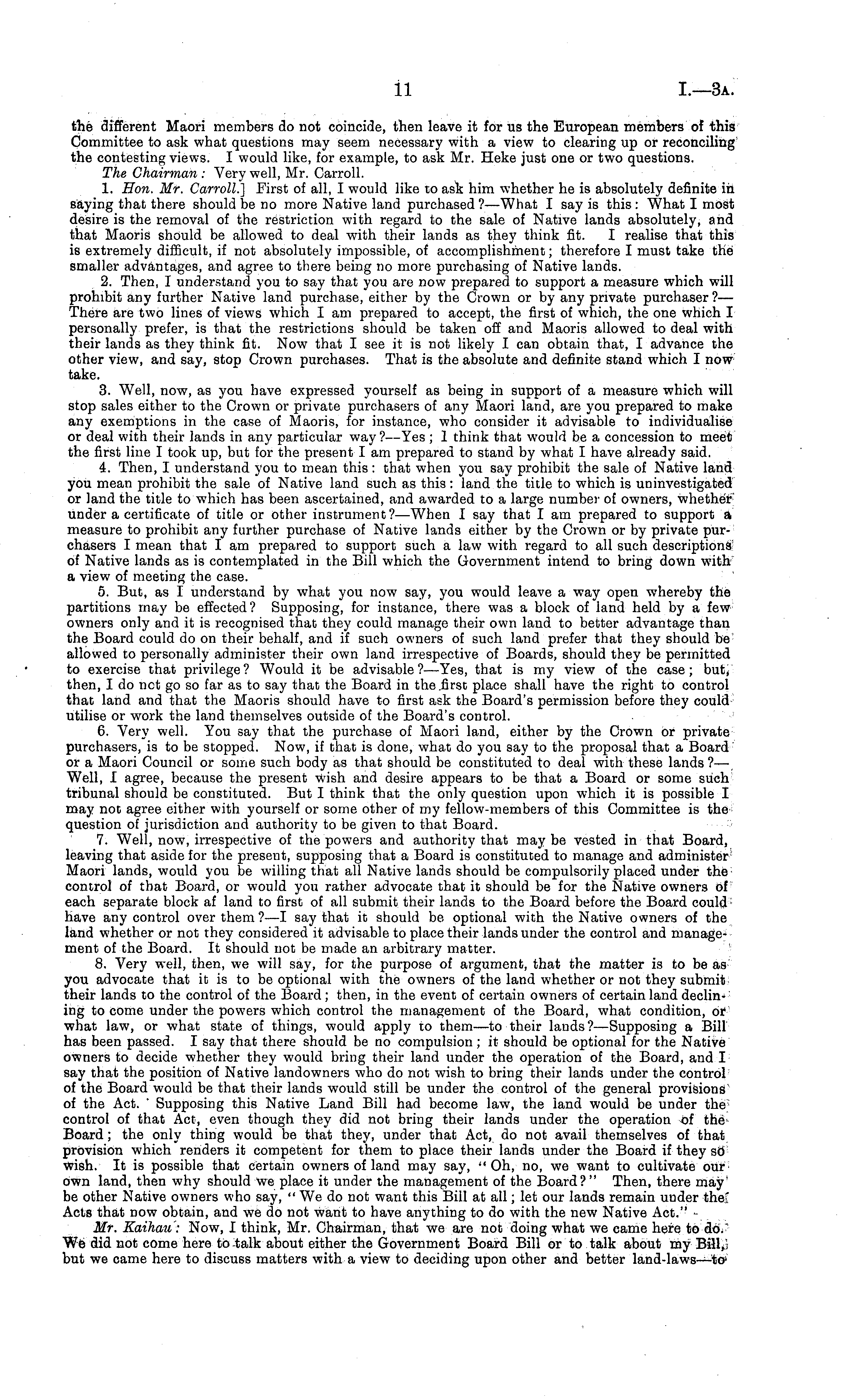 the different Maori members do not coincide, then leave it for us the European members of this Committee to ask what questions may seem necessary with a view to clearing up or reconciling the contesting views. I would like, for example, to ask Mr. Heke just one or two questions. The Chairman : Very well, Mr. Carroll. 1. Hon. Mr. Carroll.] First of all, I would like to ask him whether he is absolutely definite in saying that there should be no more Native land purchased ? —What I say is this: What I most desire is the removal of the restriction with regard to the sale of Native lands absolutely, and that Maoris should be allowed to deal with their lands as they think fit. I realise that this is extremely difficult, if not absolutely impossible, of accomplishment; therefore I must take the smaller advantages, and agree to there being no more purchasing of Native lands. 2. Then, I understand you to say that you are now prepared to support a measure which will prohibit any further Native land purchase, either by the Crown or by any private purchaser ?— There are two lines of views which I am prepared to accept, the first of which, the one which I personally prefer, is that the restrictions should be taken off and Maoris allowed to deal with their lands as they think fit. Now that I see it is not likely I can obtain that, I advance the other view, and say, stop Crown purchases. That is the absolute and definite stand which I now take. 3. Well, now, as you have expressed yourself as being in support of a measure which will stop sales either to the Crown or private purchasers of any Maori land, are you prepared to make any exemptions in the case of Maoris, for instance, who consider it advisable to individualise or deal with their lands in any particular way ? —Yes ; 1 think that would be a concession to meet the first line I took up, but for the present I am prepared to stand by what I have already said. 4. Then, I understand you to mean this : that when you say prohibit the sale of Native land you mean prohibit the sale of Native land such as this: land the title to which is uninvestigated or land the title to which has been ascertained, and awarded to a large number of owners, whether under a certificate of title or other instrument?— When I say that lam prepared to support a measure to prohibit any further purchase of Native lands either by the Crown or by private purchasers I mean that I am prepared to support such a law with regard to all such descriptions' of Native lands as is contemplated in the Bill which the Government intend to bring down with a view of meeting the case. 5. But, as I understand by what you now say, you would leave a way open whereby the partitions may be effected? Supposing, for instance, there was a block of land held by a few owners only and it is recognised that they could manage their own land to better advantage than the Board could do on their behalf, and if such owners of such land prefer that they should be allowed to personally administer their own land irrespective of Boards, should they be permitted to exercise that privilege ? Would it be advisable ?—Yes, that is my view of the case; but* then, I do net go so far as to say that the Board in the .first place shall have the right to control that land and that the Maoris should have to first ask the Board's permission before they could utilise or work the land themselves outside of the Board's control. 6. Very well. You say that the purchase of Maori land, either by the Crown or private purchasers, is to be stopped. Now, if that is done, what do you say to the proposal that a Board or a Maori Council or some such body as that should be constituted to deal with these lands ?— Well, I agree, because the present wish and desire appears to be that a Board or some such tribunal should be constituted. But I think that the only question upon which it is possible I may not agree either with yourself or some other of my fellow-members of this Committee is the question of jurisdiction and authority to be given to that Board. 7. Well, now, irrespective of the powers and authority that may be vested in that Board, leaving that aside for the present, supposing that a Board is constituted to manage and administer Maori lands, would you be willing that all Native lands should be compulsorily placed under the control of that Board, or would you rather advocate that it should be for the Native owners of each separate block af land to first of all submit their lands to the Board before the Board could have any control over them?—l say that it should be optional with the Native owners of the land whether or not they considered it advisable to place their lands under the control and management of the Board. It should not be made an arbitrary matter. 8. Very well, then, we will say, for the purpose of argument, that the matter is to be as you advocate that it is to be optional with the owners of the land whether or not they submit their lands to the control of the Board; then, in the event of certain owners of certain land declining to come under the powers which control the management of the Board, what condition, of' what law, or what state of things, would apply to them—to their lands?— Supposing a Bill has been passed. I say that there should be no compulsion; it should be optional for the Native owners to decide whether they would bring their land under the operation of the Board, and I say that the position of Native landowners who do not wish to bring their lands under the control of the Board would be that their lands would still be under the control of the general provisions of the Act. ' Supposing this Native Land Bill had become law, the land would be under the control of that Act, even though they did not bring their lands under the operation of the Board; the only thing would be that they, under that Act, do not avail themselves of that provision which renders it competent for them to place their 