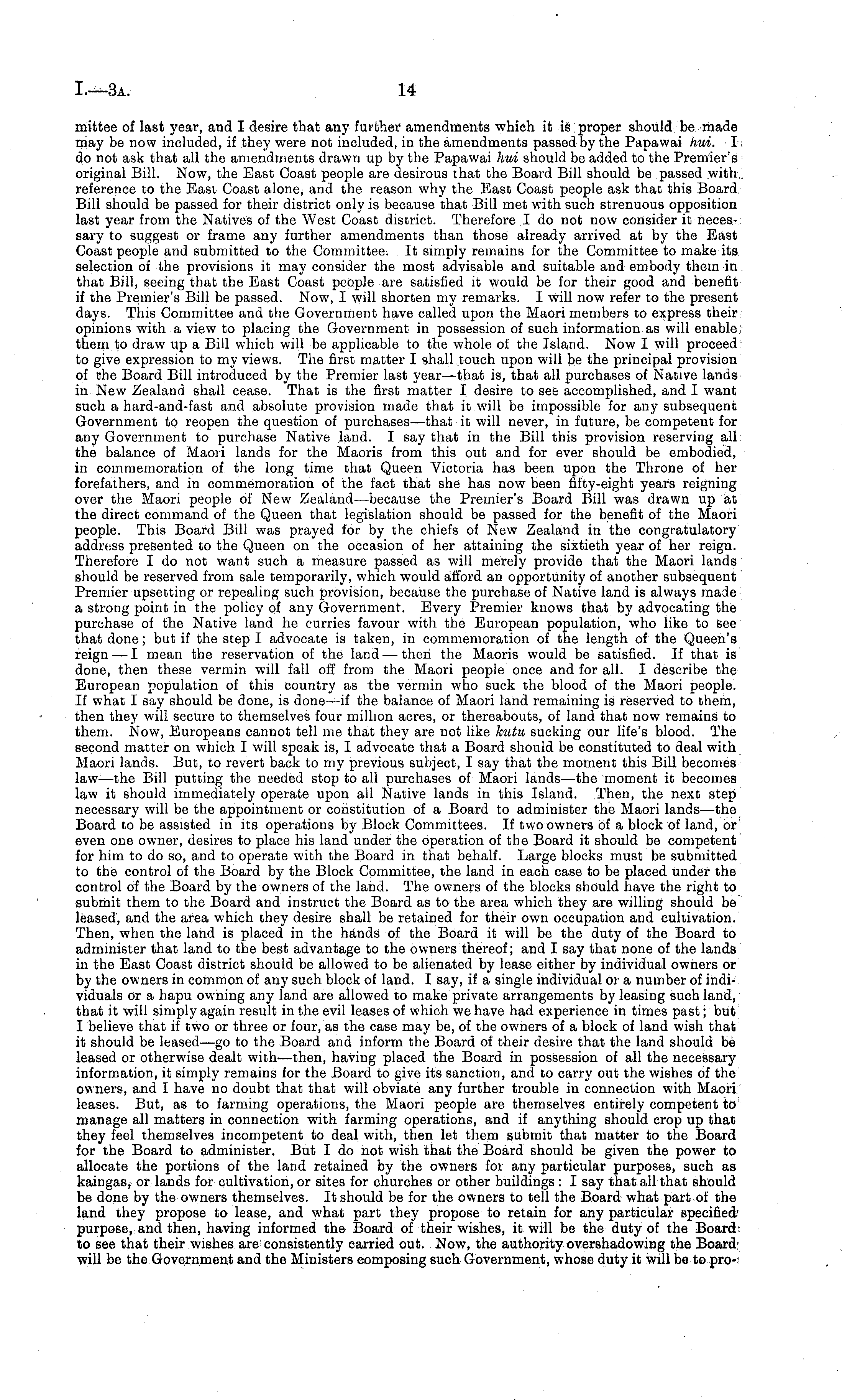 mittee of last year, and I desire that any further amendments which it is proper should be made may be now included, if they were not included, in the amendments passed by the Papawai hui. I do not ask that all the amendments drawn up by the Papawai hui should be added to the Premier's original Bill. Now, the East Coast people are desirous that the Board Bill should be passed with reference to the East Coast alone; and the reason why the East Coast people ask that this Board Bill should be passed for their district only is because that Bill met with such strenuous opposition last year from the Natives of the West Coast district. Therefore Ido not now consider it necessary to suggest or frame any further amendments than those already arrived at by the East Coast people and submitted to the Committee. It simply remains for the Committee to make its selection of the provisions it may consider the most advisable and suitable and embody them in that Bill, seeing that the East Coast people are satisfied it would be for their good and benefit if the Premier's Bill be passed. Now, I will shorten my remarks. I will now refer to the present days. This Committee and the Government have called upon the Maori members to express their opinions with a view to placing the Government in possession of such information as will enable them to draw up a Bill which will be applicable to the whole of the Island. Now I will proceed to give expression to my views. The first matter I shall touch upon will be the principal provision of the Board Bill introduced by the Premier last year—that is, that all purchases of Native lands in New Zealand shall cease. That is the first matter I desire to see accomplished, and I want such a hard-and-fast and absolute provision made that it will be impossible for any subsequent Government to reopen the question of purchases—that it will never, in future, be competent for any Government to purchase Native land. I say that in the Bill this provision reserving all the balance of Maori lands for the Maoris from this out and for ever should be embodied, in commemoration of the long time that Queen Victoria has been upon the Throne of her forefathers, and in commemoration of the fact that she has now been fifty-eight years reigning over the Maori people of New Zealand—because the Premier's Board Bill was drawn up at the direct command of the Queen that legislation should be passed for the benefit of the Maori people. This Board Bill was prayed for by the chiefs of New Zealand in the congratulatory address presented to the Queen on the occasion of her attaining the sixtieth year of her reign. Therefore I do not want such a measure passed as will merely provide that the Maori lands should be reserved from sale temporarily, which would afford an opportunity of another subsequent Premier upsetting or repealing such provision, because the purchase of Native land is always made a strong point in the policy of any Government. Every Premier knows that by advocating the purchase of the Native land he curries favour with the European population, who like to see that done; but if the step I advocate is taken, in commemoration of the length of the Queen's reign—l mean the reservation of the land-—then the Maoris would be satisfied. If that is done, then these vermin will fall off from the Maori people once and for all. I describe the European population of this country as the vermin who suck the blood of the Maori people. If what I say should be done, is done—if the balance of Maori land remaining is reserved to them, then they will secure to themselves four million acres, or thereabouts, of land that now remains to them. Now, Europeans cannot tell me that they are not like kutu sucking our life's blood. The second matter on which I will speak is, I advocate that a Board should be constituted to deal with Maori lands. But, to revert back to my previous subject, I say that the moment this Bill becomes law—the Bill putting the needed stop to all purchases of Maori lands—the moment it becomes law it should immediately operate upon all Native lands in this Island. Then, the next step necessary will be the appointment or constitution of a Board to administer the Maori lands—the Board to be assisted in its operations by Block Committees. If twoowners of a block of land, or even one owner, desires to place his land under the operation of the Board it should be competent for him to do so, and to operate with the Board in that behalf. Large blocks must be submitted to the control of the Board by the Block Committee, the land in each case to be placed under the control of the Board by the owners of the land. The owners of the blocks should have the right to submit them to the Board and instruct the Board as to the area which they are willing should be leased, and the area which they desire shall be retained for their own occupation and cultivation. Then, when the land is placed in the hands of the Board it will be the duty of the Board to administer that land to the best advantage to the owners thereof; and I say that none of the lands in the East Coast district should be allowed to be alienated by lease either by individual owners or by the owners in common of any such block of land. I say, if a single individual or a number of individuals or a hapu owning any land are allowed to make private arrangements by leasing such land, that it will simply again result in the evil leases of which we have had experience in times past; but I believe that if two or three or four, as the case may be, of the owners of a block of land wish that it should be leased—go to the Board and inform the Board of their desire that the land should be leased or otherwise dealt with—then, having placed the Board in possession of all the necessary information, it simply remains for the Board to give its sanction, and to carry out the wishes of the owners, and I have no doubt that that will obviate any further tr