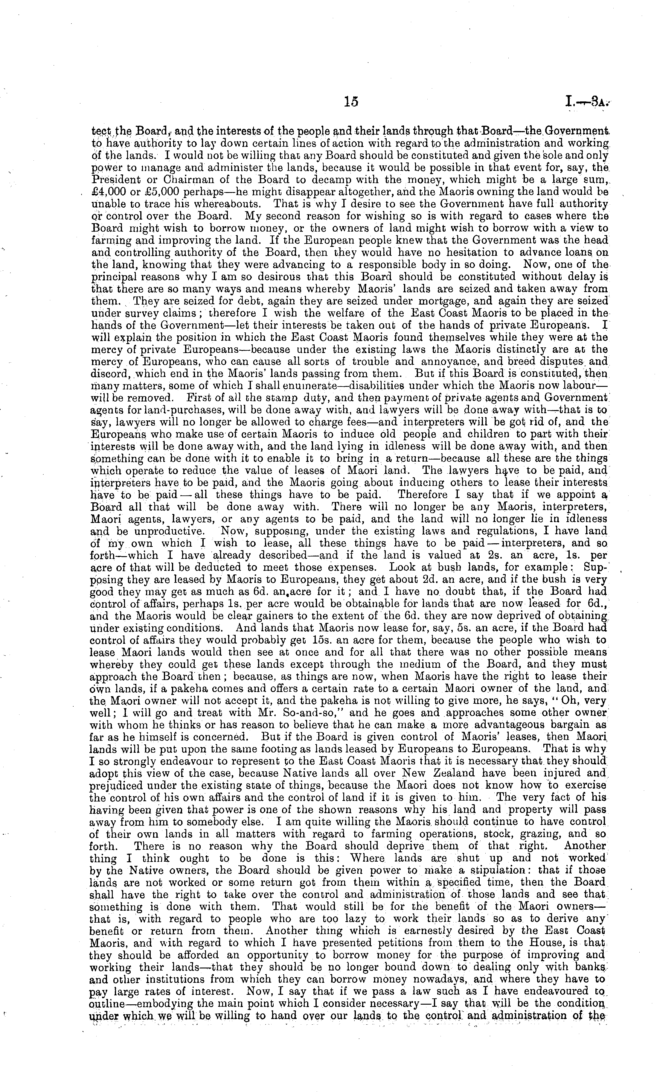 tectJhe Board, and the interests of the people and their lands through that Board —the Government to have authority to lay down certain lines of action with regard to the administration and working of the lands. I would not be willing that any Board should be constituted and given the sole and only power to manage and administer the lands, because it would be possible in that event for, say, the President or Chairman of the Board to decamp with the money, which might be a large sum, £4,000 or £5,000 perhaps—he might disappear altogether, and the Maoris owning the land would be unable to trace his whereabouts. That is why I desire to see the Government have full authority or control over the Board. My second reason for wishing so is with regard to cases where the Board might wish to borrow money, or the owners of land might wish to borrow with a view to farming and improving the land. If the European people knew that the Government was the head and controlling authority of the Board, then they would have no hesitation to advance loans on the land, knowing that they were advancing to a responsible body in so doing. Now, one of the principal reasons why I am so desirous that this Board should be constituted without delay is that there are so many ways and means whereby Maoris' lands are seized and taken away from them. They are seized for debt, again they are seized under mortgage, and again they are seized under survey claims ; therefore I wish the welfare of the East Coast Maoris to be placed in the hands of the Government —let their interests be taken out of the hands of private Europeans. I will explain the position in which the East Coast Maoris found themselves while they were at the mercy of private Europeans—because under the existing laws the Maoris distinctly are at the mercy of Europeans, who can cause all sorts of trouble and annoyance, and breed disputes and discord, which end in the Maoris' lands passing from them. But if this Board is constituted, then many matters, some of which I shall enumerate—disabilities under which the Maoris now labour— will be removed. First of all the stamp duty, and then payment of private agents and Government agents for land-purchases, will be done away with, and lawyers will be done away with—that is to say, lawyers will no longer be allowed to charge fees —and interpreters will be got) rid of, and the Europeans who make use of certain Maoris to induce old people and children to part with their interests will be done away with, and the land lying in idleness will be done away with, and then something can be done with it to enable it to bring in a return —because all these are the things which operate to reduce the value of leases of Maori land. The lawyers have to be paid, and interpreters have to be paid, and the Maoris going, about inducing others to lease their interests have to be paid — all these things have to be paid. Therefore I say that if we appoint a Board all that will be done away with. There will no longer be any Maoris, interpreters, Maori agents, lawyers, or any agents to be paid, and the land will no longer lie in idleness and be unproductive. Now, supposing, under the existing laws and regulations, I have land of my own which I wish to lease, all these things have to be paid — interpreters, and so forth—which I have already described —and if the land is valued at 2s. an acre, Is. per acre of that will be deducted to meet those expenses. Look at bush lands, for example: Supposing they are leased by Maoris to Europeans, they get about 2d. an acre, and if the bush is very good they may get as much as 6d. an,acre for it; and I have no doubt that, if the Board had control of affairs, perhaps Is..per acre would be obtainable for lands that are now leased for 6d., and the Maoris would be clear gainers to the extent of the 6d. they are now deprived of obtaining under existing conditions. And lands that Maoris now lease for, say, ss. an acre, if the Board had control of affairs they would probably get 15s. an acre for them, because the people who wish to lease Maori lands would then see at once and for all that there was no other possible means whereby they could get these lands except through the medium of the Board, and they must approach the Board then; because, as things are now, when Maoris have the right to lease their own lands, if a pakeha comes and offers a certain rate to a certain Maori owner of the land, and the Maori owner will not accept it, and the pakeha is not willing to give more, he says, " Oh, very well; 1 will go and treat with Mr. So-and-so," and he goes and approaches some other owner with whom he thinks or has reason to believe that he can make a more advantageous bargain as far as he himself is concerned. But if the Board is given control of Maoris' leases, then Maori, lands will be put upon the same footing as lands leased by Europeans to Europeans. That is why I so strongly endeavour to represent to the East Coast Maoris that it is necessary that they should, adopt this view of the case, because Native lands all over New Zealand have been injured and prejudiced under the existing state of things, because the Maori does not know how to exercise the control of his own affairs and the control of land if it is given to him. The very fact of his having been given that power is one of the shown reasons why his land and property will pass away from him to somebody else. lam quite willing the Maoris should continue to have control of their own lairds in all matters with regard to farming operations, stock, grazing, and so forth. There is no reason why the Board should deprive them of that right. Another thing I think ought to be done is this: Where lands are shut up and not worked by the Native owners, the Board should be given power to make a stipulation: that if those lands are not worked or some return got from them within a specified time, then the Board shall have the right to take ove