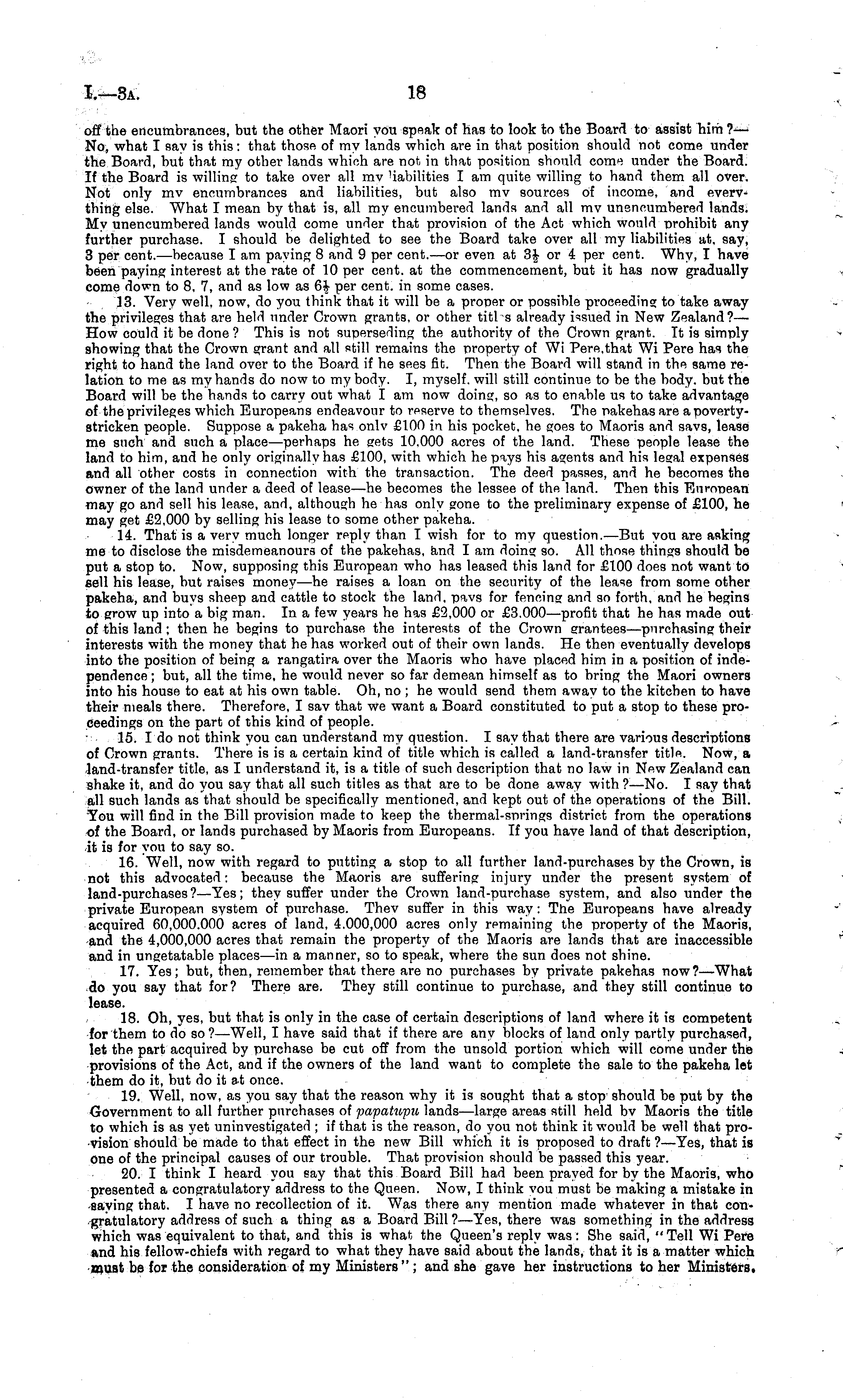 off the encumbrances, but the other Maori you speak of has to look to the Board to assist him ?— No, what I say is this: that those of my lands which are in that position should not come under the Board, but that my other lands which are not in that position should corns under the Board. If the Board is willing to take over all mv labilities I am quite willing to hand them all over. Not only mv encumbrances and liabilities, but also mv sources of income, and every* thing else. What I mean by that is, all my encumbered lands and all mv unencumbered lands. My unencumbered lands would come under that provision of the Act which wonld prohibit any further purchase. I should be delighted to see the Board take over all my liabilities at. say, 3 per cent.—because lam paying 8 and 9 per cent.—or even at or 4 per cent. Why, I have been paying interest at the rate of 10 per cent, at the commencement, but it has now gradually come down to 8, 7, and as low as 6£ per cent, in some cases. 13. Very well, now, do you think that it will be a proper or possible proceeding; to take away the privileges that are held under Crown grants, or other titl s already issued in New Zealand?— How could it be done ? This is not superseding the authority of the Crown grant. It is simply showing that the Crown grant and all still remains the property of Wi Pere.that Wi Pere has the right to hand the land over to the Board if he sees fit. Then the Board will stand in the same relation to me as my hands do now to my body. I, myself, will still continue to be the body, but the Board will be the hands to carry out what I am now doing, so as to enable us to take advantage of the privileges which Europeans endeavour to reserve to themselves. The pakehas are a povertystricken people. Suppose a pakeha has only £100 in his pocket, he goes to Maoris and says, lease me such and such a place—perhaps he gets 10.000 acres of the land. These people lease the land to him, and he only originally has £100, with which he pays his agents and his legal expenses and all other costs in connection with the transaction. The deed passes, and he becomes the owner of the land under a deed of lease—he becomes the lessee of the land. Then this European may go and sell his lease, and, although he has only gone to the preliminary expense of £100, lie may get £2,000 by selling his lease to some other pakeha. 14. That is a very much longer reply than I wish for to mv question.—But you are asking me to disclose the misdemeanours of the pakehas, and lam doing so. All those things should be put a stop to. Now, supposing this European who has leased this land for £100 does not want to sell his lease, but raises money—he raises a loan on the security of the lease from some other pakeha, and buys sheep and cattle to stock the land, pays for fencing and so forth, and he begins to grow up into a big man. In a few years he has £2,000 or £3.ooo—profit that he has made out of this land; then he begins to purchase the interests of the Crown grantees—purchasing their interests with the money that he has worked out of their own lands. He then eventually develops into the position of being a rangatira over the Maoris who have placed him in a position of independence ; but, all the time, he would never so far demean himself as to bring the Maori owners into his house to eat at his own table. Oh, no ; he would send them away to the kitchen to have their meals there. Therefore, I say that we want a Board constituted to put a stop to these proceedings on the part of this kind of people. 15. Ido not think you can understand my question. I say that there are various descriptions of Crown grants. There is is a certain kind of title which is called a land-transfer title. Now, a land-transfer title, as I understand it, is a title of such description that no law in New Zealand can shake it, and do you say that all such titles as that are to be done away with?— No. I say that all such lands as that should be specifically mentioned, and kept out of the operations of the Bill. You will find in the Bill provision made to keep the thermal-springs district from the operations of the Board, or lands purchased by Maoris from Europeans. If you have land of that description, it is for you to say so. 16. Well, now with regard to putting a stop to all further land-purchases by the Crown, is not this advocated: because the Maoris are suffering injury under the present system of land-purchases?— Yes; they suffer under the Crown land-purchase system, and also under the private European system of purchase. They suffer in this way: The Europeans have already acquired 60,000.000 acres of land, 4.000,000 acres only remaining the property of the Maoris, and the 4,000,000 acres that remain the property of the Maoris are lands that are inaccessible and in ungetatable places—in a manner, so to speak, where the sun does not shine. 17. Yes; but, then, remember that there are no purchases by private pakehas now?— What do you say that for? There are. They still continue to purchase, and they still continue to lease. 18. Oh, yes, but that is only in the case of certain descriptions of land where it is competent for them to do so?— Well, I have said that if there are any blocks of land only partly purchased, let the part acquired by purchase be cut off from the unsold portion which will come under the provisions of the Act, and if the owners of the land want to complete the sale to the pakeha let them do it, but do it at once. 19. Well, now, as you say that the reason why it is sought that a stop should be put by the Government to all further purchases of papatupu lands—large areas still held by Maoris the title to which is as yet uninvestigated ; if that is the reason, do you not think it would be well that provision should be made to that effect in the new Bill which it is proposed to draft ?—Yes, that is One of the principal causes of our trouble. That provision 