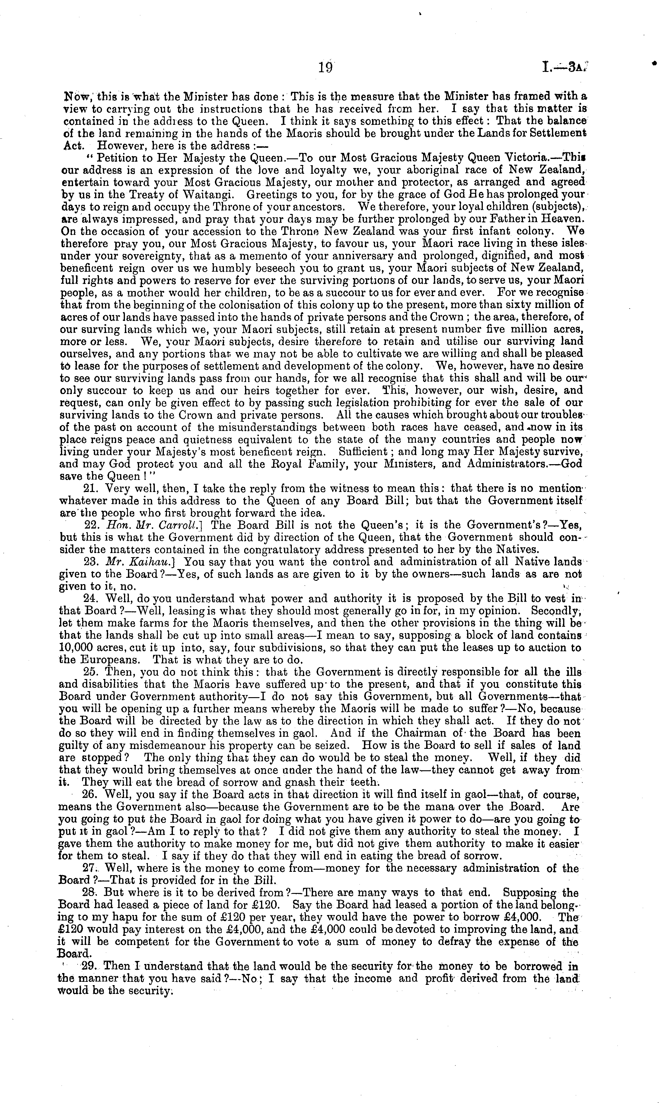 Now, this is what the Minister has done : This is the measure that the Minister has framed with a view to carrying out the instructions that he has received frcm her. I say that this matter is contained in the address to the Queen. I think it says something to this effect: That the balance of the land remaining in the hands of the Maoris should be brought under the Lands for Settlement Act. However, here is the address :— " Petition to Her Majesty the Queen. —To our Most Gracious Majesty Queen Victoria.—Thie our address is an expression of the love and loyalty we, your aboriginal race of New Zealand, entertain toward your Most Gracious Majesty, our mother and protector, as arranged and agreed by us in the Treaty of Waitangi. Greetings to you, for by the grace of God He has prolonged your days to reign and occupy the Throne of your ancestors. We therefore, your loyal children (subjects), are always impressed, and pray that your days may be further prolonged by our Father in Heaven. On the occasion of your accession to the Throne New Zealand was your first infant colony. We therefore pray you, our Most Gracious Majesty, to favour us, your Maori race living in these islesunder your sovereignty, that as a memento of your anniversary and prolonged, dignified, and most beneficent reign over us we humbly beseech you to grant us, your Maori subjects of New Zealand, full rights and powers to reserve for ever the surviving portions of our lands, to serve us, your Maori people, as a mother would her children, to be as a succour to us for ever and ever. For we recognise that from the beginning of the colonisation of this colony up to the present, more than sixty million of acres of our lands have passed into the hands of private persons and the Crown ; the area, therefore, of our surving lands which we, your Maori subjects, still retain at present number five million acres, more or less. We, your Maori subjects, desire therefore to retain and utilise our surviving land ourselves, and any portions that, we may not be able to cultivate we are willing and shall be pleased tb lease for the purposes of settlement and development of the colony. We, however, have no desire to see our surviving lands pass from our hands, for we all recognise that this shall and will be our' only succour to keep us and our heirs together for ever. This, however, our wish, desire, and request, can only be given effect to by passing such legislation prohibiting for ever the sale of our surviving lands to the Crown and private persons. All the causes which brought about our troubles of the past on account of the misunderstandings between both races have ceased, and .now in its place reigns peace and quietness equivalent to the state of the many countries and people now living under your Majesty's most beneficent reign. Sufficient; and long may Her Majesty survive, and may God protect you and all the Royal Family, your Ministers, and Administrators.—God save the Queen! " 21. Very well, then, I take the reply from the witness to mean this : that there is no mention , whatever made in this address to the Queen of any Board Bill; but that the Government itself are the people who first brought forward the idea. 22. Hon. Mr. Carroll.] The Board Bill is not the Queen's; it is the Government's?— Yes, but this is what the Government did by direction of the Queen, that the Government should con- ■ sider the matters contained in the congratulatory address presented to her by the Natives. 23. Mr. Kaihau.] You say that you want the control and administration of all Native lands given to the Board ?—Yes, of such lands as are given to it by the owners—such lands as are not given to it, no. >.: 24. Well, do you understand what power and authority it is proposed by the Bill to vest in that Board ?—Well, leasing is what they should most generally go in for, in my opinion. Secondly, let them make farms for the Maoris themselves, and then the other provisions in the thing will be ■ that the lands shall be cut up into small areas —I mean to say, supposing a block of land contains 10,000 acres, cut it up into, say, four subdivisions, so that they can put the leases up to auction to the Europeans. That is what they are to do. 25. Then, you do not think this : that the Government is directly responsible for all the ills and disabilities that the Maoris have suffered vp■ to the present, and that if you constitute this Board under Government authority —I do not say this Government, but all Governments—that you will be opening up a further means whereby the Maoris will be made to suffer ? —No, because the Board will be directed by the law as to the direction in which they shall act. If they do not do so they will end in finding themselves in gaol. And if the Chairman of-the Board has been guilty of any misdemeanour his property can be seized. How is the Board to sell if sales of land are stopped ? The only thing that they can do would be to steal the money. Well, if they did that they would bring themselves at once under the hand of the law—they cannot get away from it. They will eat the bread of sorrow and gnash their teeth. 26. Well, you say if the Board acts in that direction it will find itself in gaol—that, of course, means the Government also —because the Government are to be the mana over the Board. Are you going to put the Board in gaol for doing what you have given it power to do—are you going to put it in gaol ?—Am Ito reply to that ? I did not give them any authority to steal the money. I gave them the authority to make money for me, but did not give them authority to make it easier for them to steal. I say if they do that they will end in eating the bread of sorrow. 27. Well, where is the money to come from—money for the necessary administration of the Board ?—That is provided for in the Bill. 28. But where is it to be derived from ?—There are many ways to that end. Supposing the Board had leased 