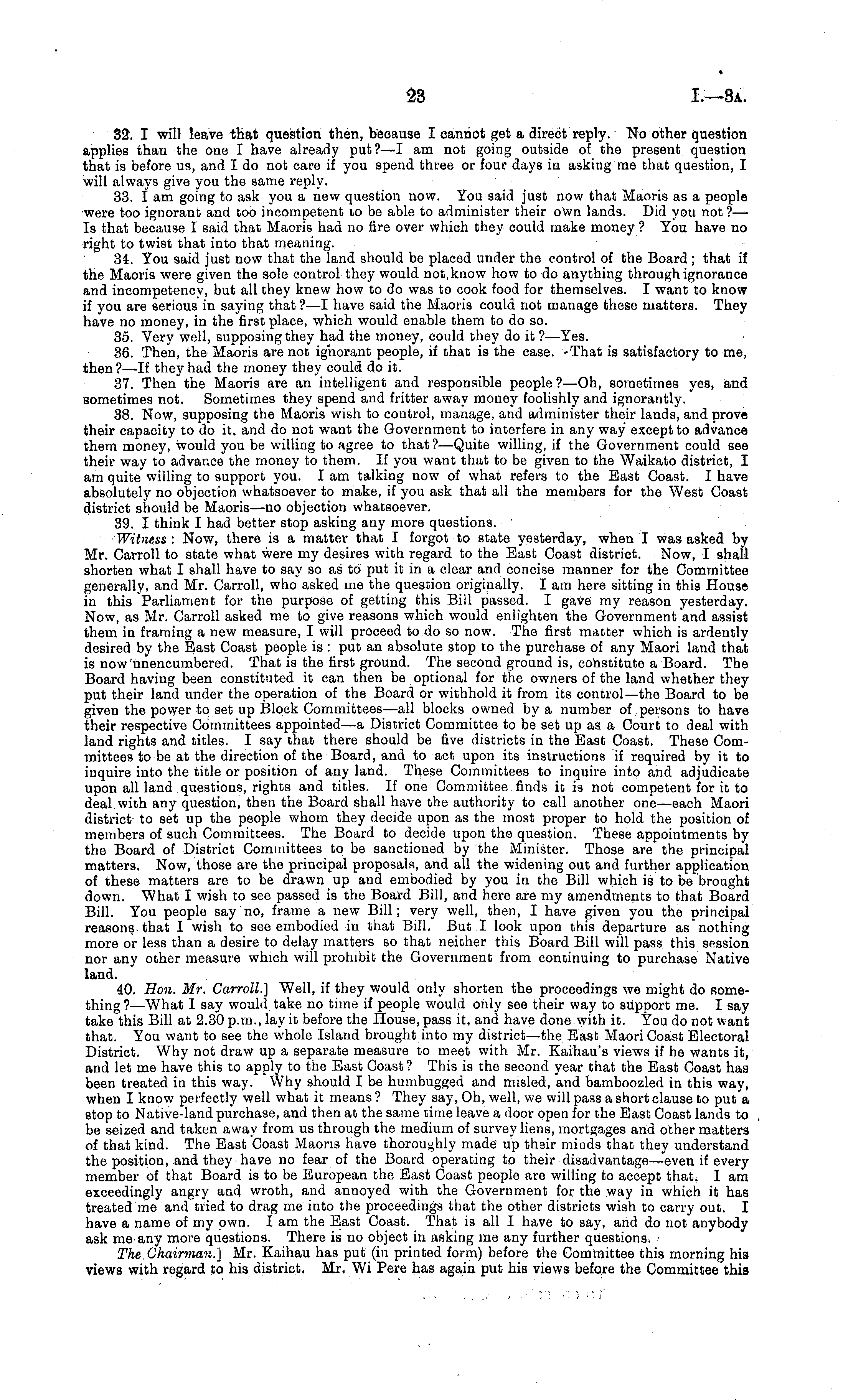 32. I will leave that question then, because I cannot get a direct reply. No other question applies than the one I have already put?—l am not going outside of the present question that is before us, and I do not care if you spend three or four days in asking me that question, I will always give you the same reply. 33. lam going to ask you a new question now. You said just now that Maoris as a people were too ignorant and too incompetent to be able to administer their own lands. Did you not ?— Is that because I said that Maoris had no fire over which they could make money ? You have no right to twist that into that meaning. 34. You said just now that the land should be placed under the control of the Board ; that if the Maoris were given the sole control they would not know how to do anything through ignorance and incompetency, but all they knew how to do was to cook food for themselves. I want to know if you are serious in saying that ? —I have said the Maoris could not manage these matters. They have no money, in the first place, which would enable them to do so. 35. Very well, supposing they had the money, could they do it ?—Yes. 36. Then, the Maoris are not ignorant people, if that is the case. -That is satisfactory to me, then ?—lf they had the money they could do it. 37. Then the Maoris are an intelligent and responsible people ?—Oh, sometimes yes, and sometimes not. Sometimes they spend and fritter away money foolishly and ignorantly. 38. Now, supposing the Maoris wish to control, manage, and administer their lands, and prove their capacity to do it, and do not want the Government to interfere in any way except to advance them money, would you be willing to agree to that?— Quite willing, if the Government could see their way to advance the money to them. If you want that to be given to the Waikato district, I am quite willing to support you. lam talking now of what refers to the East Coast. I have absolutely no objection whatsoever to make, if you ask that all the members for the West Coast district should be Maoris—no objection whatsoever. 39. I think I had better stop asking any more questions. Witness : Now, there is a matter that I forgot to state yesterday, when I was asked by Mr. Carroll to state what were my desires with regard to the East Coast district. Now, I shall shorten what I shall have to say so as to put it in a clear and concise manner for the Committee generally, and Mr. Carroll, who asked me the question originally. lam here sitting in this House in this Parliament for the purpose of getting this Bill passed. I gave my reason yesterday. Now, as Mr. Carroll asked me to give reasons which would enlighten the Government and assist them in framing a new measure, I will proceed to do so now. The first matter which is ardently desired by the East Coast people is : put an absolute stop to the purchase of any Maori land that is now unencumbered. That is the first ground. The second ground is, constitute a Board. The Board having been constituted it can then be optional for the owners of the land whether they put their land under the operation of the Board or withhold it from its control—the Board to be given the power to set up Block Committees—all blocks owned by a number of persons to have their respective Committees appointed—a District Committee to be set up as a Court to deal with land rights and titles. I say that there should be five districts in the East Coast. These Committees to be at the direction of the Board, and to act upon its instructions if required by it to inquire into the title or position of any land. These Committees to inquire into and adjudicate upon all land questions, rights and titles. If one Committee finds ie is not competent for it to deal.with any question, then the Board shall have the authority to call another one—each Maori district to set up the people whom they decide upon as the most proper to hold the position of members of such Committees. The Board to decide upon the question. These appointments by the Board of District Committees to be sanctioned by the Minister. Those are the principal matters. Now, those are the principal proposals, and all the widening out and further application of these matters are to be drawn up and embodied by you in the Bill which is to be brought down. What I wish to see passed is the Board Bill, and here are my amendments to that Board Bill. You people say no, frame a new Bill; very well, then, I have given you the principal reasons that I wish to see embodied in that Bill. But I look upon this departure as nothing more or less than a desire to delay matters so that neither this Board Bill will pass this session nor any other measure which will prohibit the Government from continuing to purchase Native land. 40. Hon. Mr. Carroll.] Well, if they would only shorten the proceedings we might do something ? —What I say would take no time if people would only see their way to support me. I say take this Bill at 2.30 p.m., lay it before the House, pass it, and have done with it. You do not want that. You want to see the whole Island brought into my district—the East Maori Coast Electoral District. Why not draw up a separate measure to meet with Mr. Kaihau's views if he wants it, and let me have this to apply to the East Coast? This is the second year that the East Coast has been treated in this way. Why should Ibe humbugged and misled, and bamboozled in this way, when I know perfectly well what it means ? They say, Oh, well, we will pass a short clause to put a stop to Native-land purchase, and then at the same time leave a door open for the East Coast lands to be seized and taken away from us through the medium of survey liens, mortgages and other matters of that kind. The East Coast Maoris have thoroughly made up thsir minds that they understand the position, and they have no fear of the Board operating to their disadvantage—even if every member of that Board is to be European th