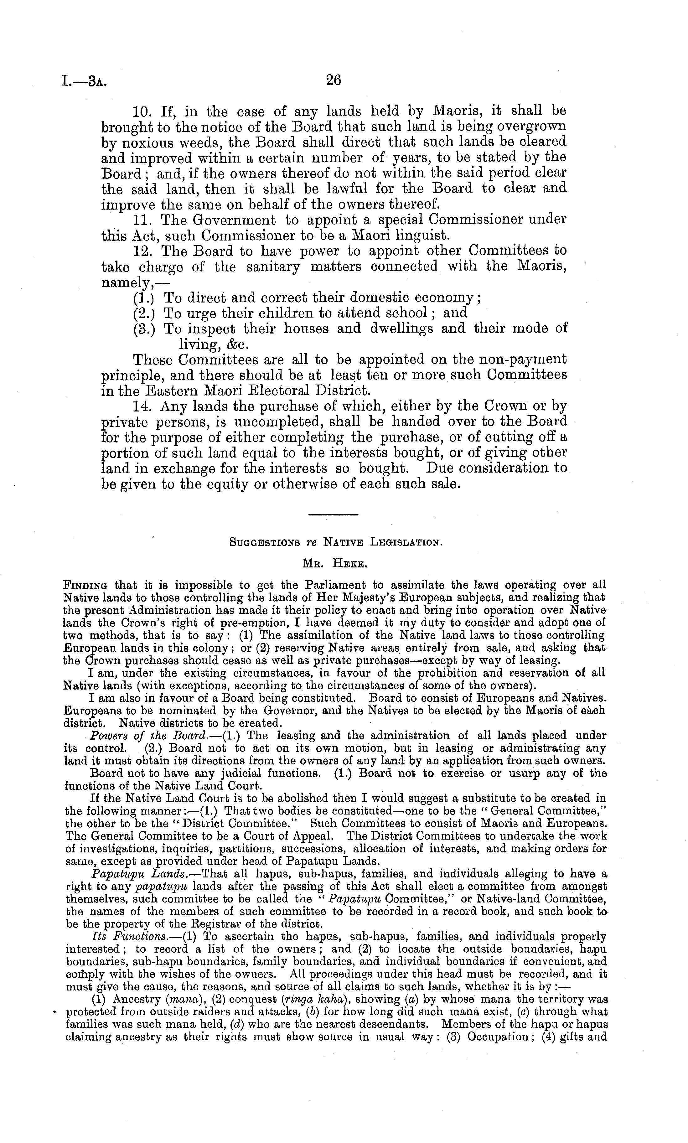 Suggestions re Native Legislation. Me. Heke. Finding that it is impossible to get the Parliament to assimilate the laws operating over all Native lands to those controlling the lands of Her Majesty's European subjects, and realizing that the present Administration has made it their policy to enact and bring into operation over Native lands the Crown's right of pre-emption, I have deemed it my duty to consider and adopt one of two methods, that is to say : (1) The assimilation of the Native land laws to those controlling European lands in this colony; or (2) reserving Native areas entirely from sale, and asking that the Crown purchases should cease as well as private purchases—except by way of leasing. I am, under the existing circumstances, in favour of the prohibition and reservation of all Native lands (with exceptions, according to the circumstances of some of the owners). lam also in favour of a Board being constituted. Board to consist of Europeans and Natives. Europeans to be nominated by the Governor, and the Natives to be elected by the Maoris of each district. Native districts to be created. Powers of the Board. —(1.) The leasing and the administration of all lands placed under its control. (2.) Board not to act on its own motion, but in leasing or administrating any land it must obtain its directions from the owners of any land by an application from such owners. Board not to have any judicial functions. (1.) Board not to exercise or usurp any of the functions of the Native Land Court. If the Native Land Court is to be abolished then I would suggest a substitute to be created in the following manner:—(l.) That two bodies be constituted—one to be the " General Committee," the other to be the " District Committee." Such Committees to consist of Maoris and Europeans. The General Committee to be a Court of Appeal. The District Committees to undertake the work of investigations, inquiries, partitions, successions, allocation of interests, and making orders for same, except as provided under head of Papatupu Lands. Papatupu Lands. —That all hapus, sub-hapus, families, and individuals alleging to have a right to any papatupu lands after the passing of this Act shall elect a committee from amongst themselves, such committee to be called the "Papatupu Committee," or Native-land Committee, the names of the members of such committee to be recorded in a record book, and such book to be the property of the Begistrar of the district. Its Functions. —(l) To ascertain the hapus, sub-hapus, families, and individuals properly interested; to record a list of the owners; and (2) to locate the outside boundaries, hapu boundaries, sub-hapu boundaries, family boundaries, and individual boundaries if convenient, and comply with the wishes of the owners. All proceedings under this head must be recorded, and it must give the cause, the reasons, and source of all claims to such lands, whether it is by : — (1) Ancestry (mana), (2) conquest (ringa kaha), showing (a) by whose mana the territory was protected from outside raiders and attacks, (6). for how long did such mana exist, (c) through what families was such mana held, (d) who are the nearest descendants. Members of the hapu or hapus claiming ancestry as their rights must show source in usual way: (3) Occupation; (4) gifts and
