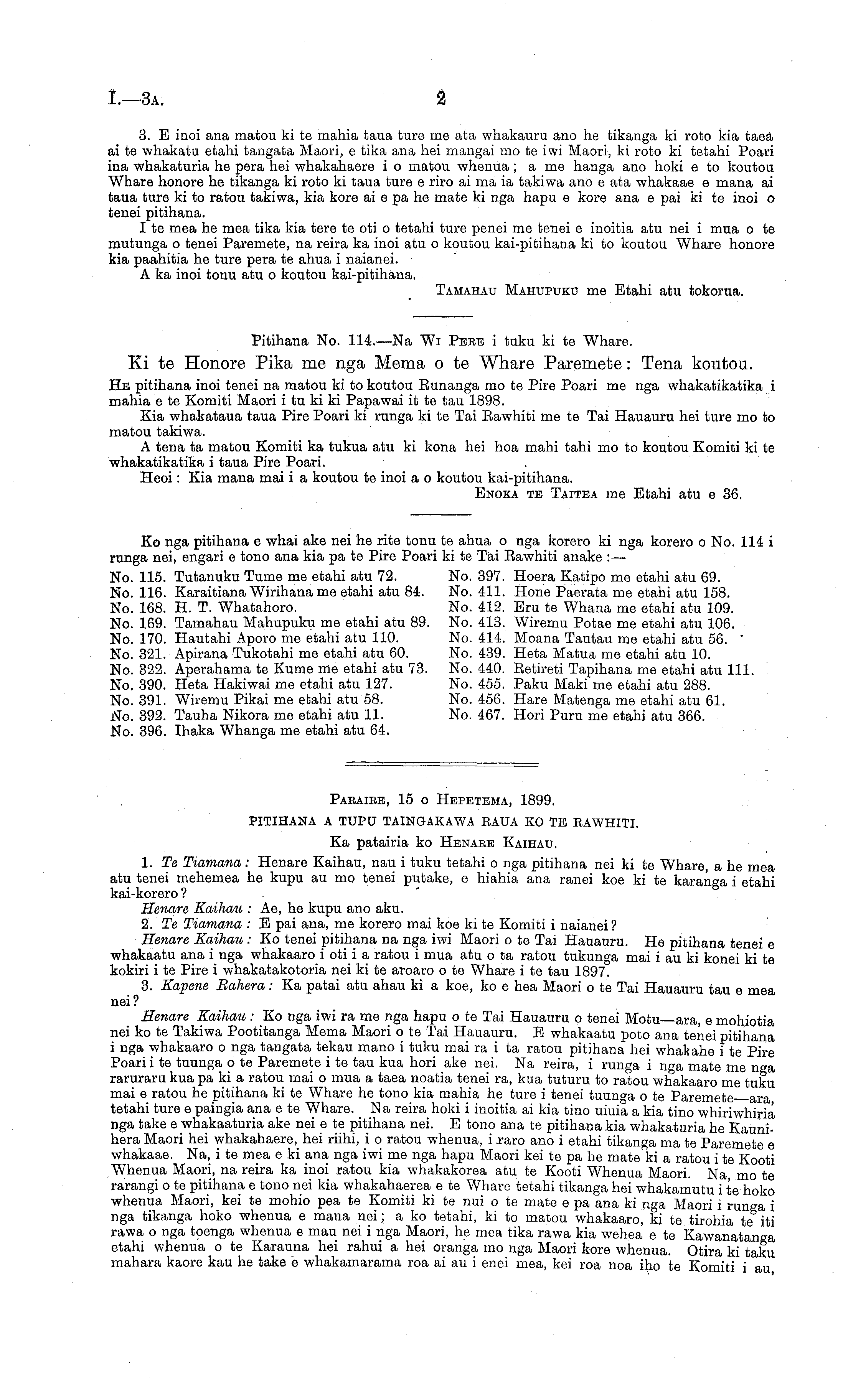 Pitihana No. 114.—Na Wi Pere i tuku kite Whare. Xi te Honore Pika me nga Mema o te Whare Paremete: Tena koutou. Hβ pitihana inoi tenei na matou ki to koutou Eunanga mo te Pire Poari me nga whakatikatika i mahia c te Komiti Maori i tv ki ki Papawai it te tau 1898. Kia whakataua taua Pire Poari ki runga kite Tai Eawhiti me te Tai Hauauru hei ture mo to matou takiwa. A tena ta matou Komiti ka tukua atu ki kona hei hoa mahi tahi mo to koutou Komiti kite whakatikatika i taua Pire Poari. Heoi: Kia mana mai i a koutou te inoi a o koutou kai-pitihana. Enoka te Taitea me Etahi atu c 36.