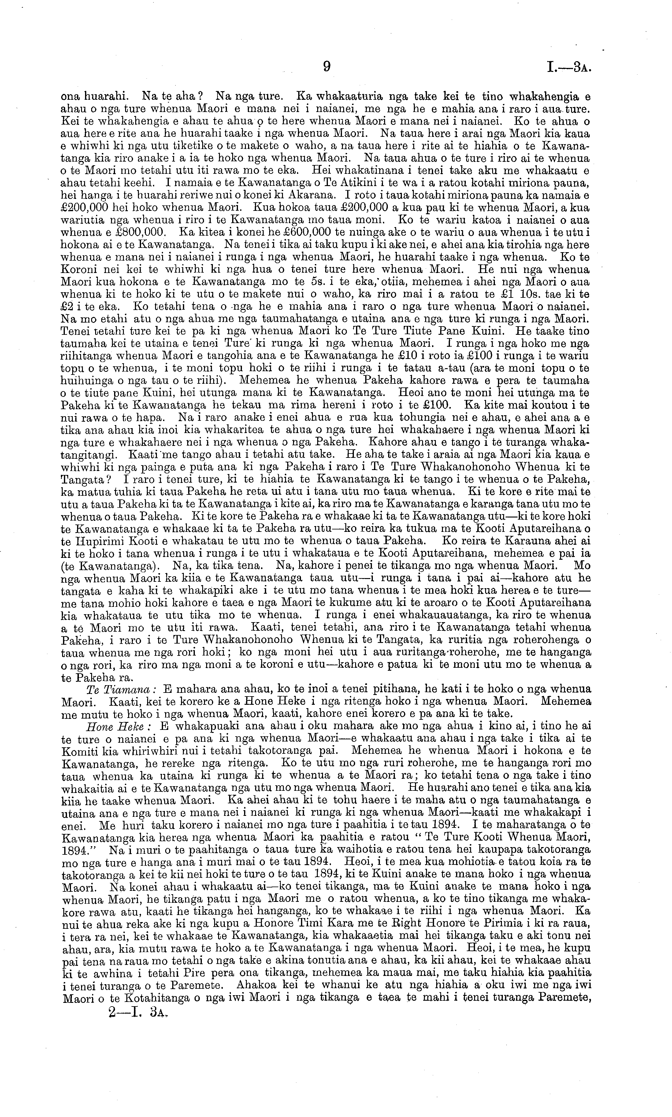 ona huarahi. Na te aha ? Na nga ture. Ka whakaaturia nga take kei te tino whakahengia c ahau o nga ture whenua Maori c mana nei i naianei, me nga he c mahia ana i raro i aua ture. Kei te whakahengia c ahau te ahua ote here whenua Maori c mana nei i naianei. Ko te ahua o aua here c rite ana he huarahi taake i nga whenua Maori. Na taua here i arai nga Maori kia kaua c whiwhi ki nga utu tiketike o te makete o waho, a na taua here i rite ai te hiahia o te Kawanatanga kia riro anake iaia te hoko nga whenua Maori. Na taua ahua ote ture i riro ai te whenua ote Maori mo tetahi utu iti rawa mo te eka. Hei whakatinana i tenei take aku me whakaatu c ahau tetahi keehi. I namaia etc Kawanatanga oTe Atikini itewa i a ratou kotahi miriona pauna, hei hanga i fee huarahi reriwe nui o konei ki Akarana. I roto i taua kotahi miriona pauna ka namaia c £200,000 hei hoko whenua Maori. Kua hokoa taua £200,000 a kua pau kite whenua Maori, a kua wariutia nga whenua i riro ite Kawanatanga mo taua moni. Ko te wariu katoa i naianei o aua whenua c £800,000. Ka kitea i konei he £600,000 te nuinga ake ote wariu o aua whenua ite utu i hokona ai etc Kawanatanga. Na tenei i tika ai taku kupu iki ake nei, c ahei ana kia tirohia nga here whenua c mana nei i naianei i runga i nga whenua Maori, he huarahi taake i nga whenua. Ko te Koroni nei kei te whiwhi ki nga hua o tenei ture here whenua Maori. He nui nga whenua Maori kua hokona c te Kawanatanga mo te ss. i te eka," otiia, mehemea i ahei nga Maori o aua whenua kite hoko kite utu ote makete nui o waho, ka riro mai i a ratou te £1 10s. tae kite £2 ite eka. Ko tetahi tena o nga he c mahia ana i raro o nga ture whenua Maori o naianei. Na mo etahi atu o nga ahua me nga taumahatanga c utaina ana c nga ture ki runga i nga Maori. Tenei tetahi ture kei. te pa ki nga whenua Maori ko Te Ture Tiute Pane Kuini. He taake tino taumaha kei te utaina c tenei Ture' ki runga ki nga whenua Maori. I runga i nga hoko me nga riihitanga whenua Maori c tangohia ana c te Kawanatanga he £10 i roto ia £100 i runga i te wariu topu o te whenua, i te moni topu hoki o te riihi i runga i te tatau a-tau (ara te moni topu o te huihuinga o nga tau ote riihi). Mehemea he whenua Pakeha kahore rawa c pera te taumaha ote tiute pane Kuini, hei utunga mana kite Kawanatanga. Heoi ano te moni hei utunga ma te Pakeha kite Kawanatanga he tekau ma rima hereni i roto ite £100. Ka kite mai koutou ite nui rawa ote hapa. Na i raro anake i enei ahua c rua kua tohungia nei c ahau, c ahei ana a c tika ana ahau kia inoi kia whakaritea te ahua o nga ture hei whakahaere i nga whenua Maori ki nga ture c whakahaere nei i nga whenua o nga Pakeha. Kahore ahau c tango ite turanga whakatangitangi. Kaati me tango ahau i tetahi atu take. He aha te take i araia ai nga Maori kia kaua c whiwhi ki nga painga c puta ana ki nga Pakeha i raro i Te Ture Whakanohonoho Whenua kite Tangata? I raro i tenei ture, kite hiahia te Kawanatanga kite tango ite whenua ote Pakeha, ka matua tuhia ki taua Pakeha he reta vi atu i tana utu mo taua whenua. Xi te kore c rite mai te utu a taua Pakeha ki ta te Kawanatanga i kite ai, ka riro ma te Kawanatanga c karanga tana utu mo te whenua o taua Pakeha. Xi te kore te Pakeha ra c whakaae ki ta te Kawanatanga utu—ki te kore hoki te Kawanatanga c whakaae ki ta te Pakeha ra utu —ko reira ka tukua ma te Kooti Aputareihana o te Hupirimi Kooti c whakatau te utu mo te whenua o taua Pakeha. Ko reira te Karauna ahei ai kite hoko i tana whenua i runga ite utu i whakataua cte Kooti Aputareihana, mehemea c pai ia (te Kawanatanga). Na, ka tika tena. Na, kahore i penei te tikanga mo nga whenua Maori. Mo nga whenua Maori ka kiia etc Kawanatanga taua utu —i runga i tana i pai ai—kahore atu he tangata c kaha kite whakapiki ake ite utu mo tana whenua ite mea hoki kua herea cte ture— me tana mohio hoki kahore c taea c nga Maori te kukume atu kite aroaro ote Kooti Aputareihana kia whakataua te utu tika mo te whenua. I runga i enei whakauauatanga, ka riro te whenua ate Maori mo te utu iti rawa. Kaati, tenei tetahi, ana riro ite Kawanatanga tetahi whenua Pakeha, i raro ite Ture Whakanohonoho Whenua kite Tangata, ka ruritia nga roherohenga o taua whenua me nga rori hoki; ko nga moni hei utu i aua ruritanga roherohe, me te hanganga 0 nga rori, ka riro ma nga moni ate koroni c utu—kahore c patua kite moni utu mo te whenua a te Pakeha ra. Te Tiamana: B mahara ana ahau, ko te inoi a tenei pitihana, he kati ite hoko o nga whenua Maori. Kaati, kei te korero ke a Hone Heke i nga ritenga hoko i nga whenua Maori. Mehemea me mutu te hoko i nga whenua Maori, kaati, kahore enei korero cpa ana kite take. Hone Heke : E whakapuaki ana ahau i oku mahara ake mo nga ahua i kino ai, i tino he ai te ture o naianei epa ana ki nga whenua Maori—c whakaatu ana ahau i nga take i tika ai te Komiti kia whiriwhiri nui i tetahi takotoranga pai. Mehemea he whenua Maori i hokona c te Kawanatanga, he rereke nga ritenga. Ko te utu mo nga ruri roherohe, me te hanganga rori mo taua whenua ka utaina ki runga kite whenua ate Maori ra; ko tetahi tena o nga take i tino whakaitia ai etc Kawanatanga nga utu mo nga whenua Maori. He huarahi ano tenei c tika ana kia kiia he taake whenua Maori. Ka ahei ahau kite tohu haere ite maha atu o nga taumahatanga c utaina ana c nga ture c mana nei i naianei ki runga ki nga whenua Maori—kaati me whakakapi i enei. Me huri taku korero i naianei mo nga ture i paahitia ite tau 1894. Ite maharatanga ote Kawanatanga kia herea nga whenua Maori ka paahitia c ratou " Te Ture Kooti Whenua Maori, 1894." Na i muri ote paahitanga o taua ture ka waihotia c ratou tena hei kaupapa takotoranga mo nga ture c hanga ana i muri mai ote tau 1894. Heoi, ite mea kua mohiotia c tatou koia rate takotoranga a kei te kii nei hoki te ture ote tau 1894, kite Kuini anake te mana hoko i nga whenua Maori. Na konei ahau i whakaatu ai—ko tenei tikanga, ma te Kuini anake te mana hoko i nga whenua Maori, he tikanga patu i nga Maori me o ratou whenua, 